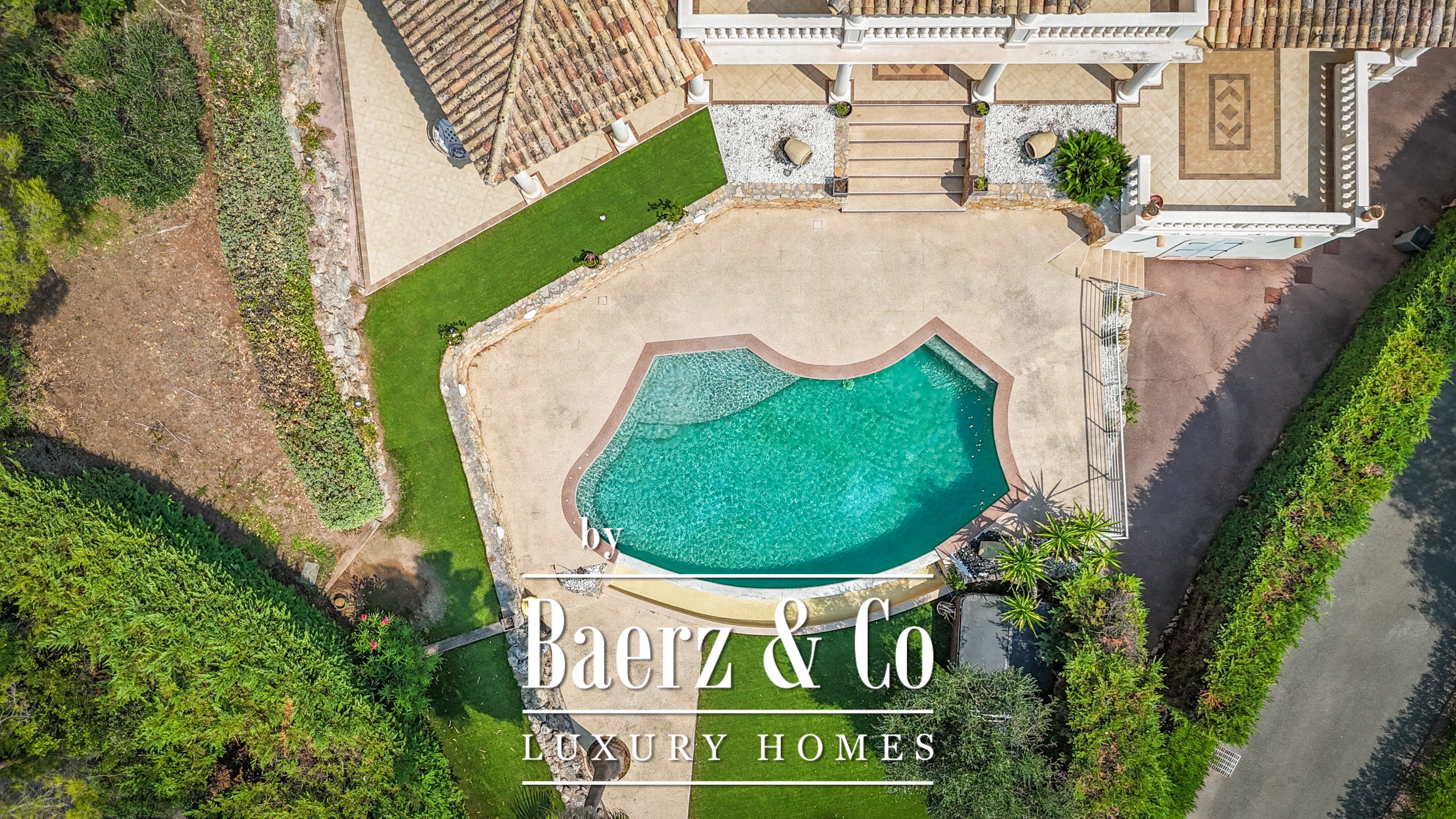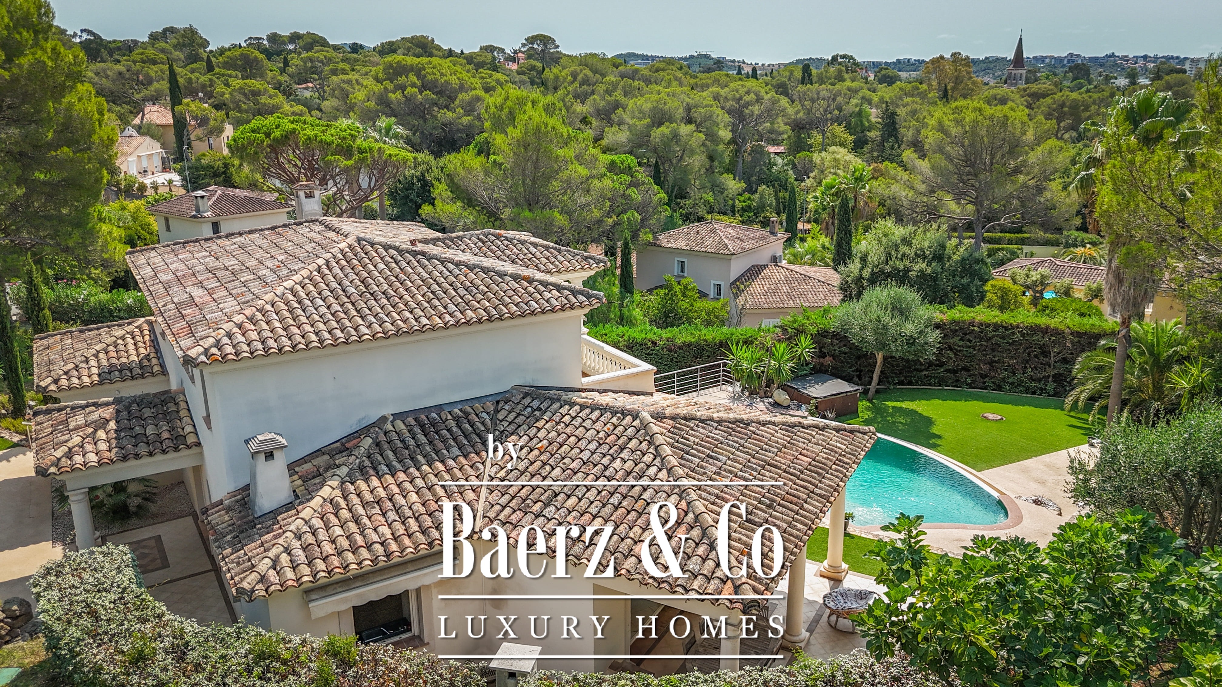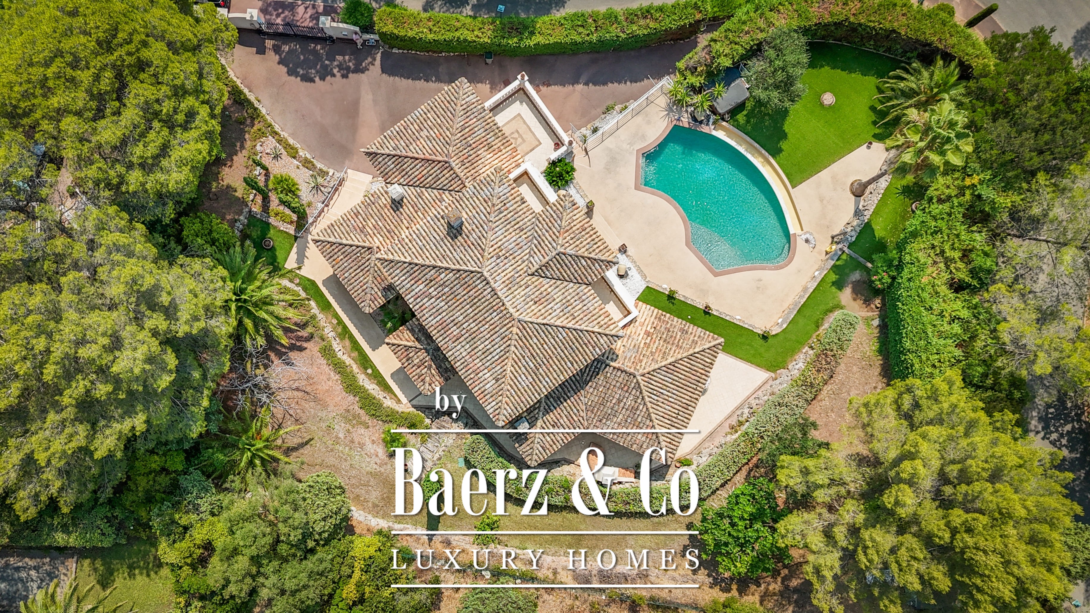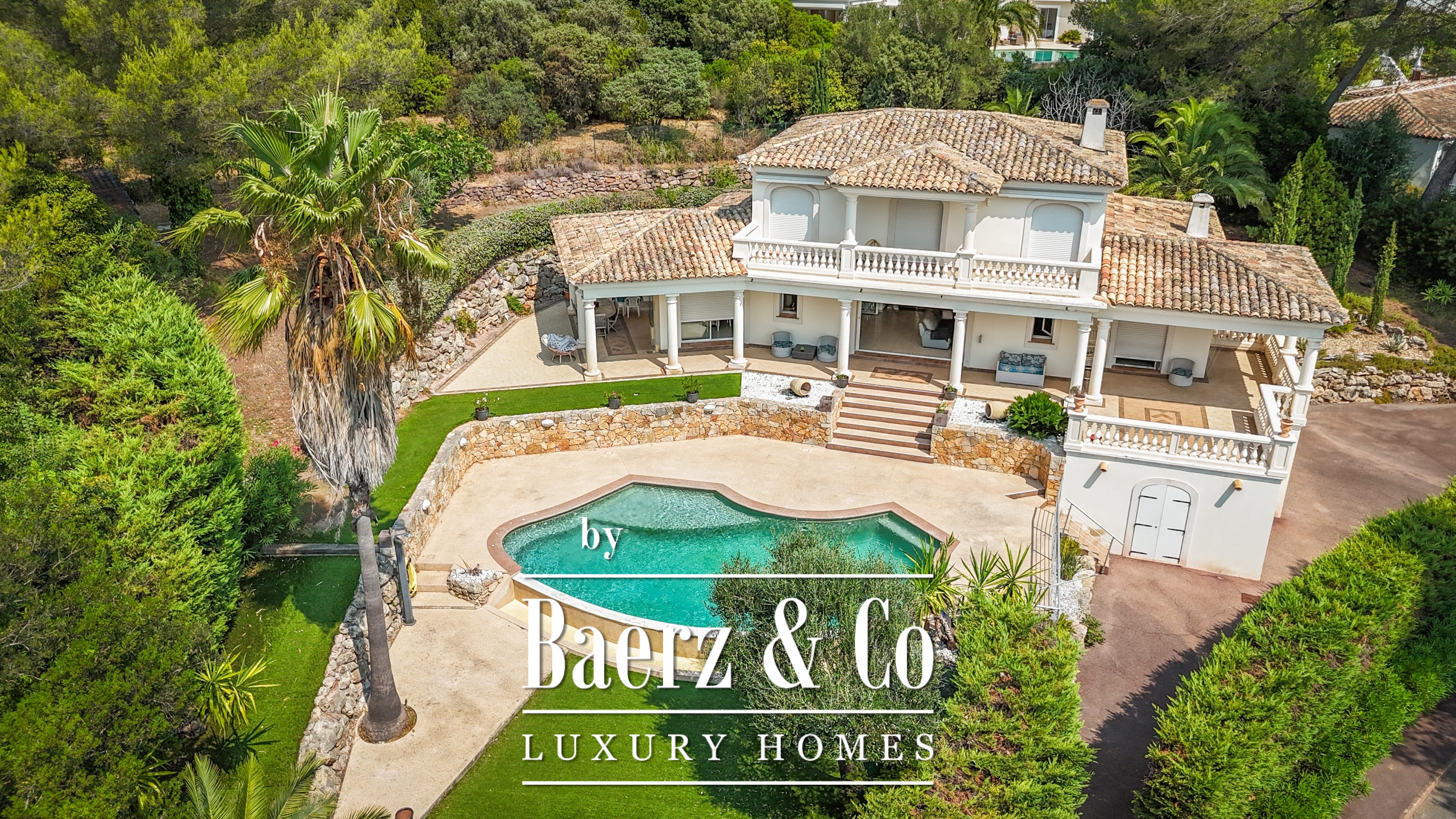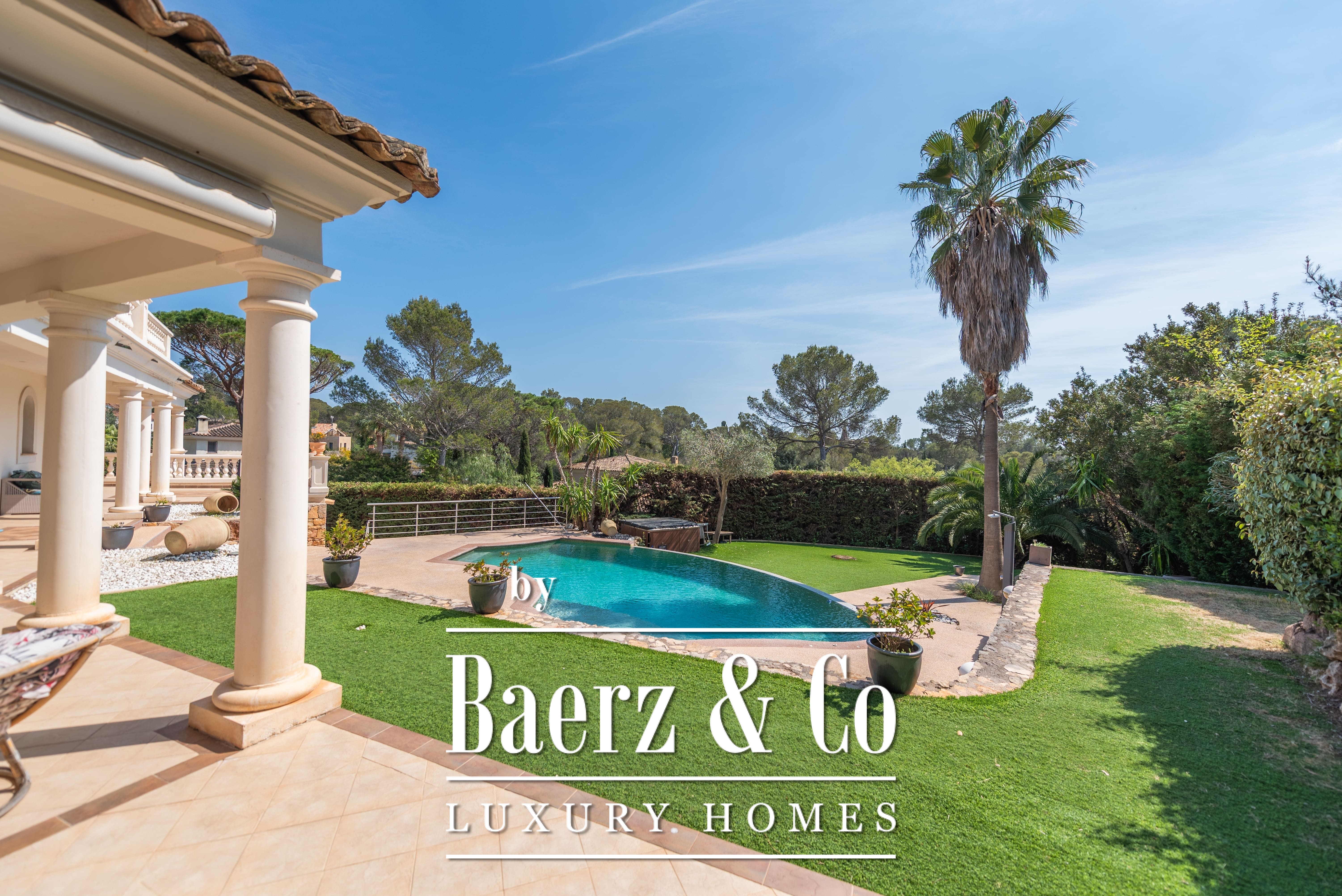 The 1,511 m² landscaped plot surrounds the home with mature gardens, multiple terraces, and an infinity pool. On the lower level, find a games room, double garage, and utility spaces. Features such as aluminum frames, central electric shutters, alarm, video surveillance, and electric gate enhance peace of mind.