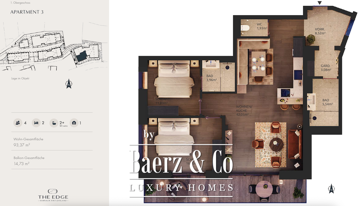 The Edge 1734 integrates direct ski-in, ski-out access to the Silvretta Arena slopes with a suite of lifestyle amenities, including spa and wellness areas with saunas and dedicated spaces for quiet relaxation. Residents enjoy services of a luxury hotel, from daily breakfast and a refined bar to dedicated concierge support. An underground car park and private storage ensure practical ease year-round.