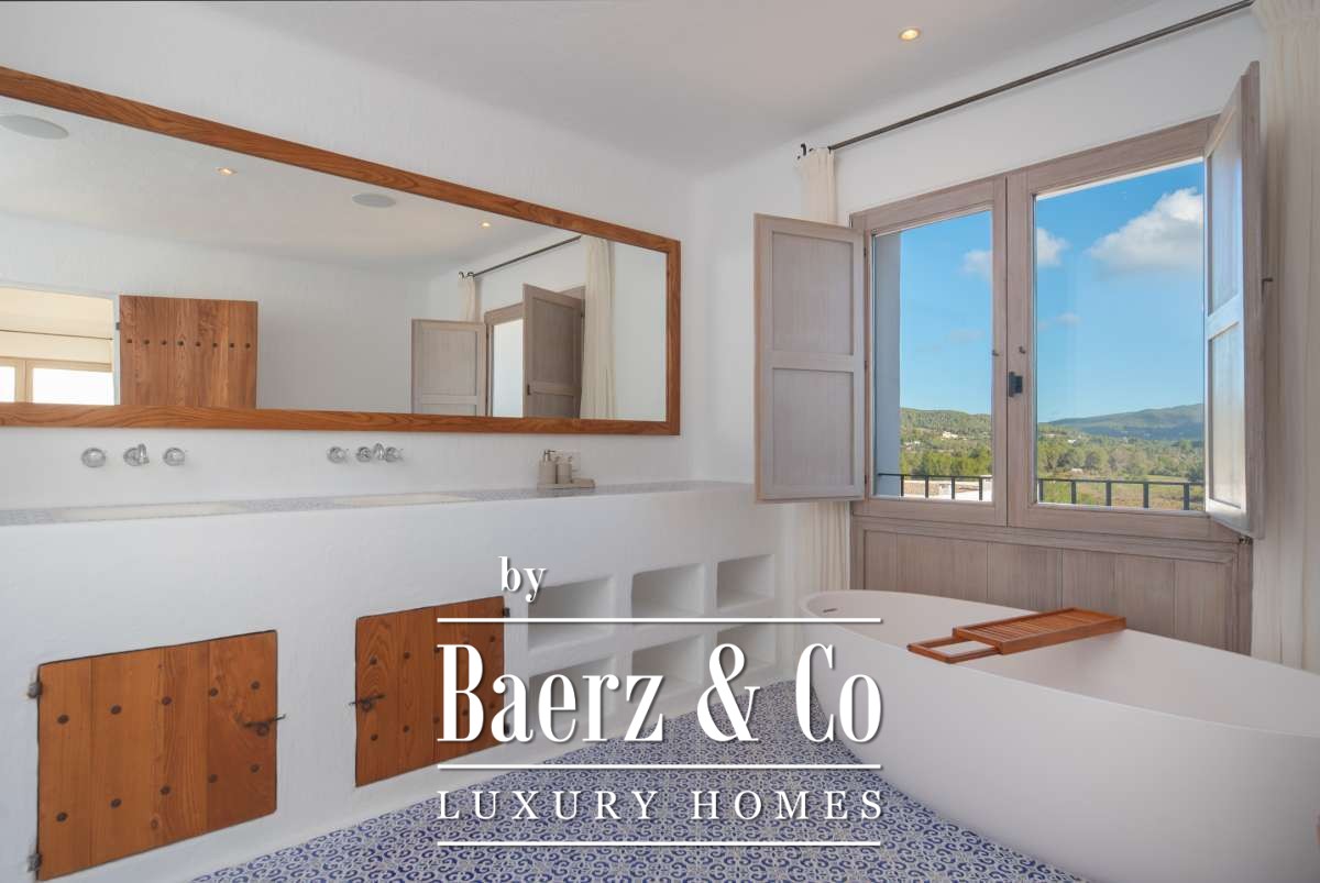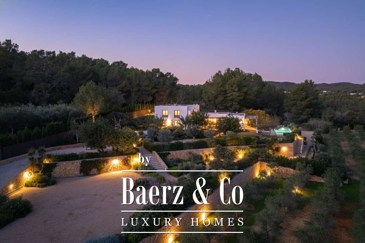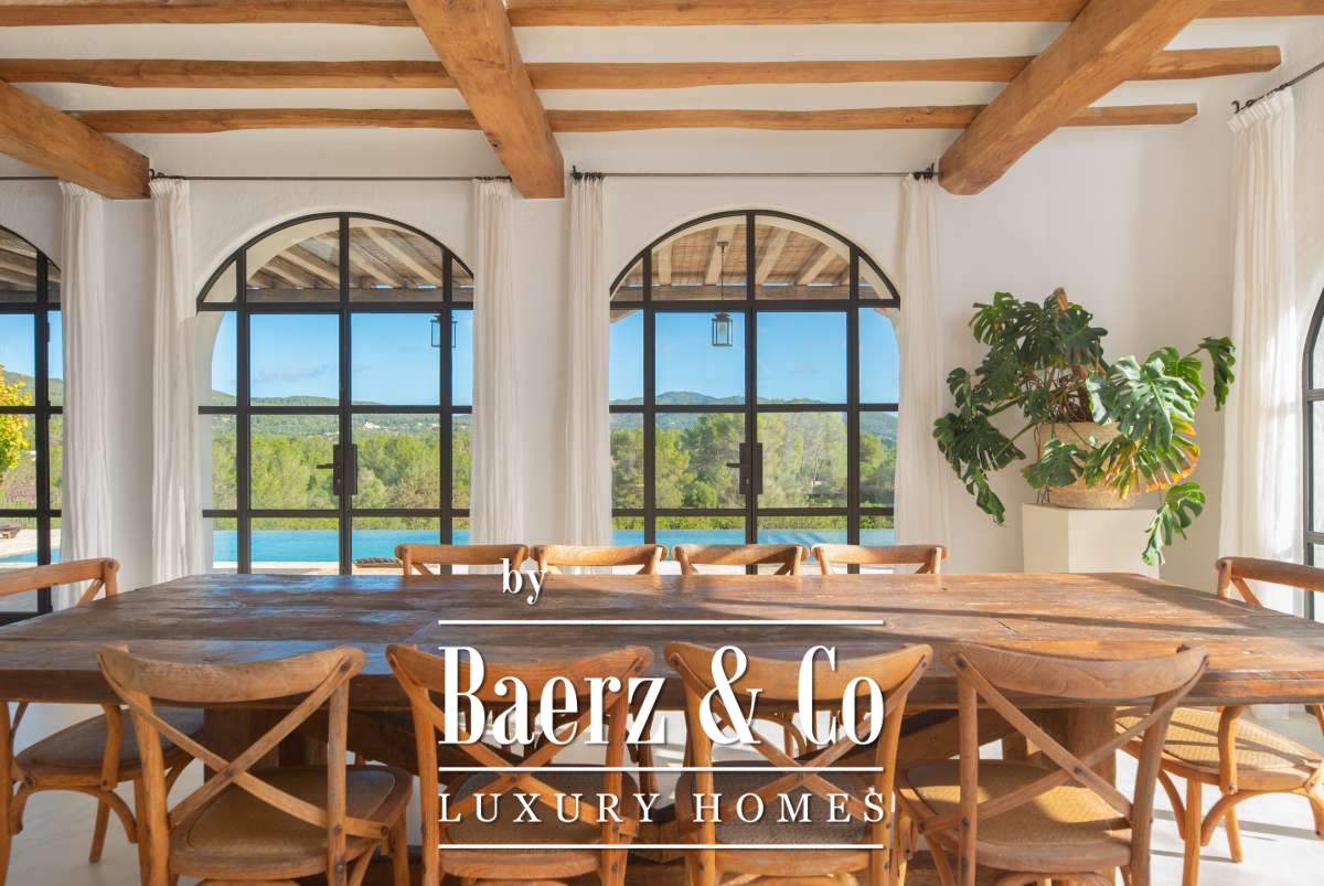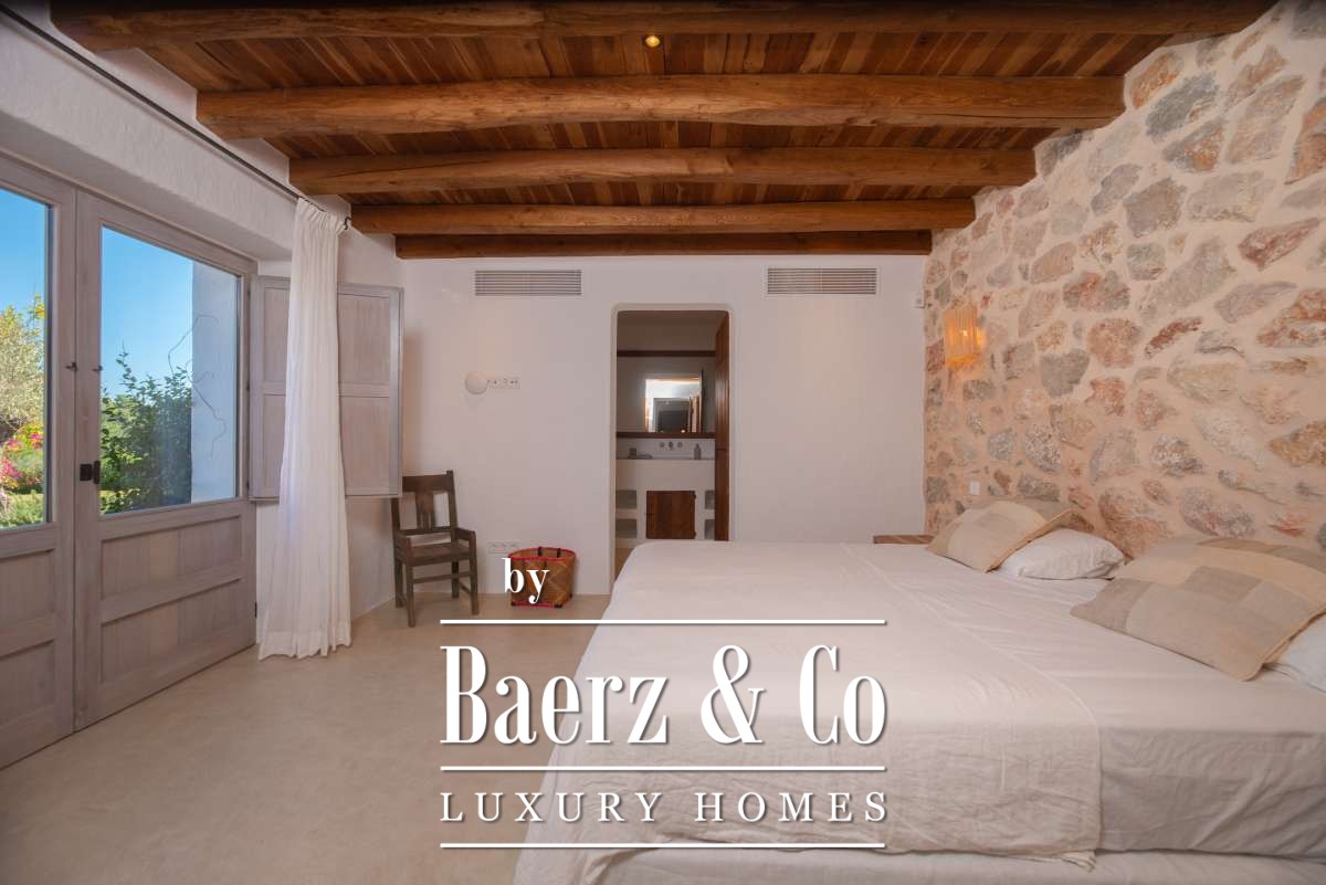 This farmhouse Sant Llorenç de Balàfia resides at the island’s highest valley point, where rolling agricultural land meets forest and mountain views. The property’s terraces open onto a tapestry of olive groves and fruit trees, with vistas extending to the church tower of Balafí and historic walls in the far distance. On the opposite side, the springs of San Rafael bring freshness to the landscape, softening the horizon. Quiet and privacy envelope this 24,215 m² estate, though Eivissa and Santa Gertrudis remain easily within reach.