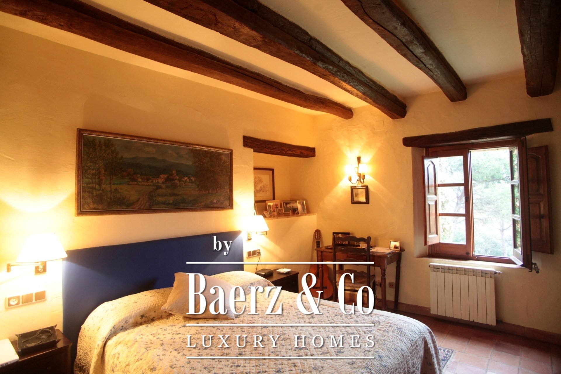 Composed across 513 m² of built space, the residence retains its original beamed ceilings, traditional stoneware floors, and a harmonious mix of whitewashed walls and natural stone. Its arrangement spans nine bedrooms and six bathrooms, flowing through three distinct kitchens, three living rooms, a dining room, and a dedicated office. This flexible configuration invites both family life and quiet retreat, or a sophisticated hospitality project reflecting true Catalan spirit.