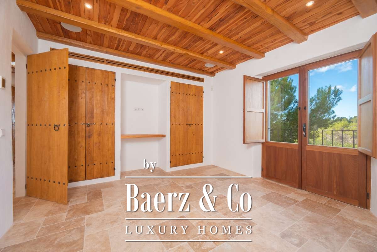 Outside, the finca’s design celebrates Mediterranean living. A private swimming pool is framed by sun-drenched terraces and a thoughtfully landscaped garden, extending into the surrounding natural beauty. Lounge areas shaded by mature trees and broad balconies invite restful afternoons amidst mountain and forest vistas. This property is not simply a home, but a rare retreat—an intersection of history, luxury, and landscape for those seeking a truly unique Ibiza estate. The experience is one of peace, timelessness, and effortless sophistication, fully captured by this finca Santa Gertrudis De Fruitera.