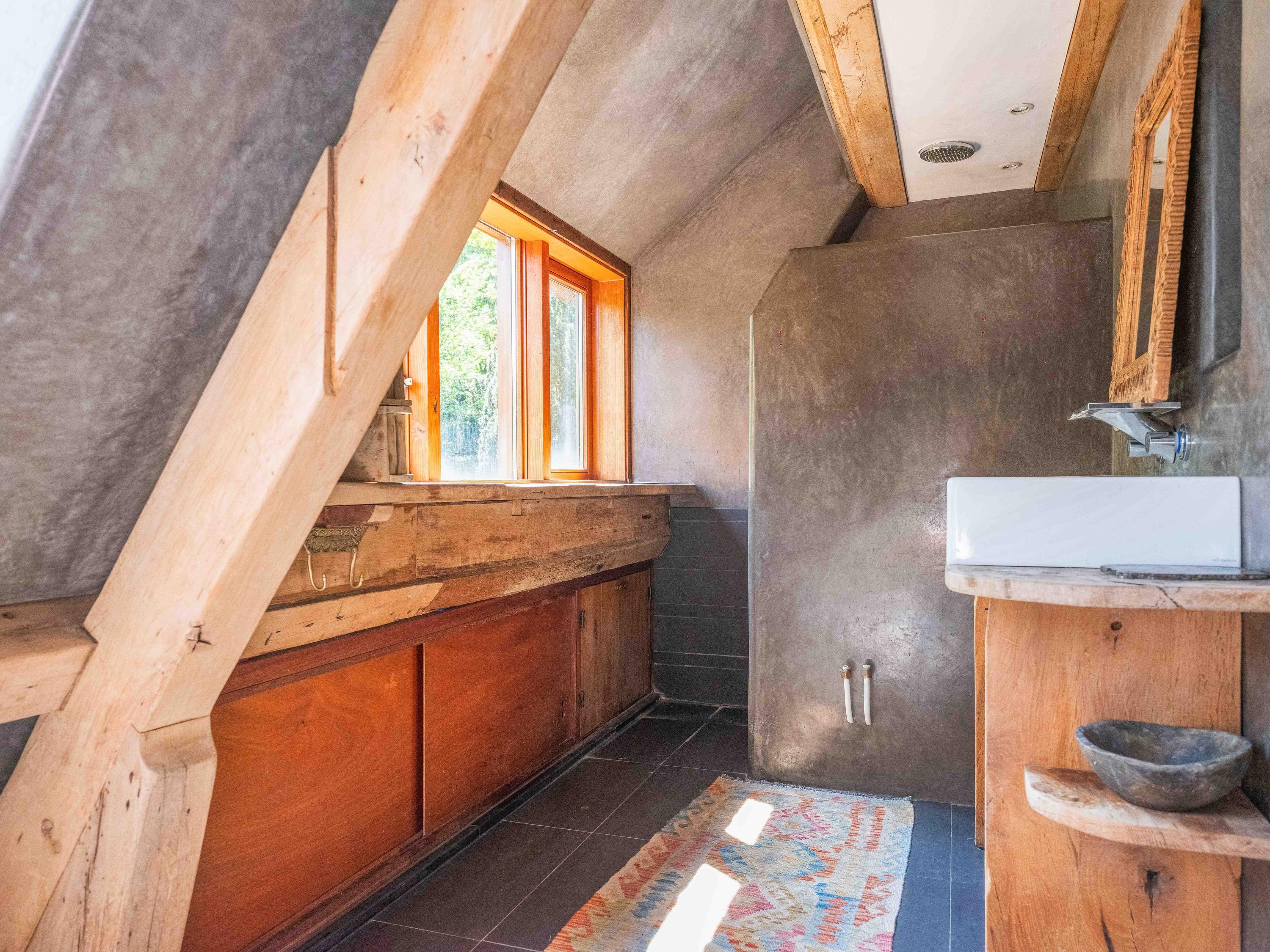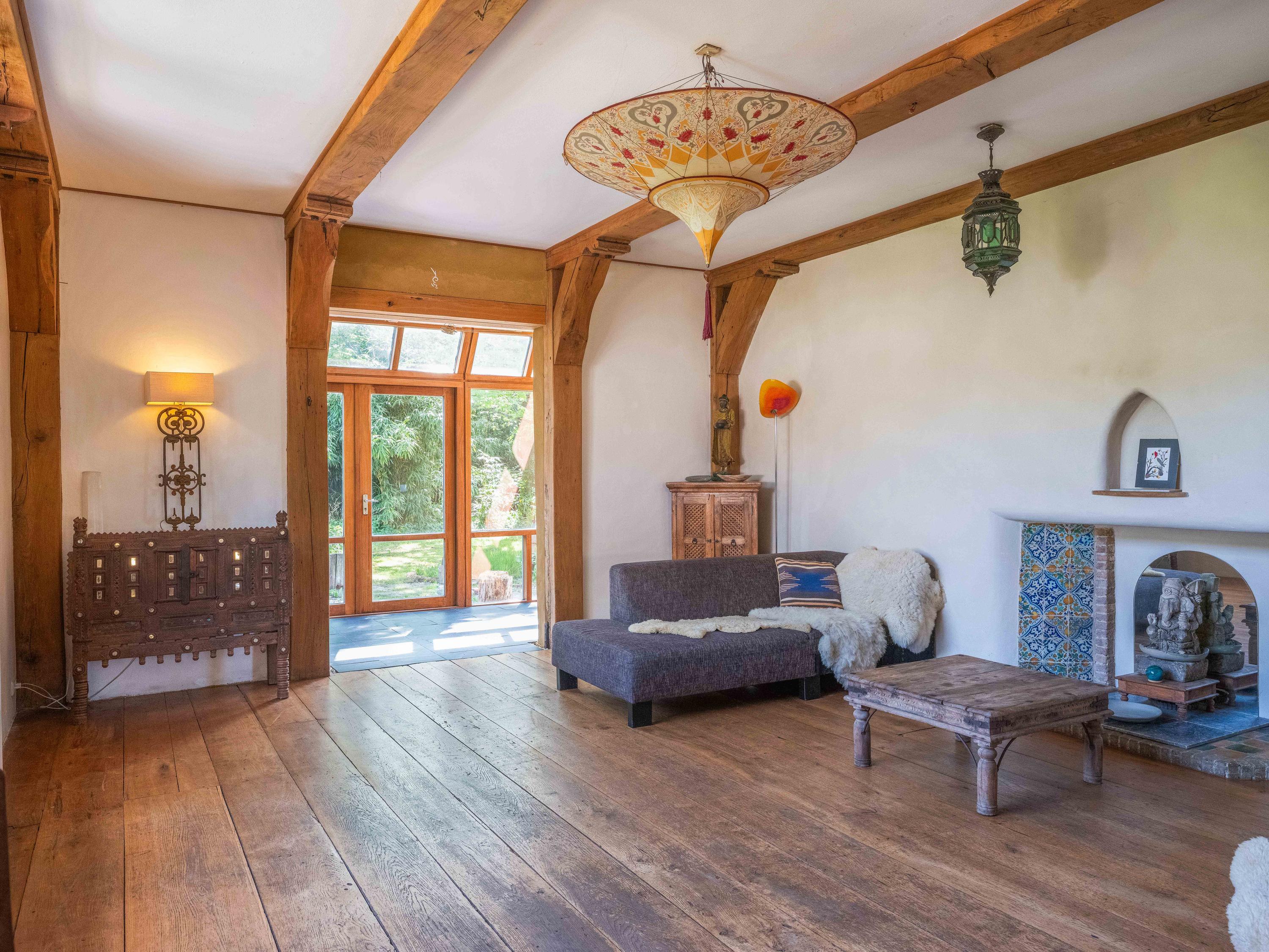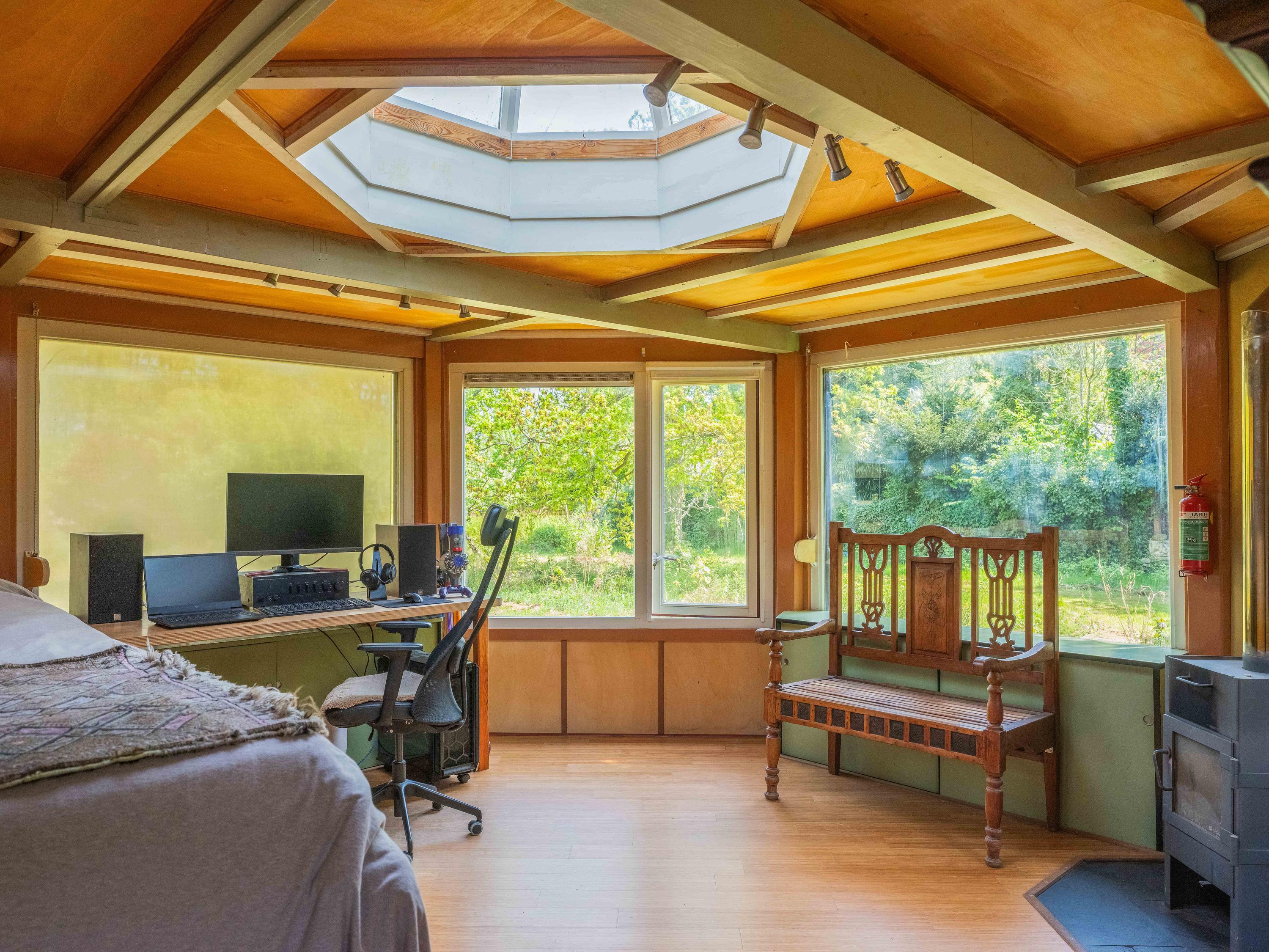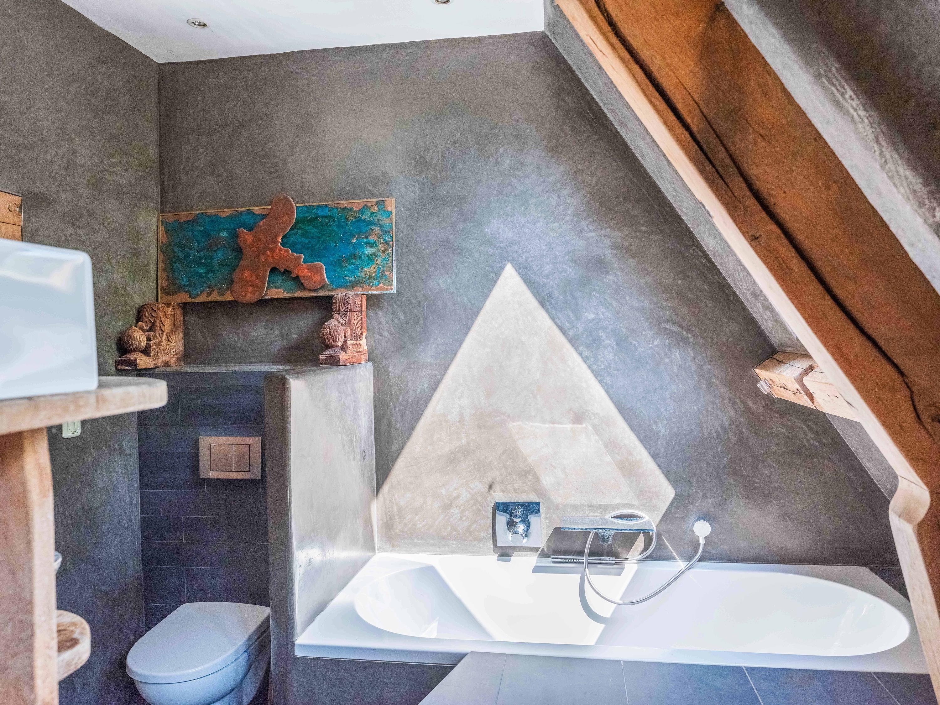 Constructed using 17th-century materials, the main house echoes its heritage with robust fireplaces, exposed oak beams, clay-plastered walls, and expansive oak flooring. The generous living area of 273 m² unfolds into quiet nooks and sunlit rooms, including a garden-facing living room warmed by a fireplace, an inviting front living space with a raised alcove, and an attached office that inspires focus looking into the grounds. Modern comforts blend with history, including a bathroom finished in tadelakt and energy delivered by a central heating system.