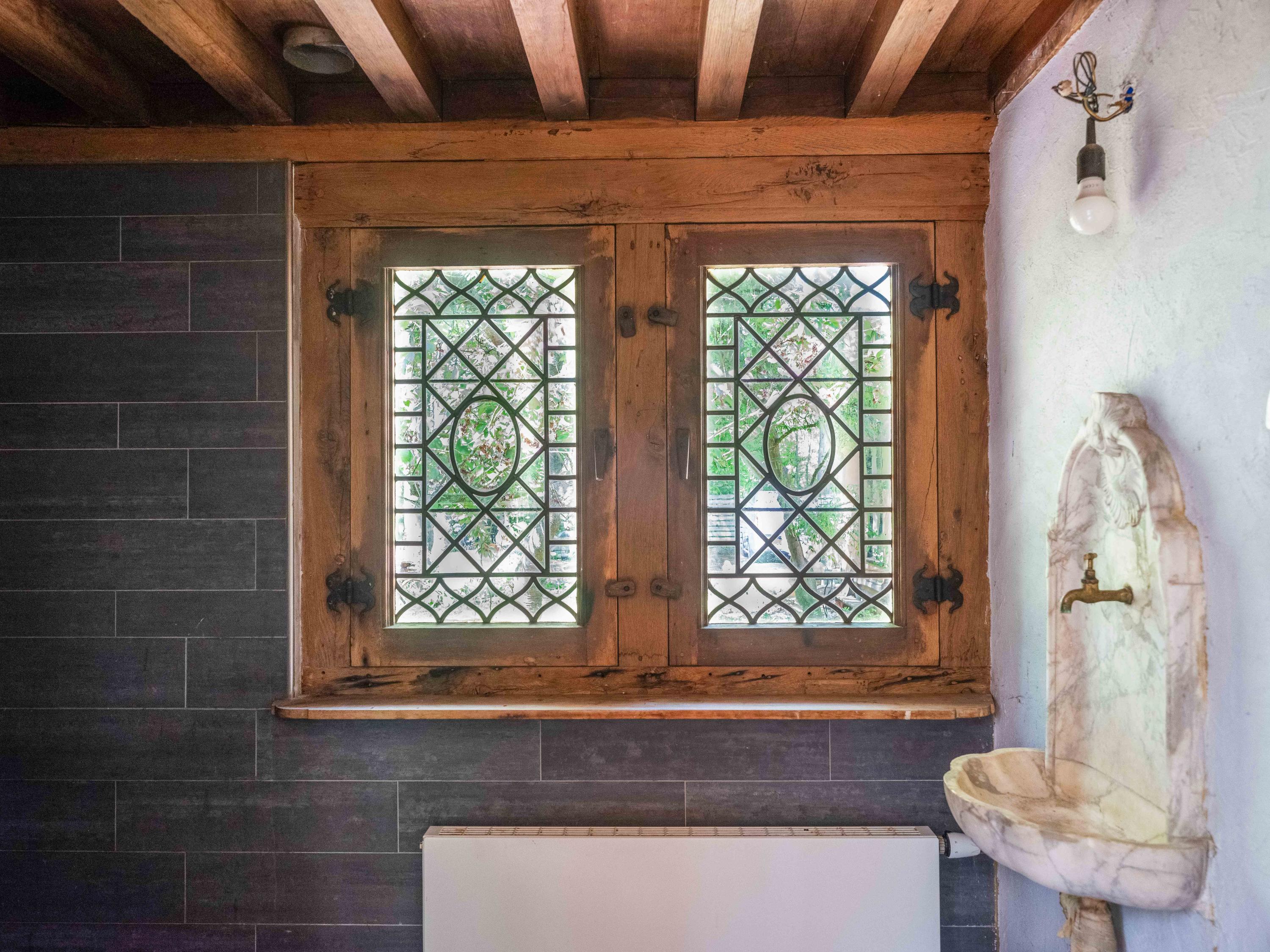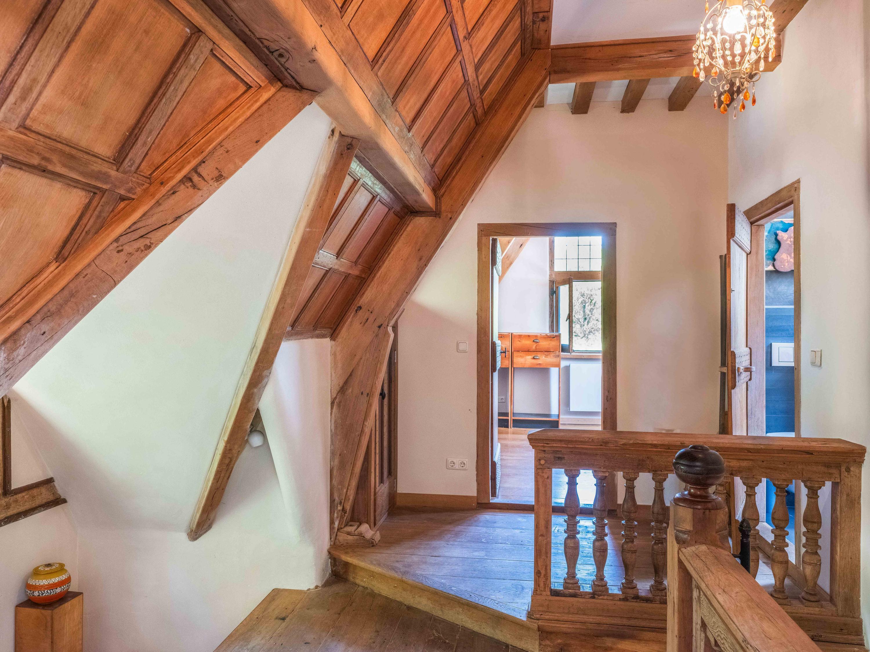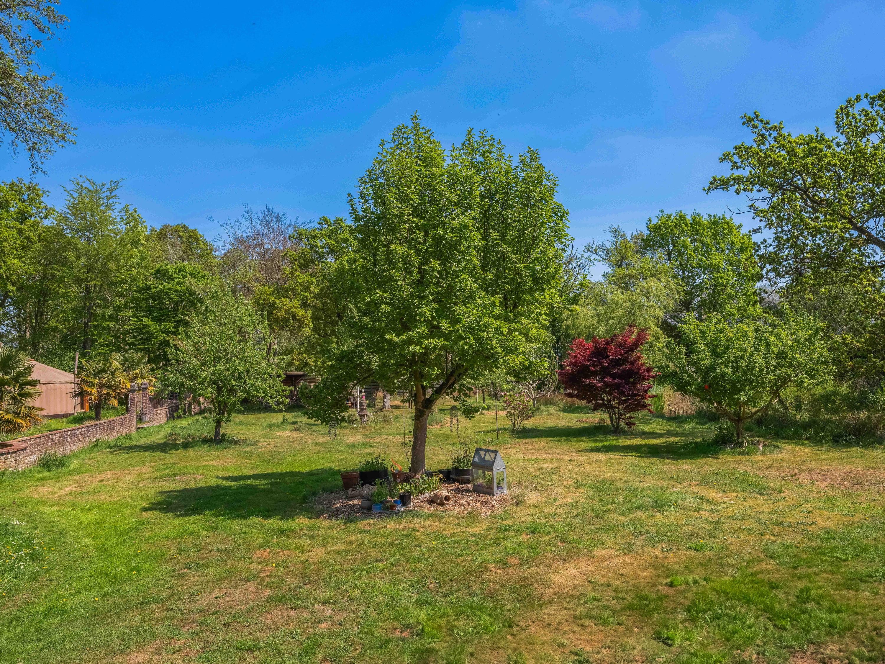 Constructed using 17th-century materials, the main house echoes its heritage with robust fireplaces, exposed oak beams, clay-plastered walls, and expansive oak flooring. The generous living area of 273 m² unfolds into quiet nooks and sunlit rooms, including a garden-facing living room warmed by a fireplace, an inviting front living space with a raised alcove, and an attached office that inspires focus looking into the grounds. Modern comforts blend with history, including a bathroom finished in tadelakt and energy delivered by a central heating system.