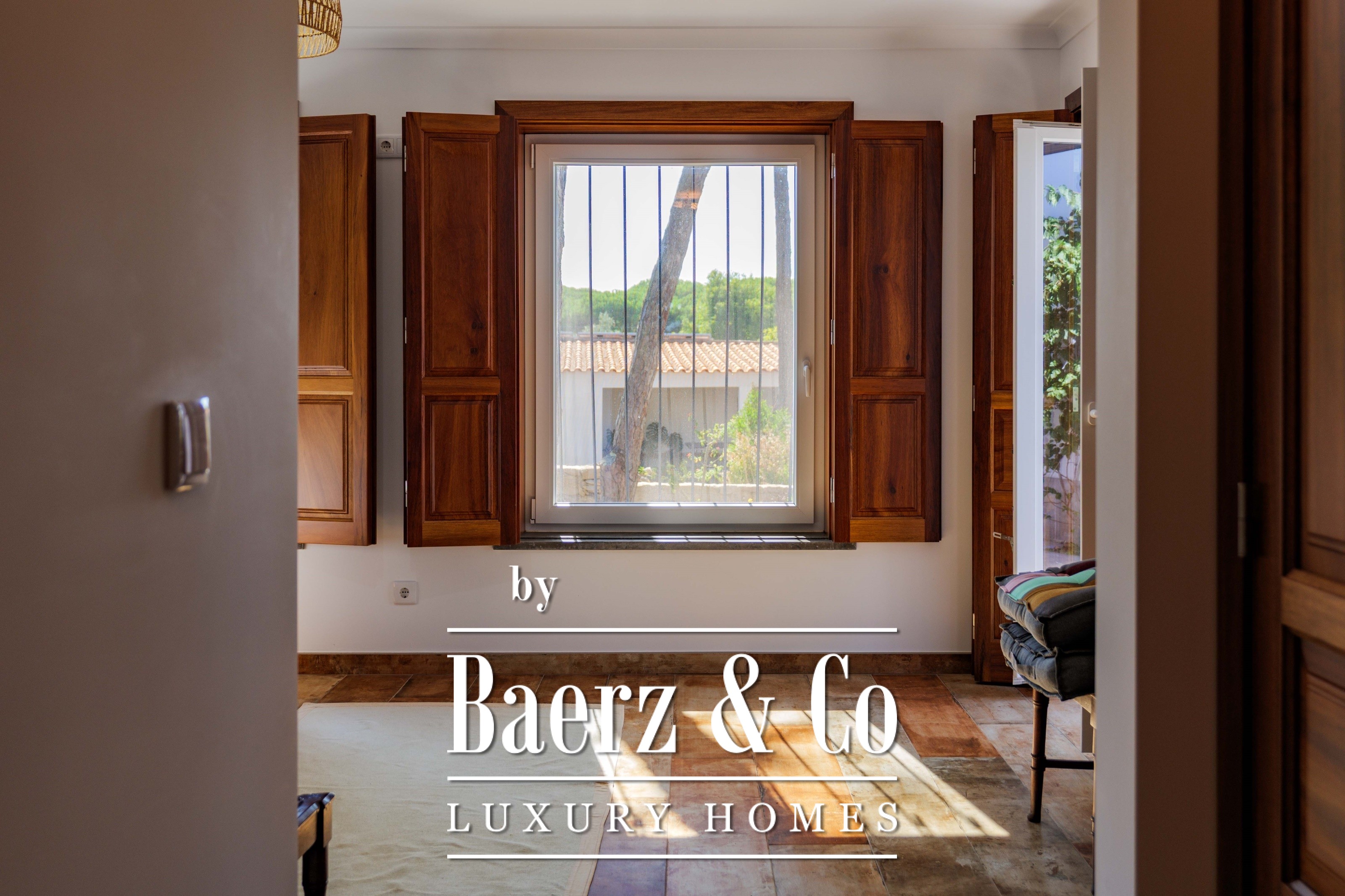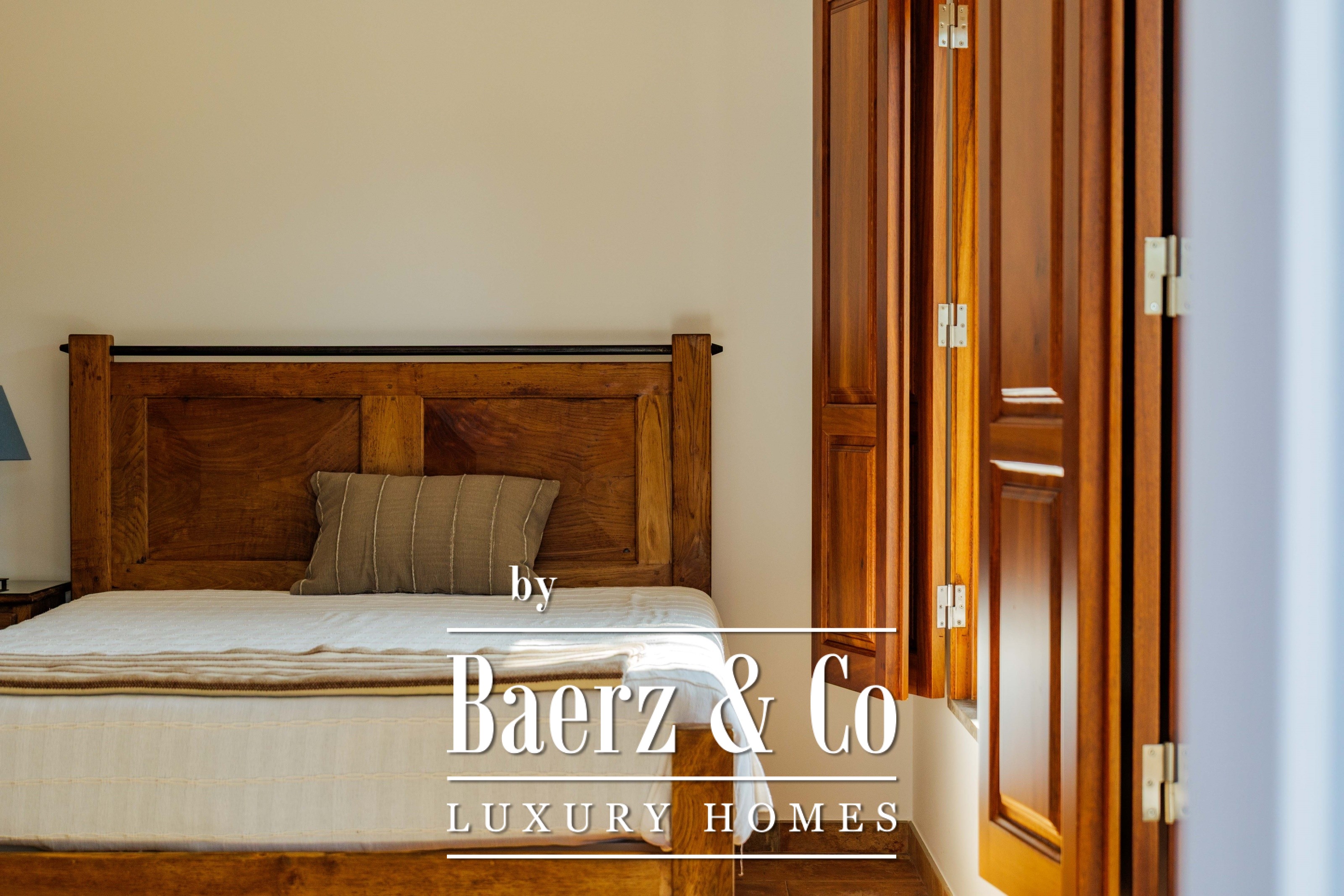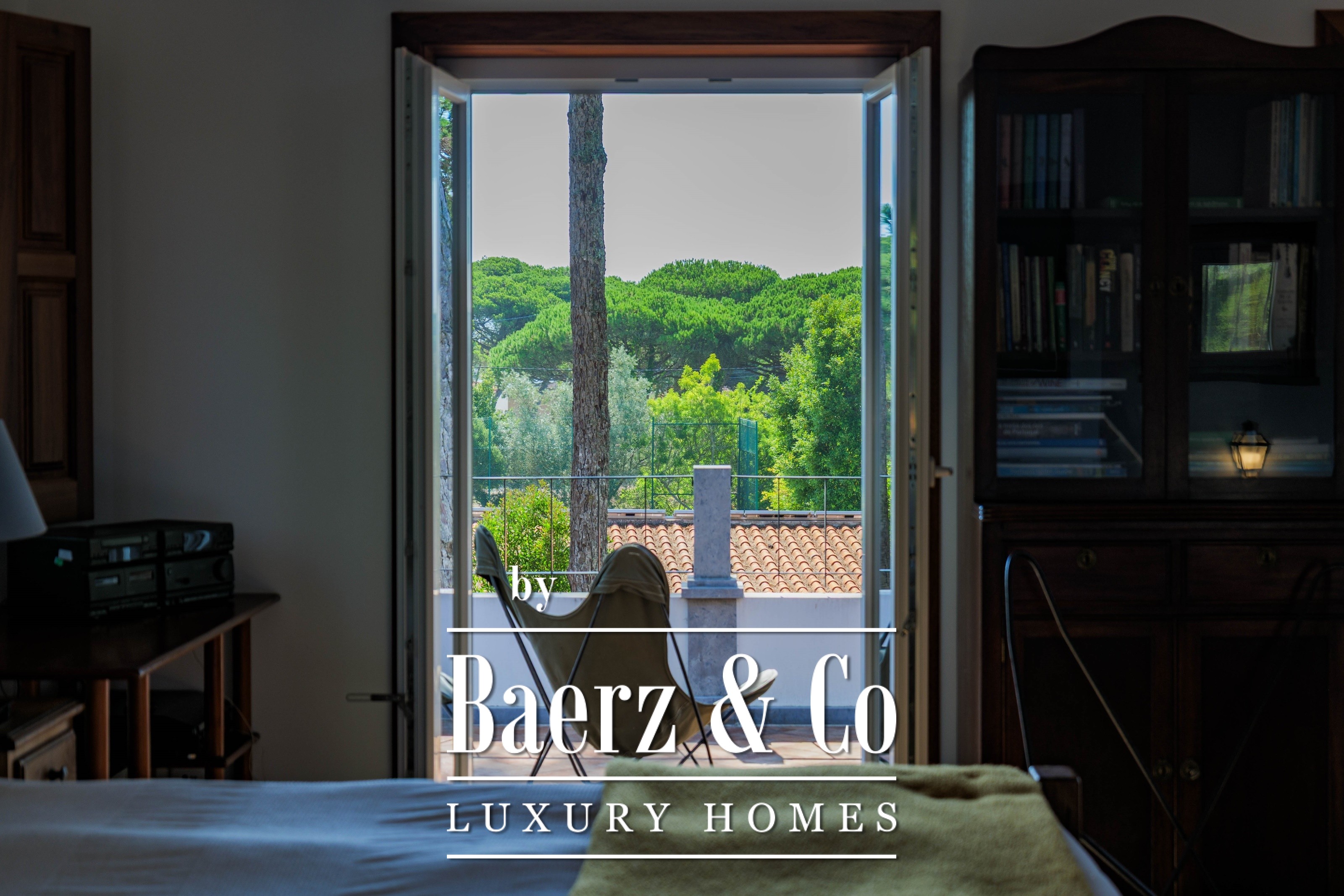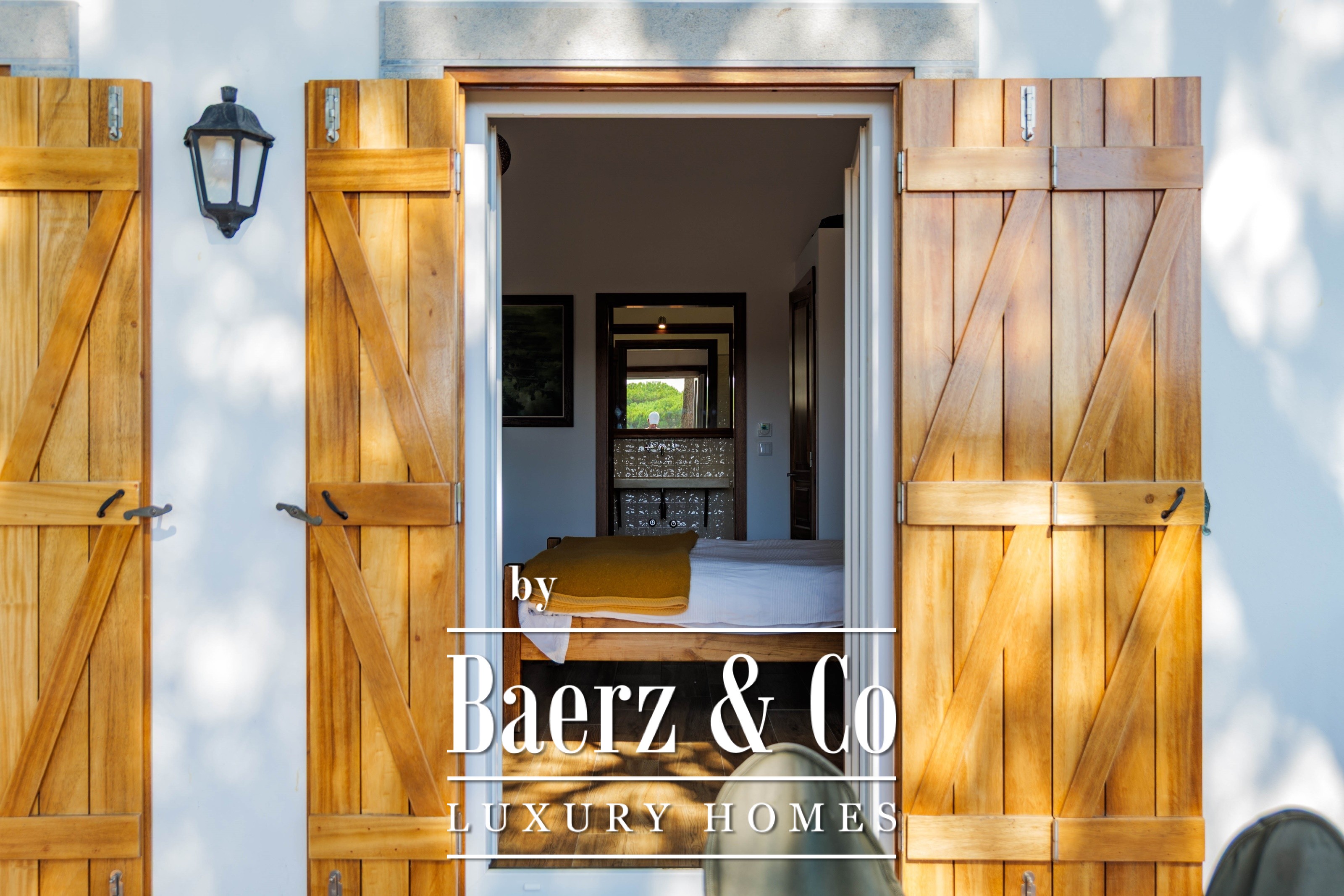 The outdoor space includes a tranquil pool, integrated into the natural landscape, and quiet corners that face the sea. The second house, currently used as a pool house, offers generous open-plan living with an antique fireplace, flexible for guests or as a creative workspace. Across both dwellings are five bedrooms and five bathrooms, each thoughtfully located.
