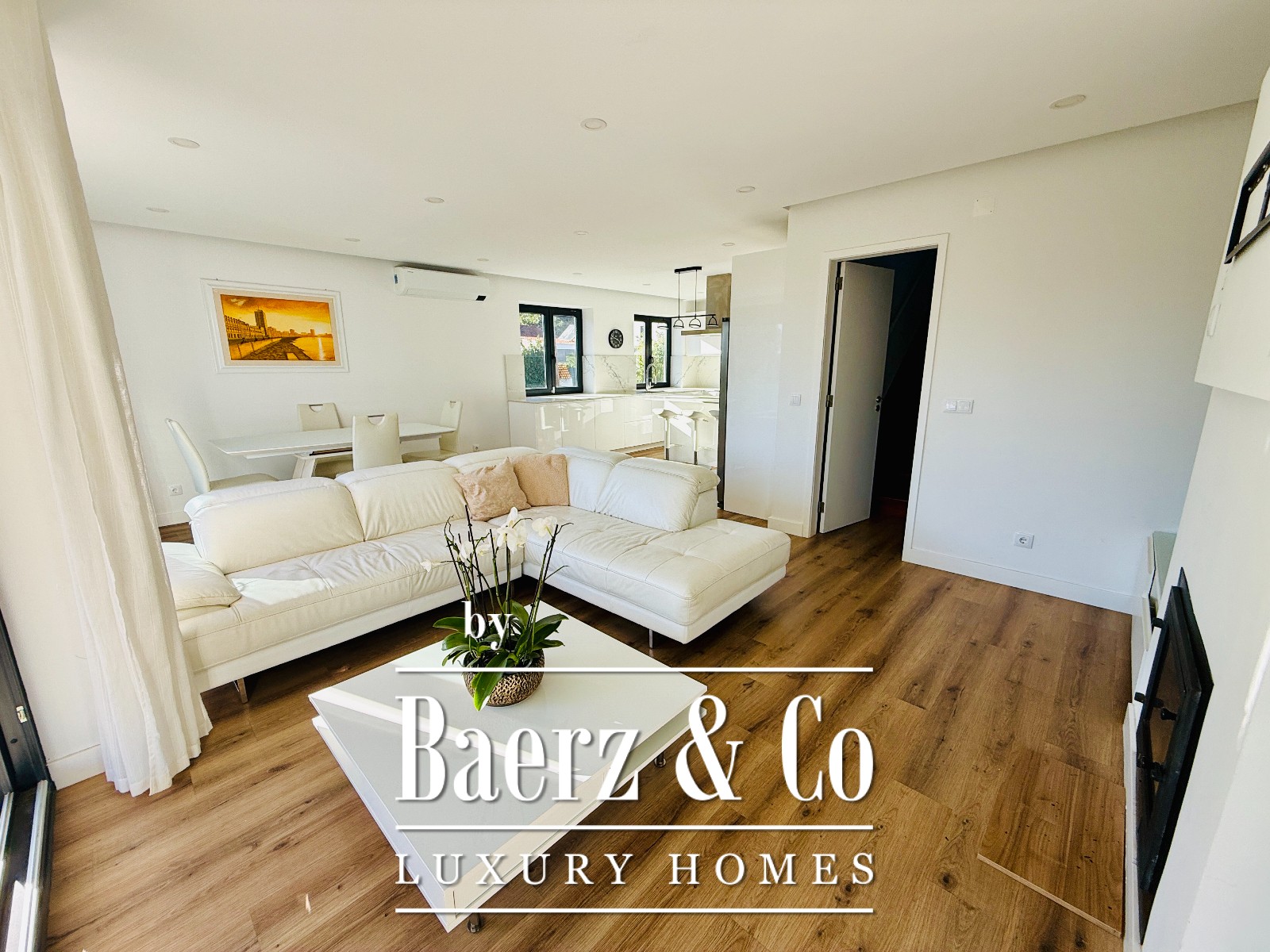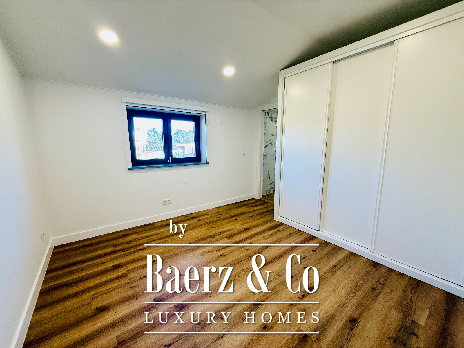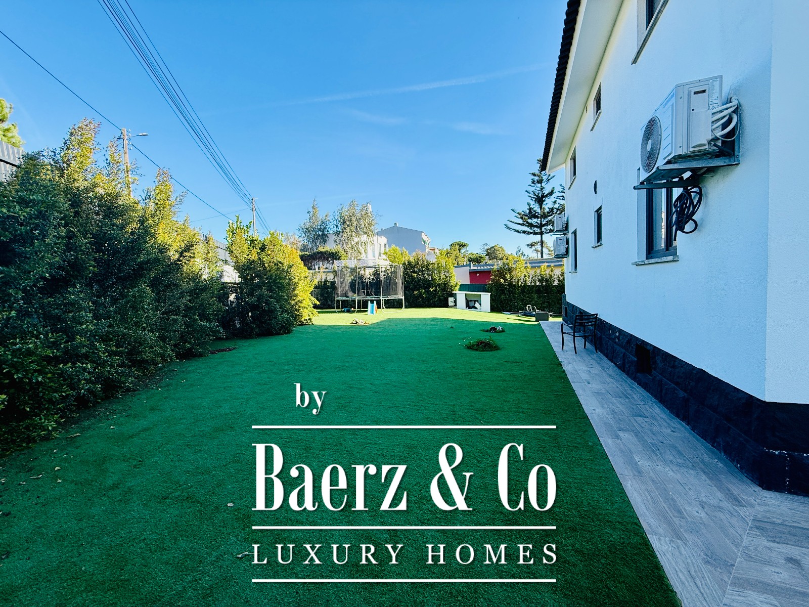 This house Sintra harmonizes contemporary renovation with a sense of privacy and calm, occupying 357 m² on an 868 m² plot. Natural light moves from east to west throughout its three levels, each thoughtfully arranged for both family life and quiet retreat. The ground floor offers a guest bedroom, additional bedroom, storage with a window, a laundry room, and an internal garage for one car. Upstairs, an American-style kitchen with a double refrigerator supports entertaining and everyday rhythm. The adjoining dining and living spaces feature a fireplace and open onto a terrace that leads directly to the heated swimming pool and garden. Two bedrooms on this level provide fitted wardrobes and are served by a well-appointed bathroom. The upper floor holds a principal suite with a walk-in closet and private bath, another suite with wardrobes, and an extra room for flexibility. Air conditioning throughout ensures comfort in every season, with the living spaces quietly set along a tranquil street. From here, Tasis School is ten minutes away, Caisl School twelve minutes, and the center of Lisbon within twenty-five kilometers, connecting daily life to the best of Sintra and the Portuguese capital. This house for sale in Sintra brings together refined practicality with understated elegance.