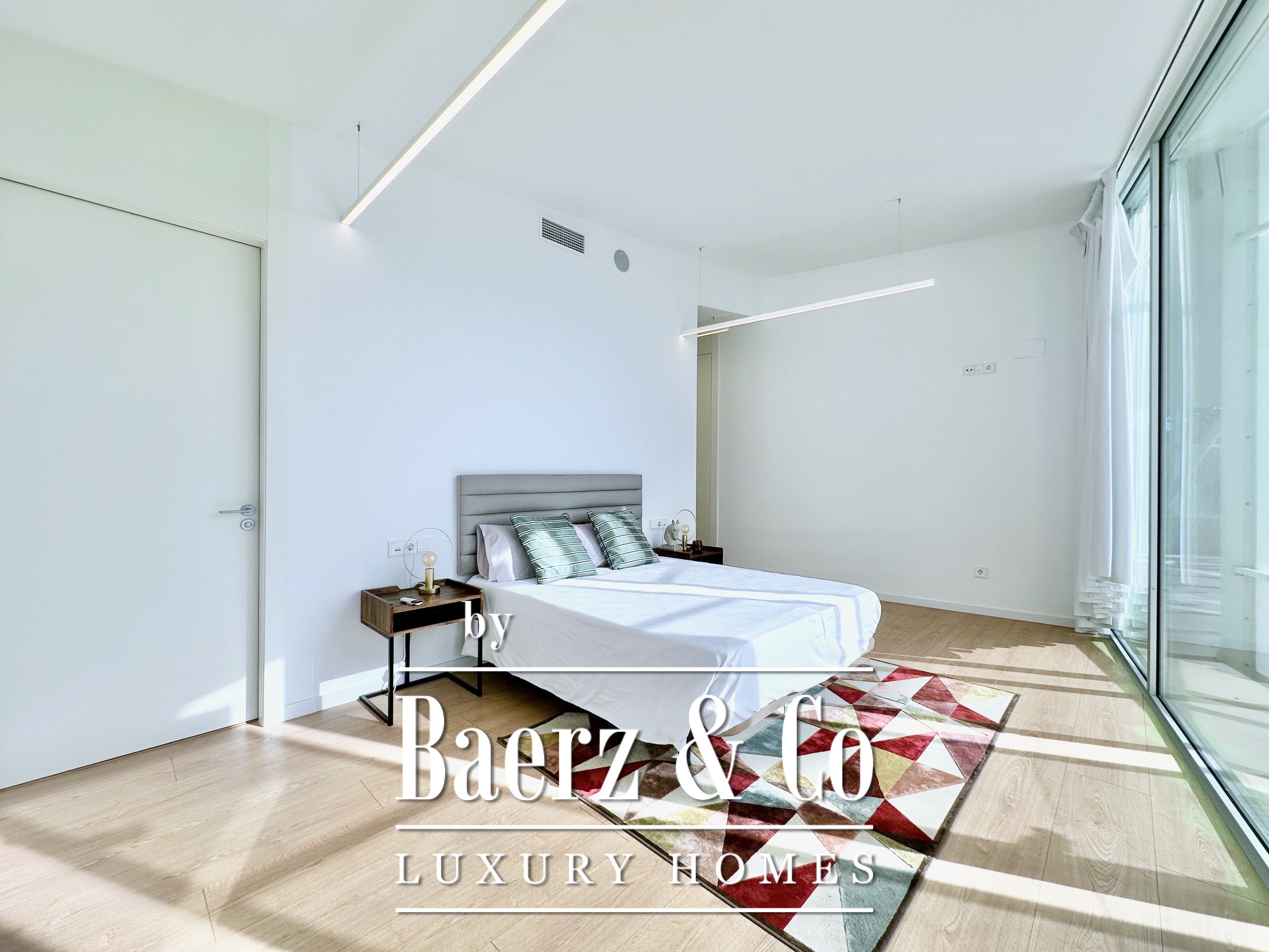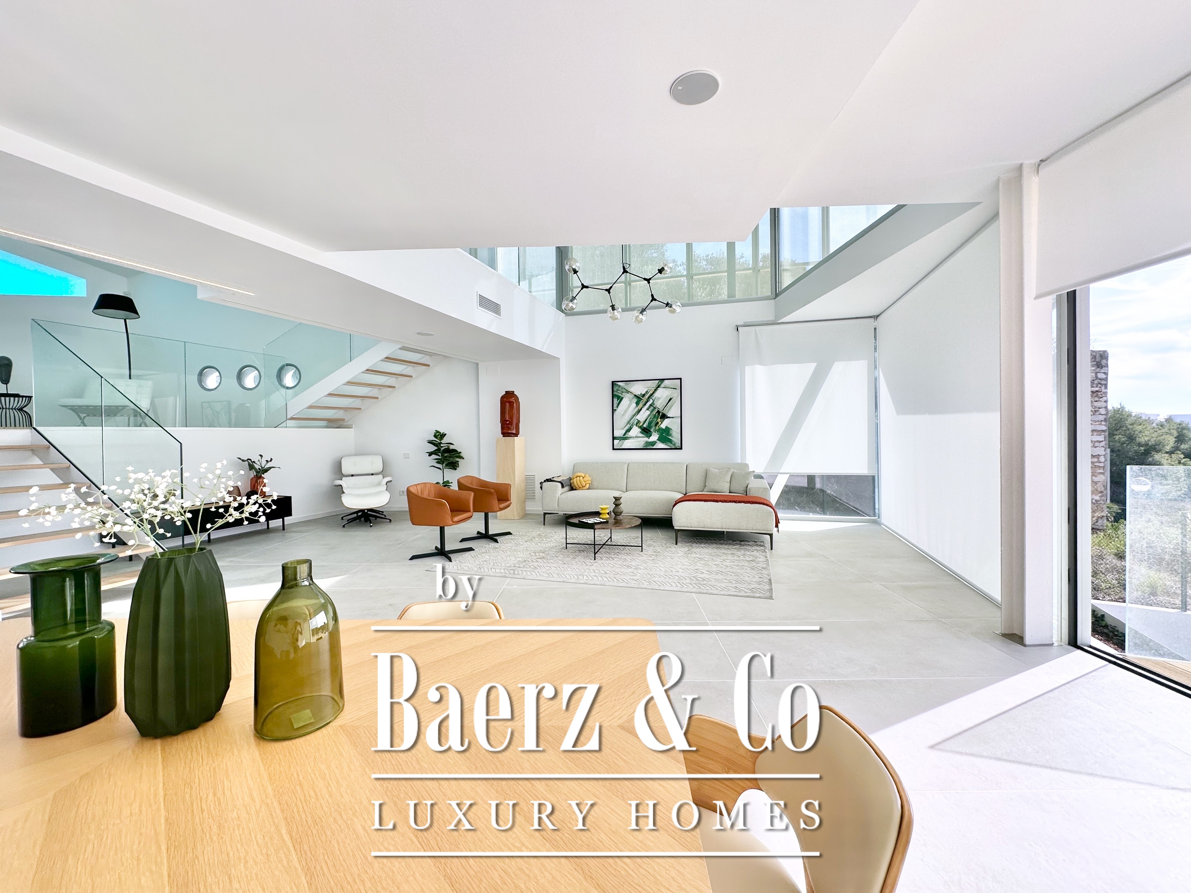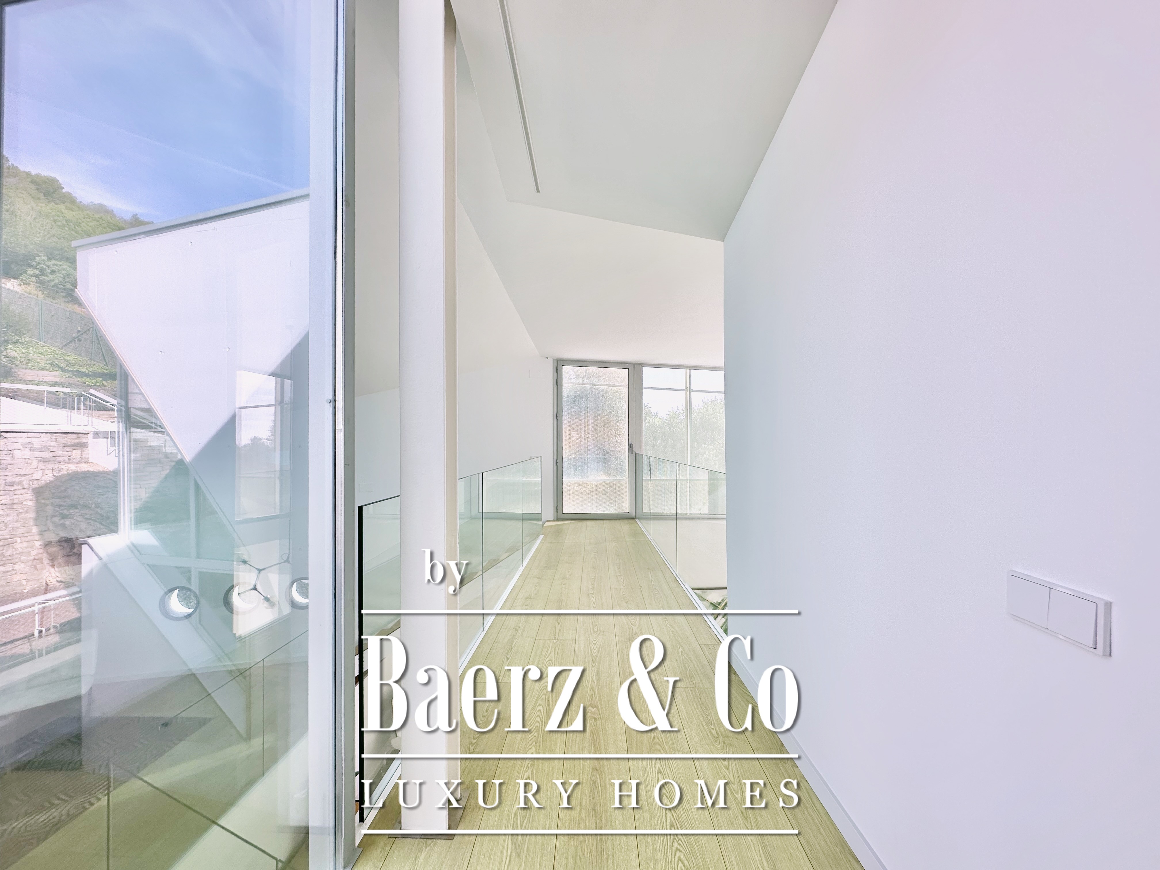Ascending above the living space, a suspended walkway leads to three double bedrooms, two with private bathrooms. Each room connects to a terrace filtered by metal latticework, balancing openness with privacy. This contemporary villa for sale in Sitges merges architectural precision with an elevated coastal experience.