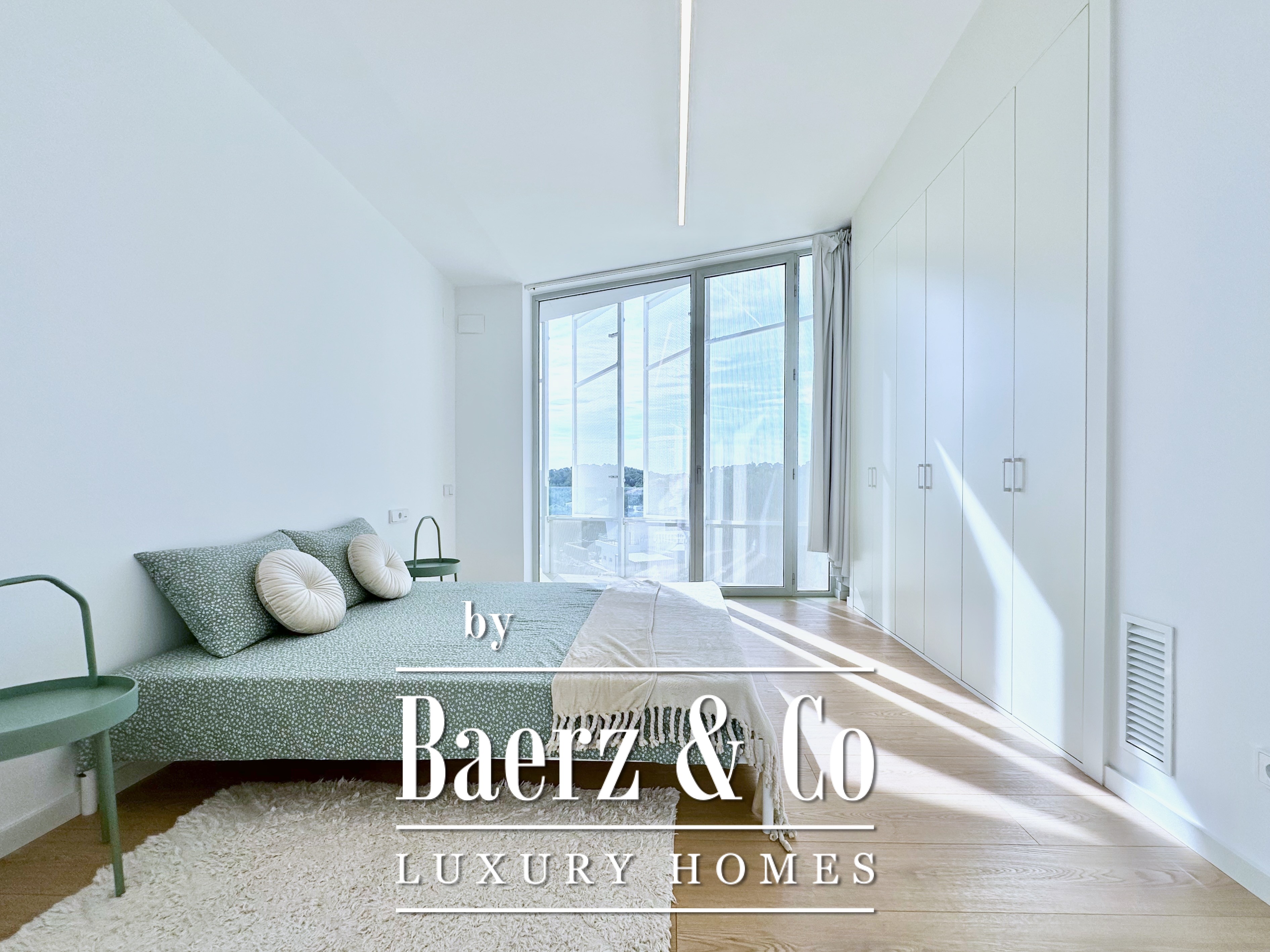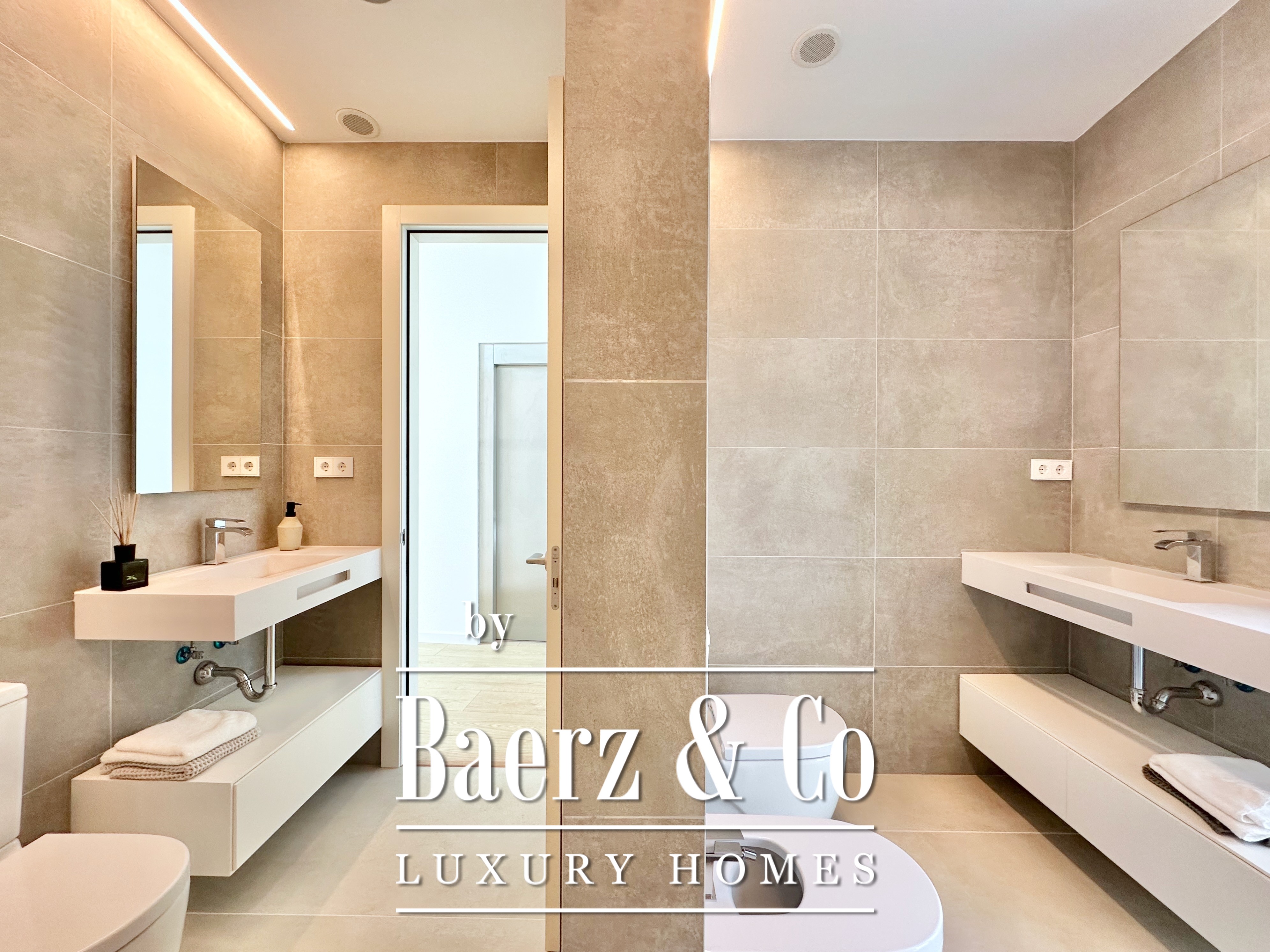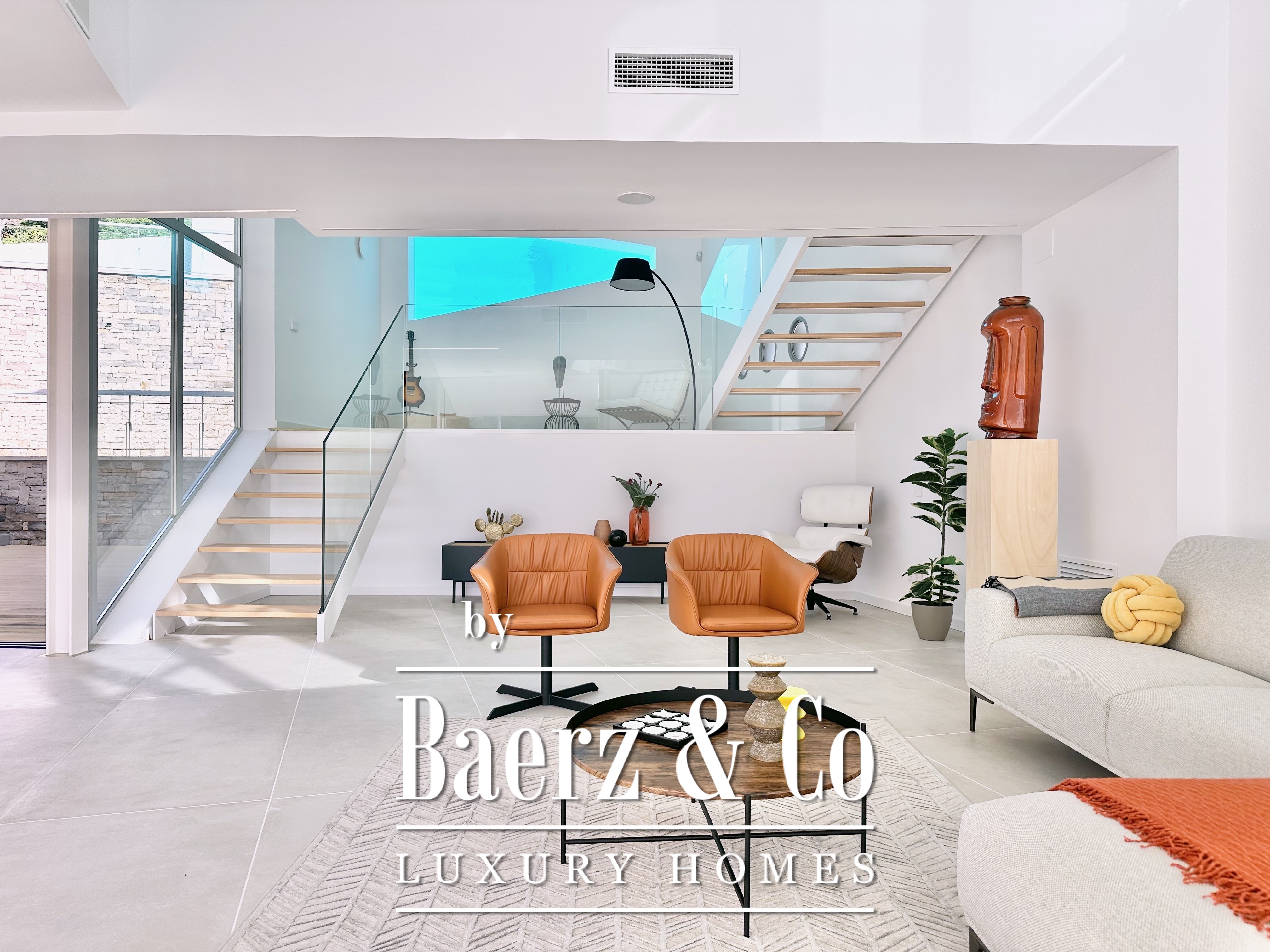 Ascending above the living space, a suspended walkway leads to three double bedrooms, two with private bathrooms. Each room connects to a terrace filtered by metal latticework, balancing openness with privacy. This contemporary villa for sale in Sitges merges architectural precision with an elevated coastal experience.