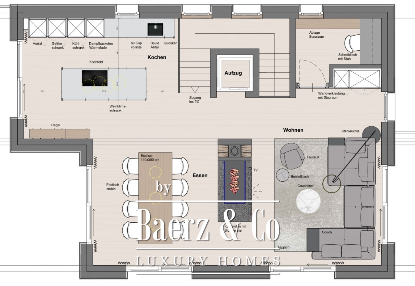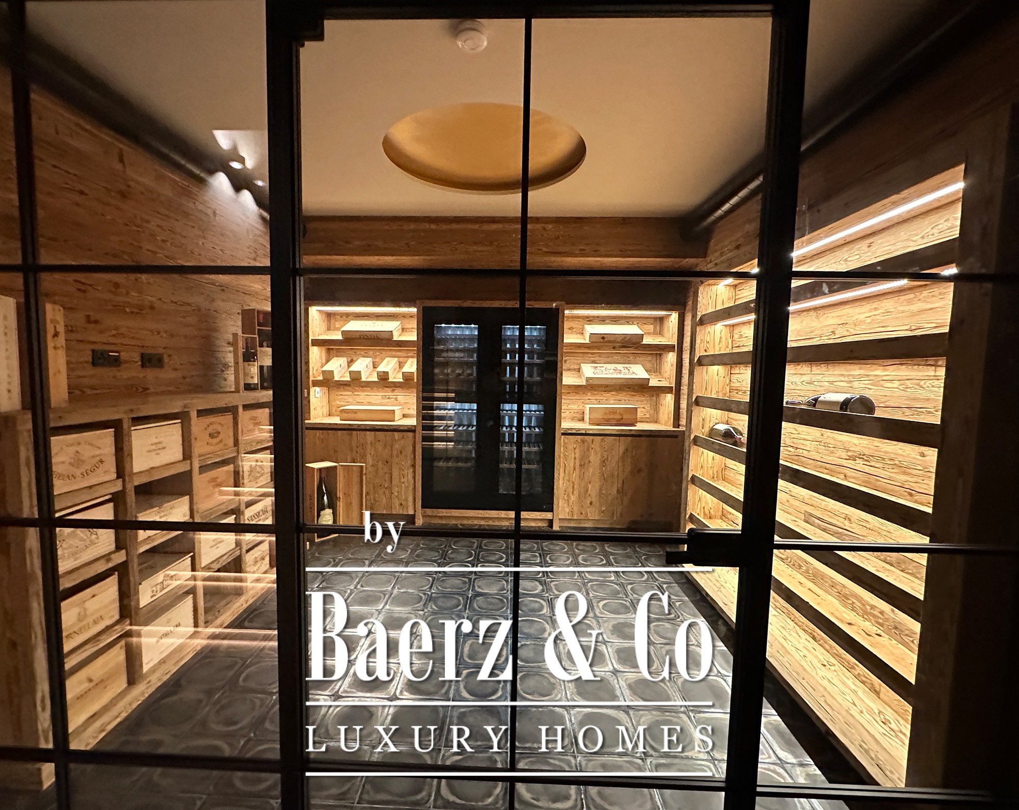 Living space spans approximately 278 m², anchored by high-end oak floors, solid wood doors, a bespoke kitchen appointed with select Miele-Black Edition appliances, and brand-name fixtures throughout. Four serene bedrooms and four bathrooms ensure personal space, while dedicated areas—such as a spa with sauna, whirlpool, and a movie theater seamlessly integrated into the wellness suite—invite restorative downtime. Designer furnishings, a wine and cigar lounge, an open fireplace, and GIRA smart home integrations cultivate ease and sophistication.