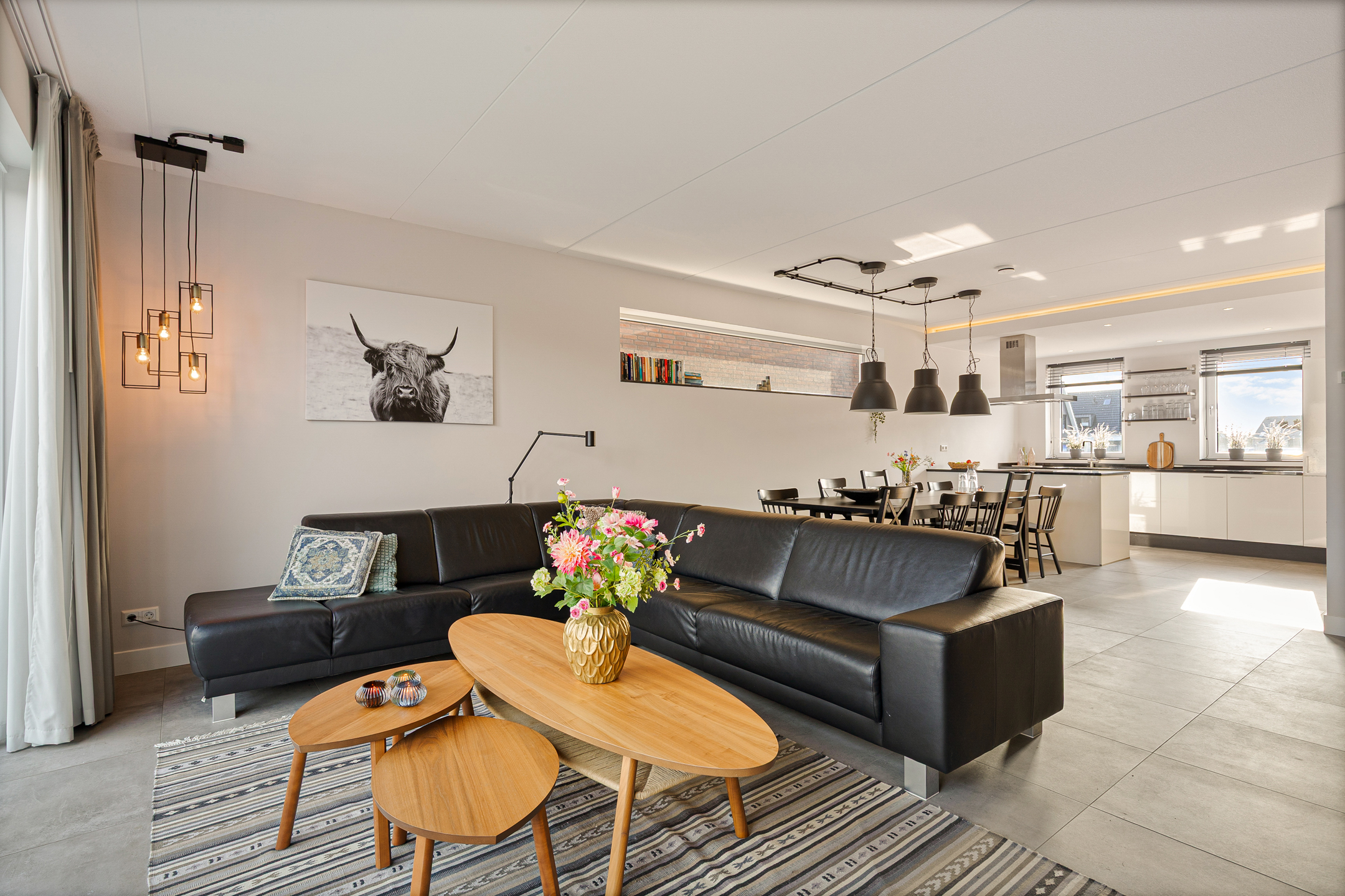 De ruime en lichte woonkamer is gesitueerd aan de achterzijde en biedt door de grote raampartijen een prachtig uitzicht over de tuin en het water. Openslaande deuren zorgen voor een directe verbinding met het terras en de steiger.