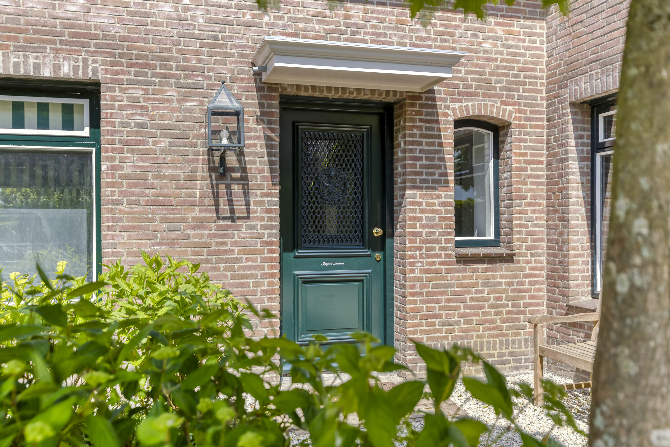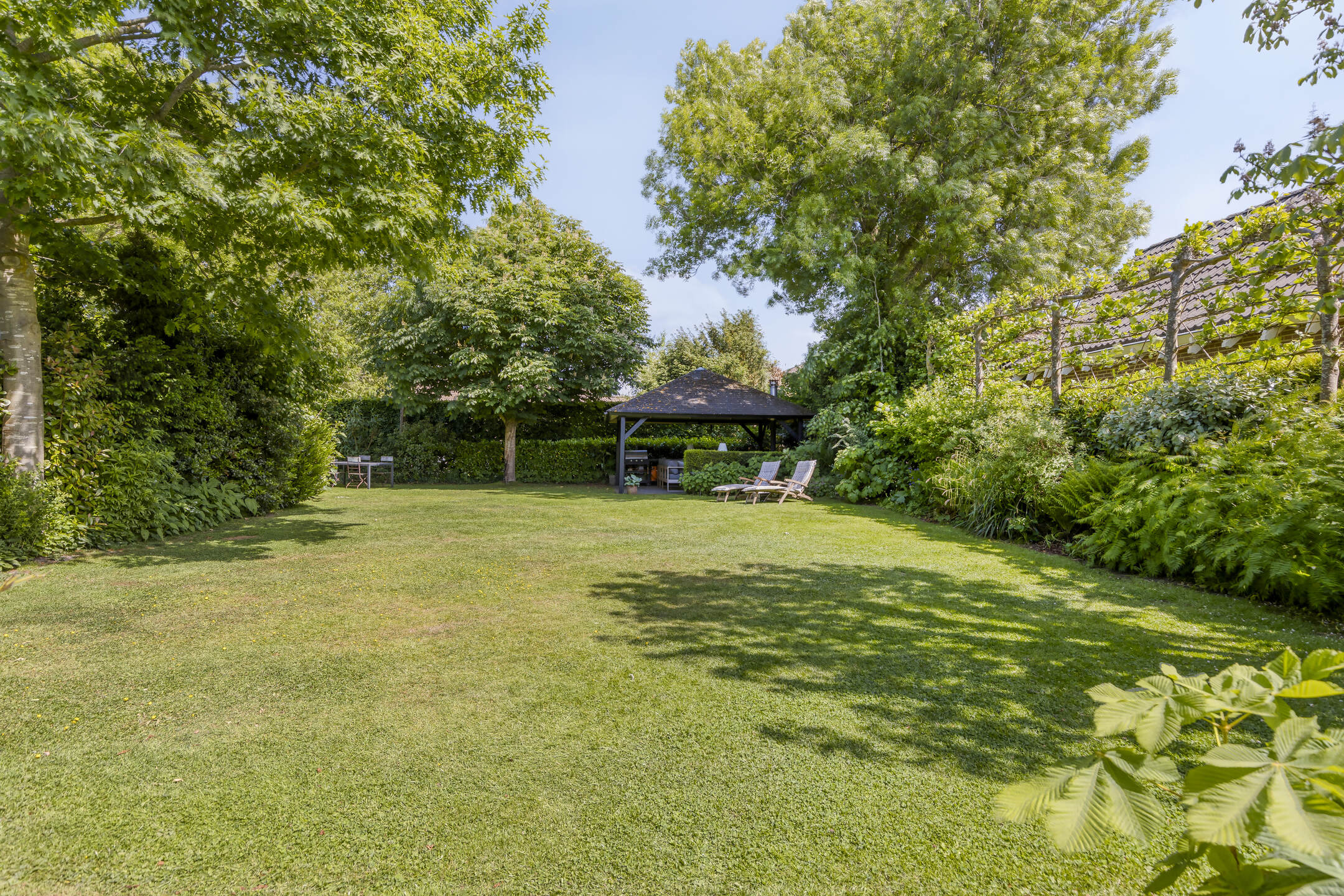 Aangelegde tuin, terras bestraat met sierbestrating en voorzien van een overkapping vv. buitenhaard, tuinkas vv. beregeningscomputer en groentetuin vv. drinkwatertappunt, borders, gazon vv. beregeningsinstallatie en een zij-uitgang;