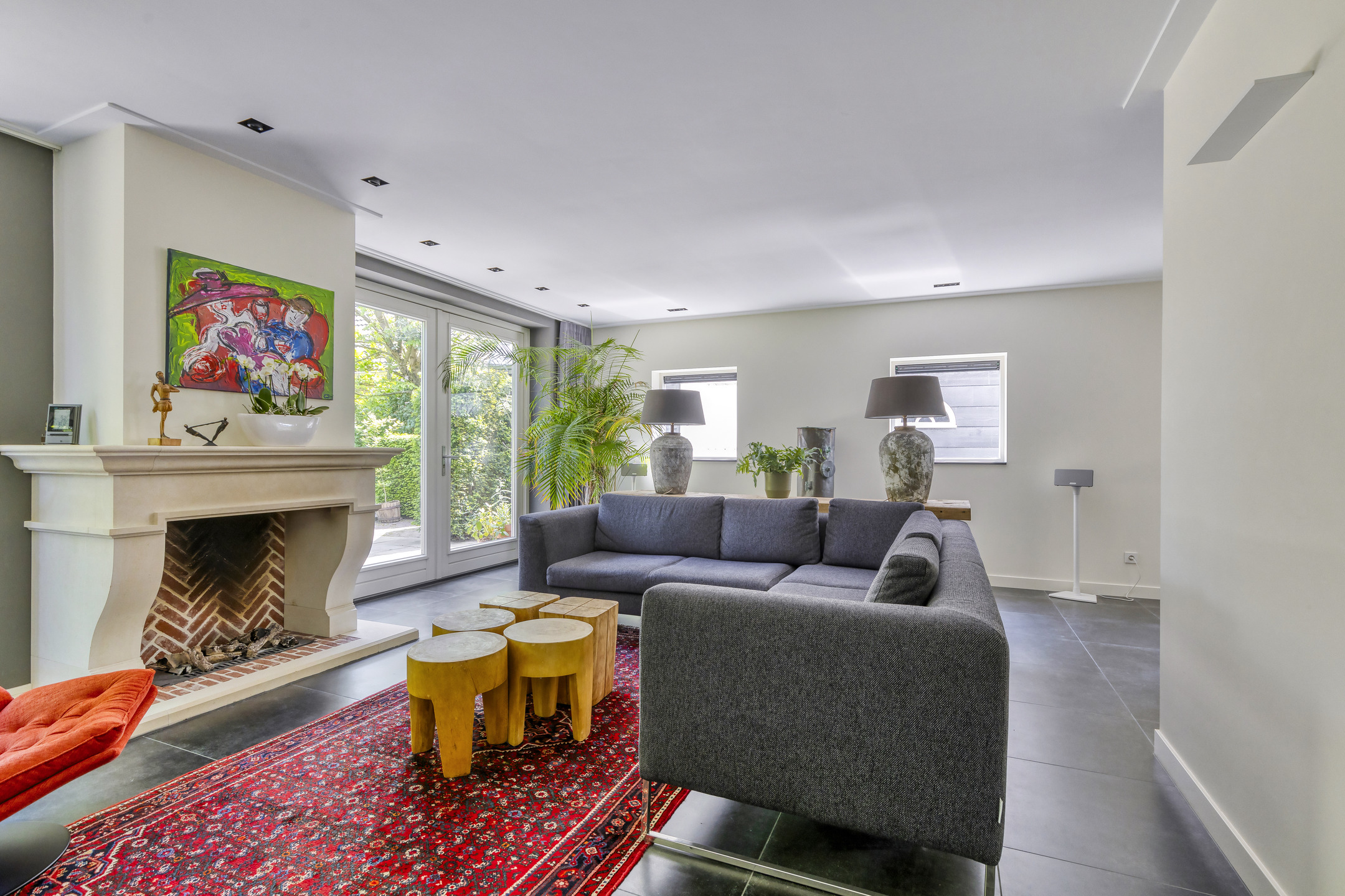sfeervolle woonkamer voorzien van een gashaard (mogelijkheid voor een houtkachel), wandafwerking stucwerk, tegelvloer, plafond afgewerkt met stucwerk vv. inbouwspots, 2-tal tuindeuren naar tuin/terras;