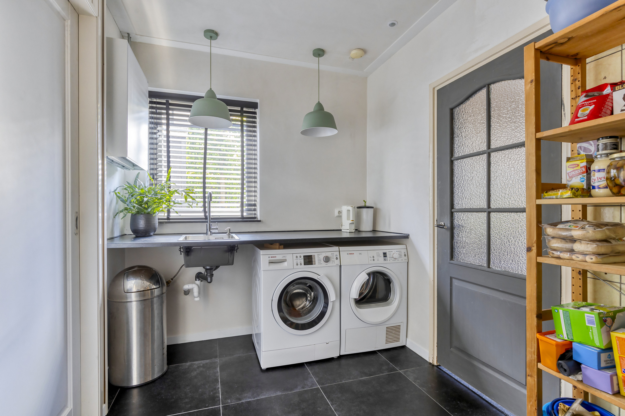 bijkeuken met wasmachine-/drogeraansluiting en een aanrechtblad, wandafwerking stucwerk, tegelvloer, plafond afgewerkt met stucwerk vv. inbouwspots;