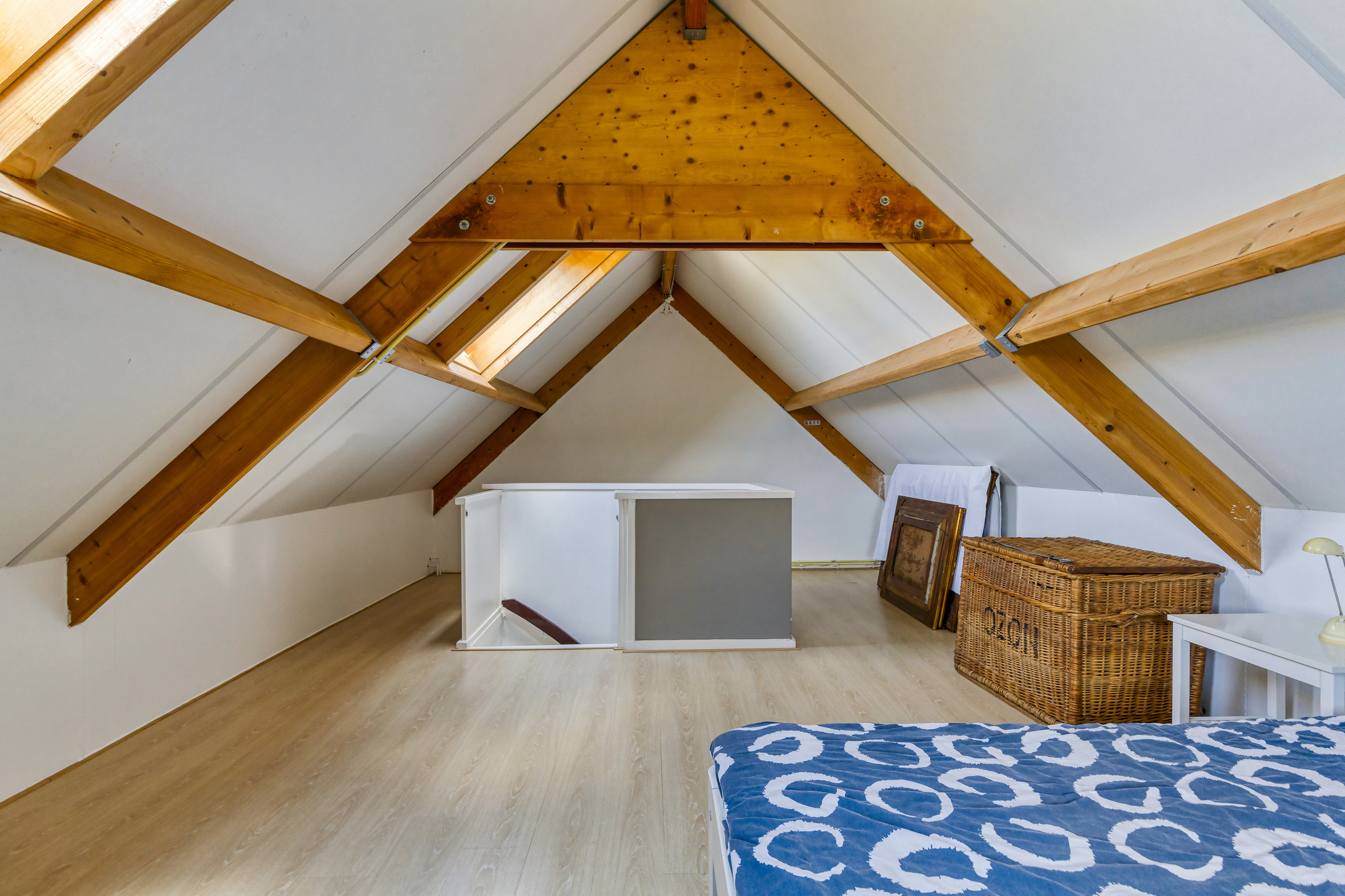 Bergzolder, houten vloer, dakplaten in het zicht.