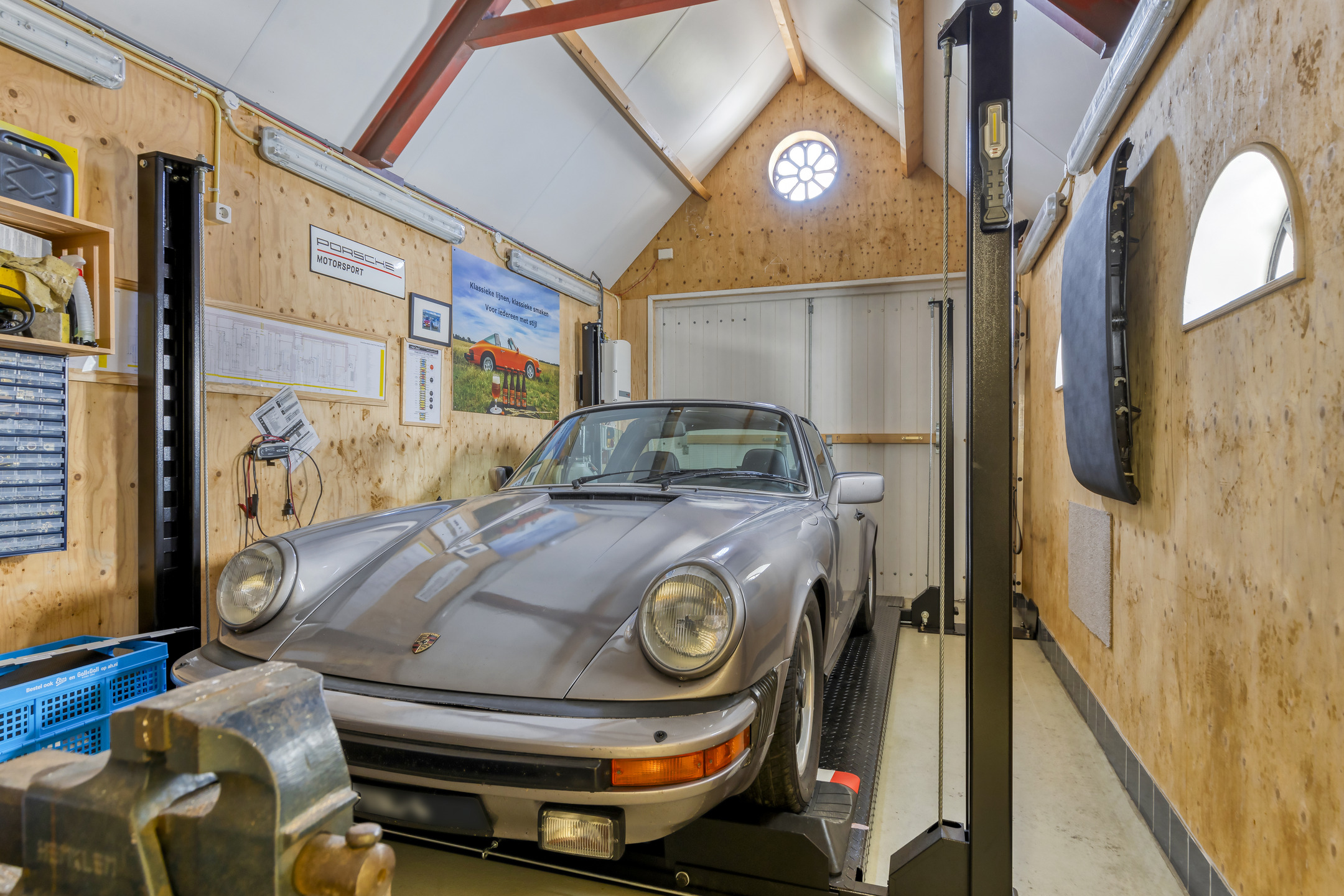 in 2 delen met een separate loopdeur vv. volledige isolatie en geschikt voor het stallen 2 auto’s;