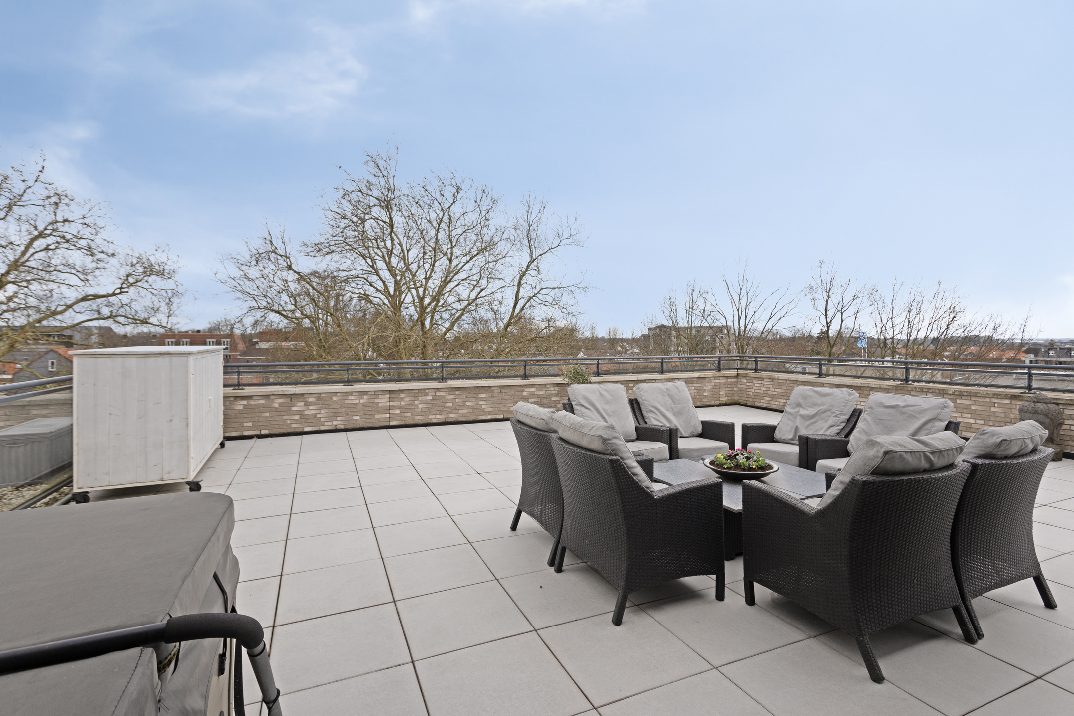 spacious roof terrace of approx 165 m², situated on the sunny west and equipped with various sun and shade angles, ceramic 60x60 tiles, a multi-person Jacuzzi with upper deck (for acquisition), electrical points and an outdoor tap.