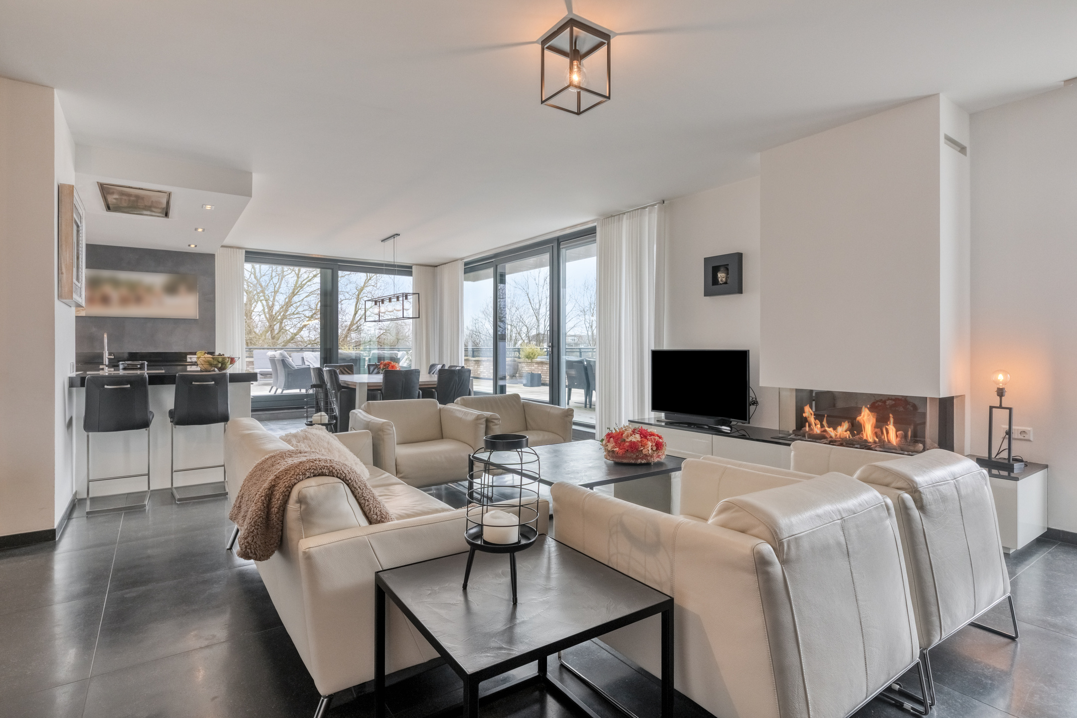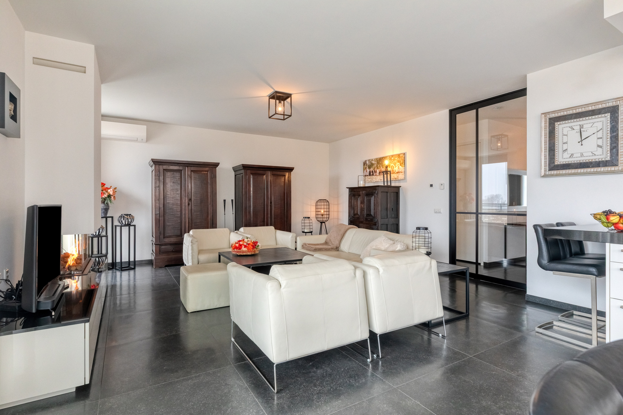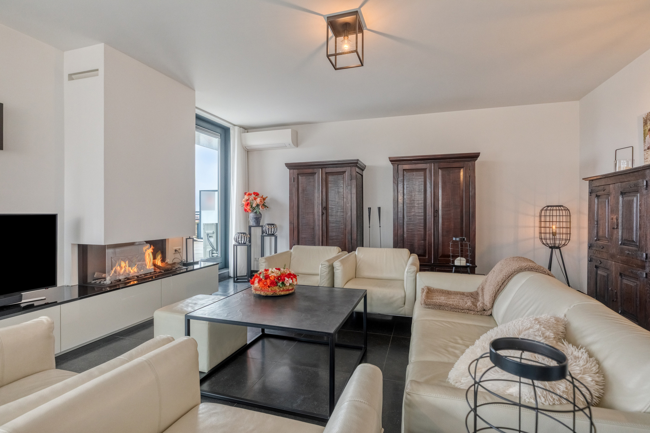 The living room is finished with a luxurious tiled floor, plastered walls, and a plastered ceiling. It features a gas fireplace for the cold winter days and air conditioning for the warm summer days. From the living room, there is access to the generous rooftop terrace through two luxury sliding doors and a hinged garden door.