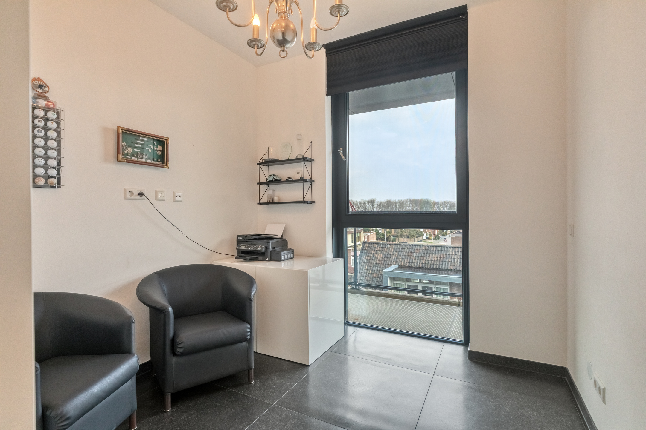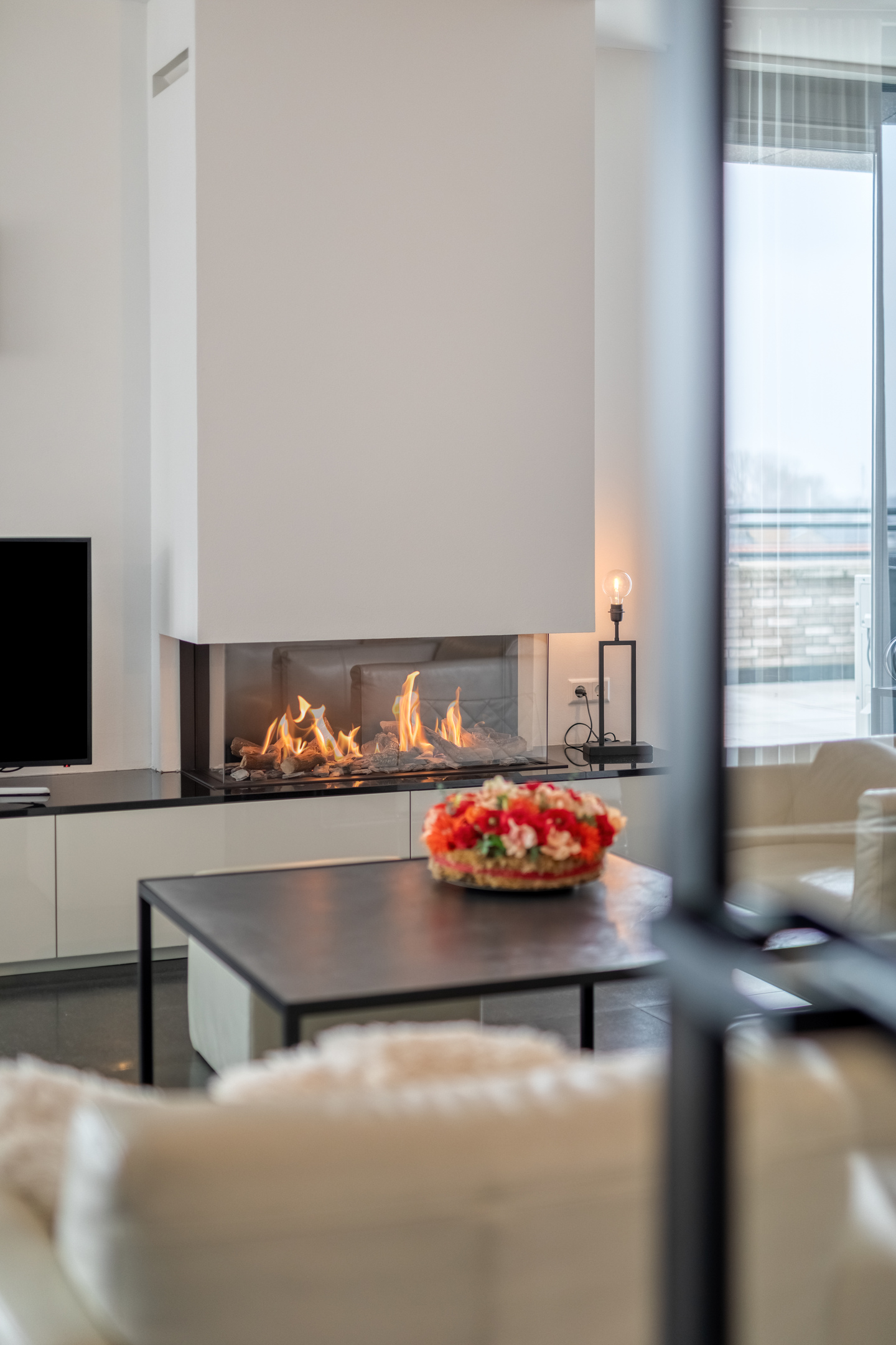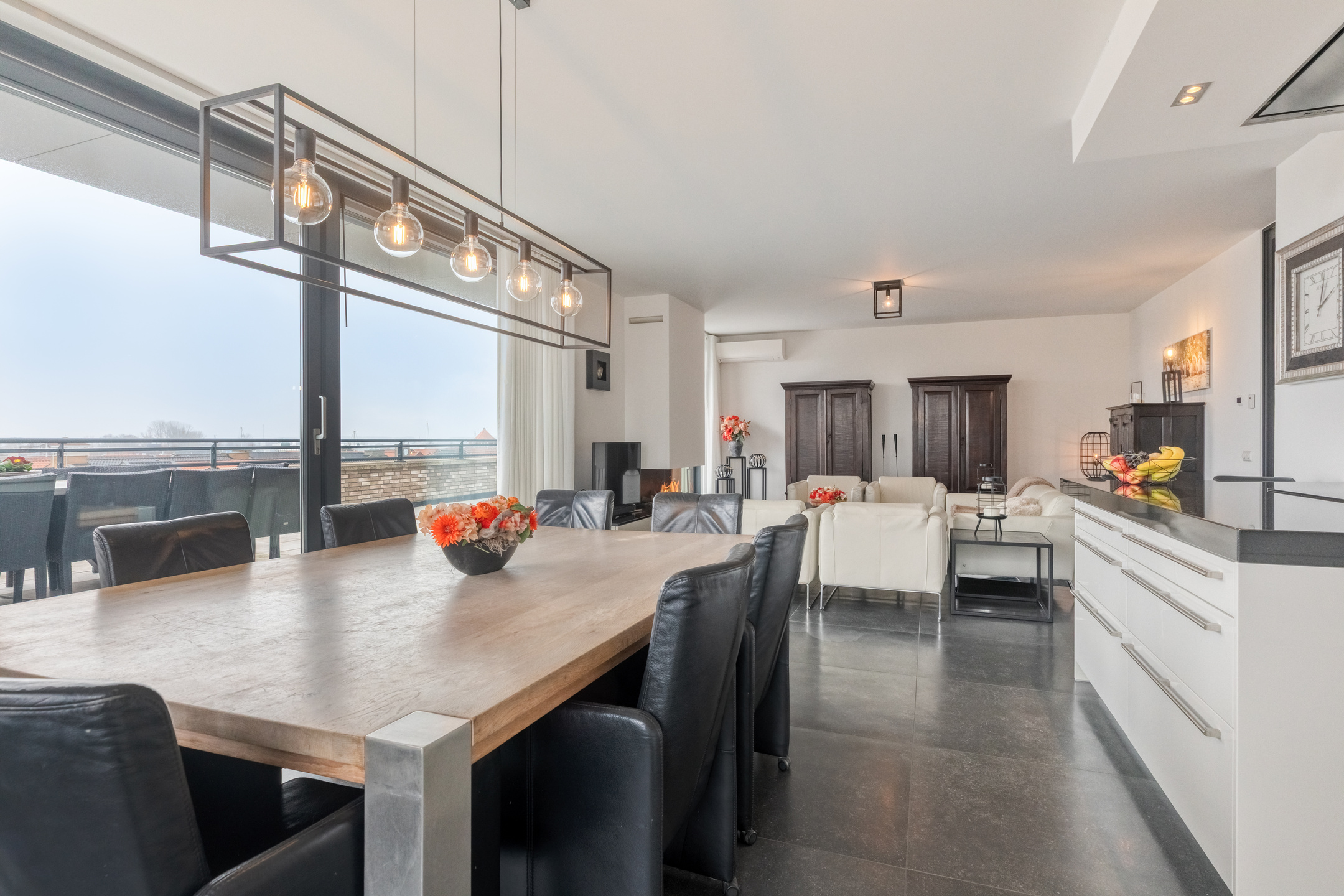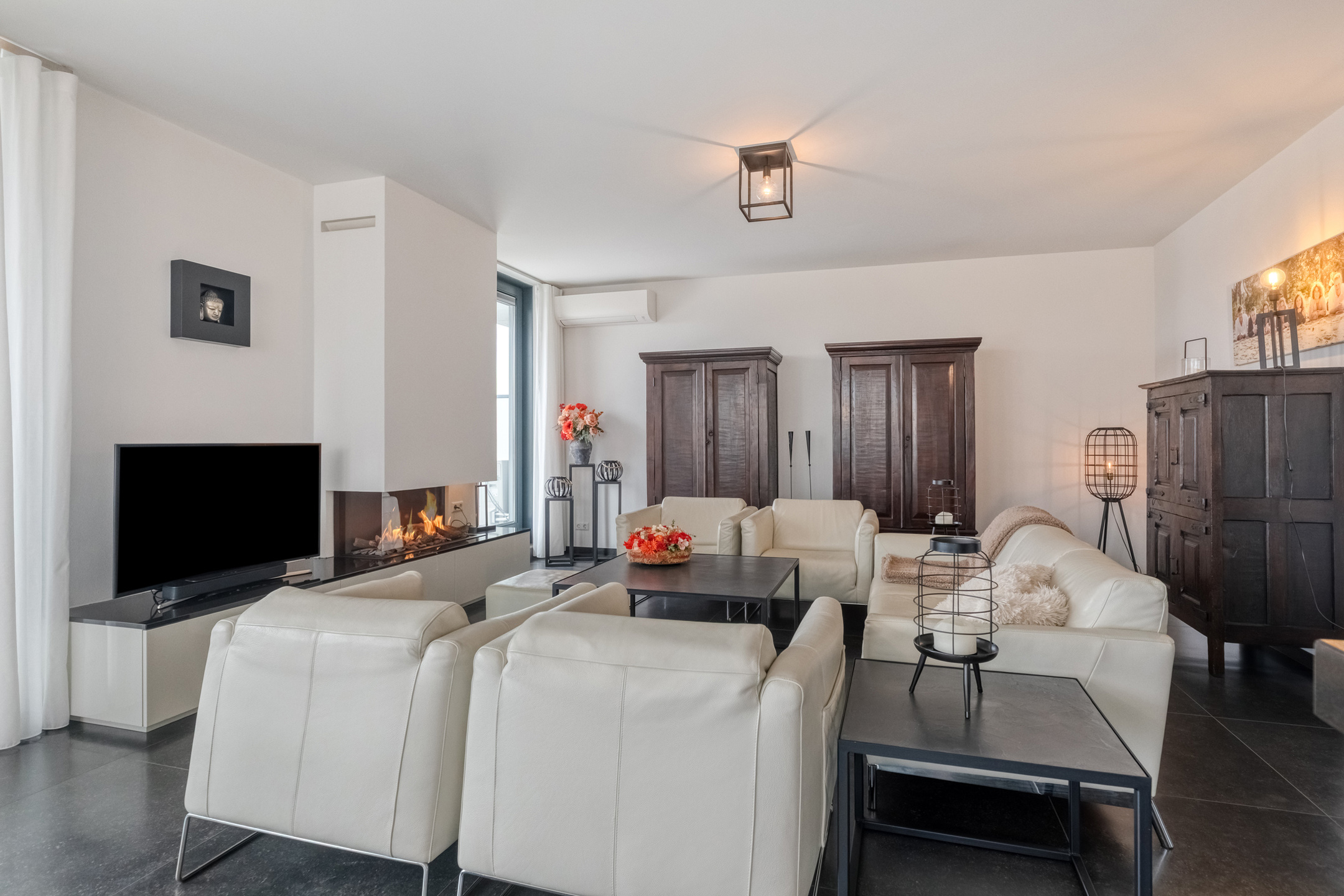 The living room is finished with a luxurious tiled floor, plastered walls, and a plastered ceiling. It features a gas fireplace for the cold winter days and air conditioning for the warm summer days. From the living room, there is access to the generous rooftop terrace through two luxury sliding doors and a hinged garden door.
