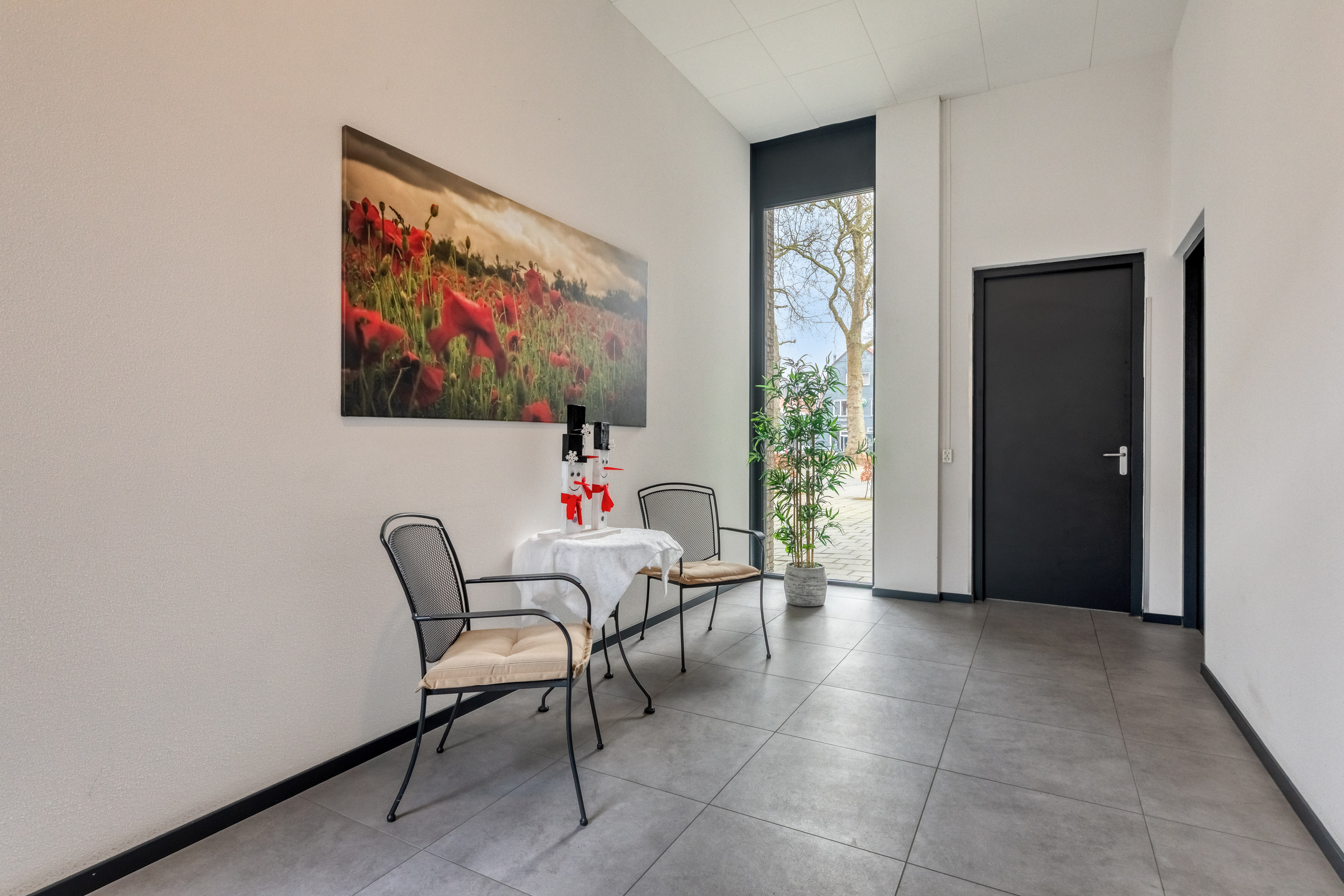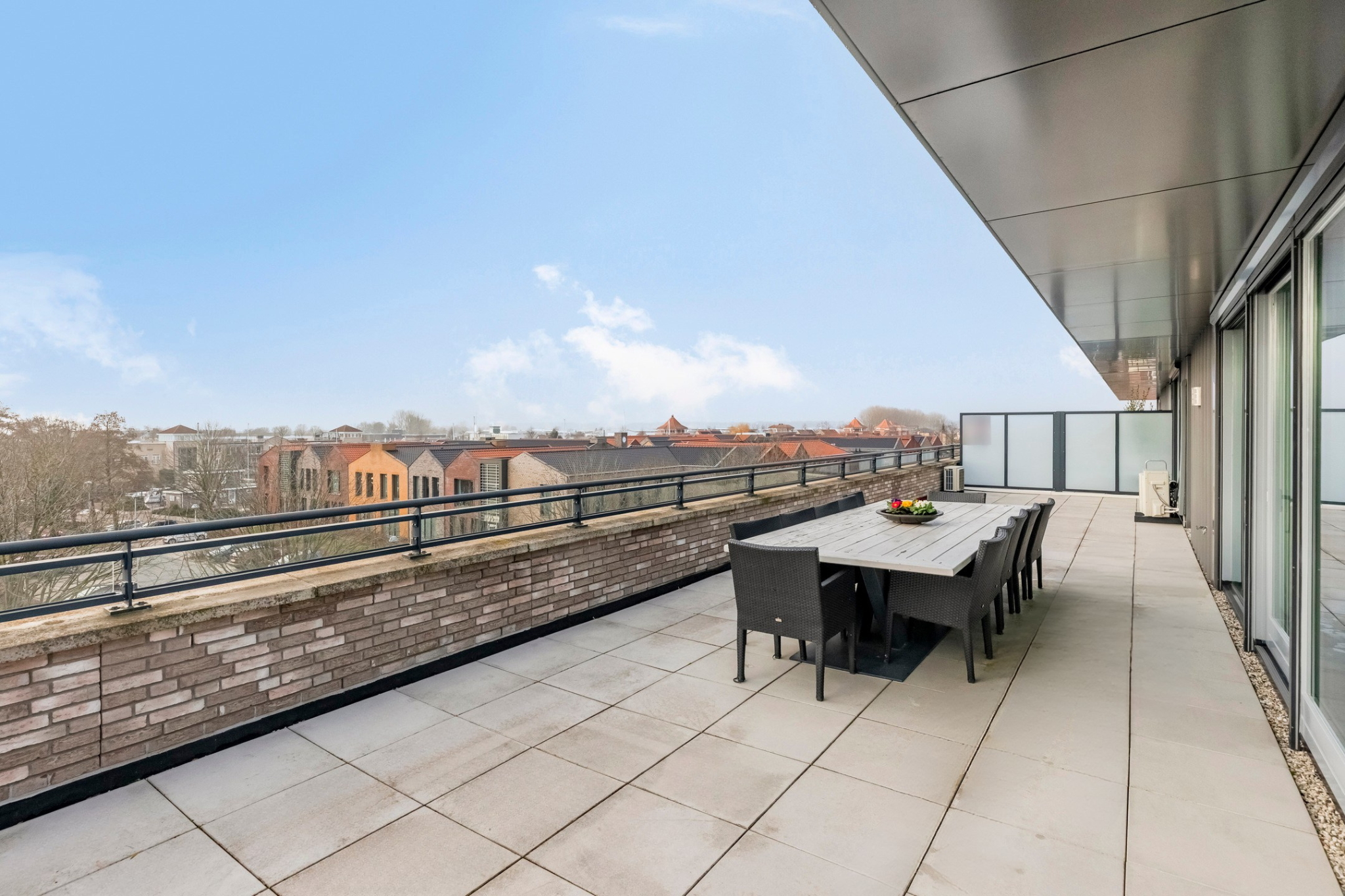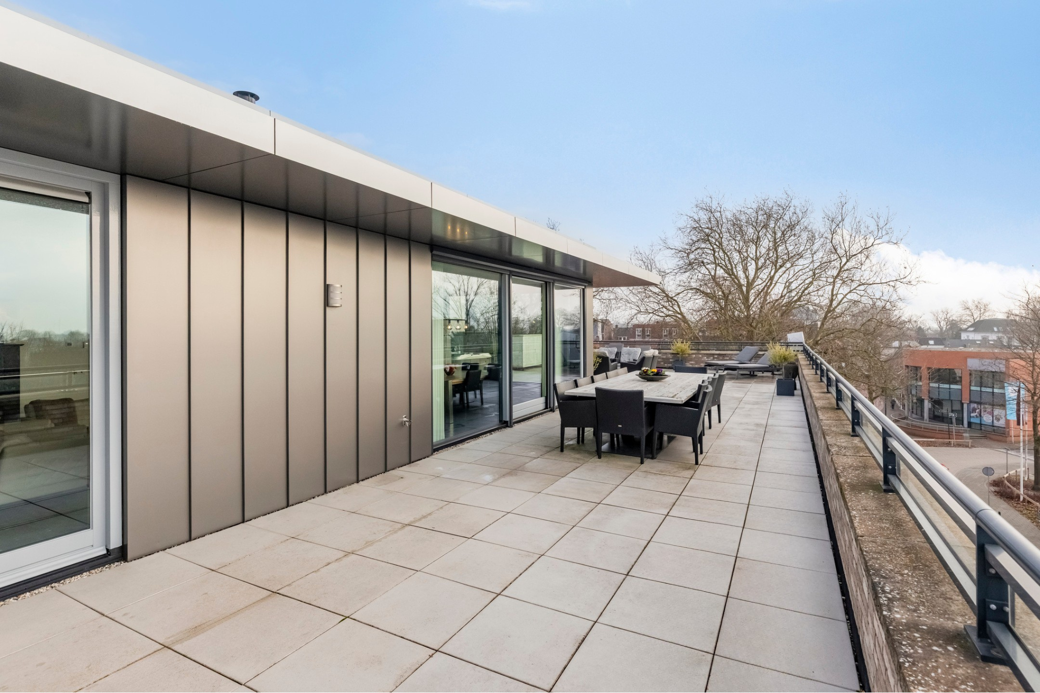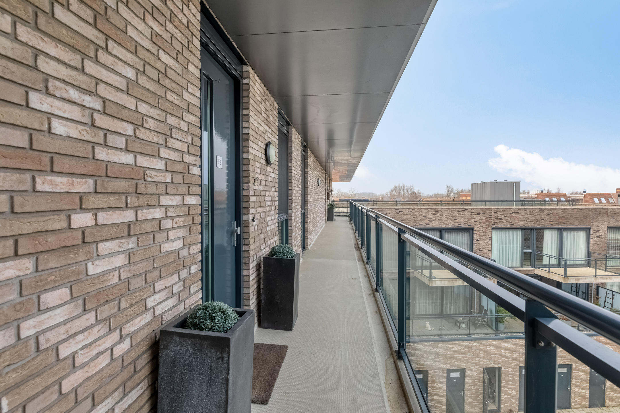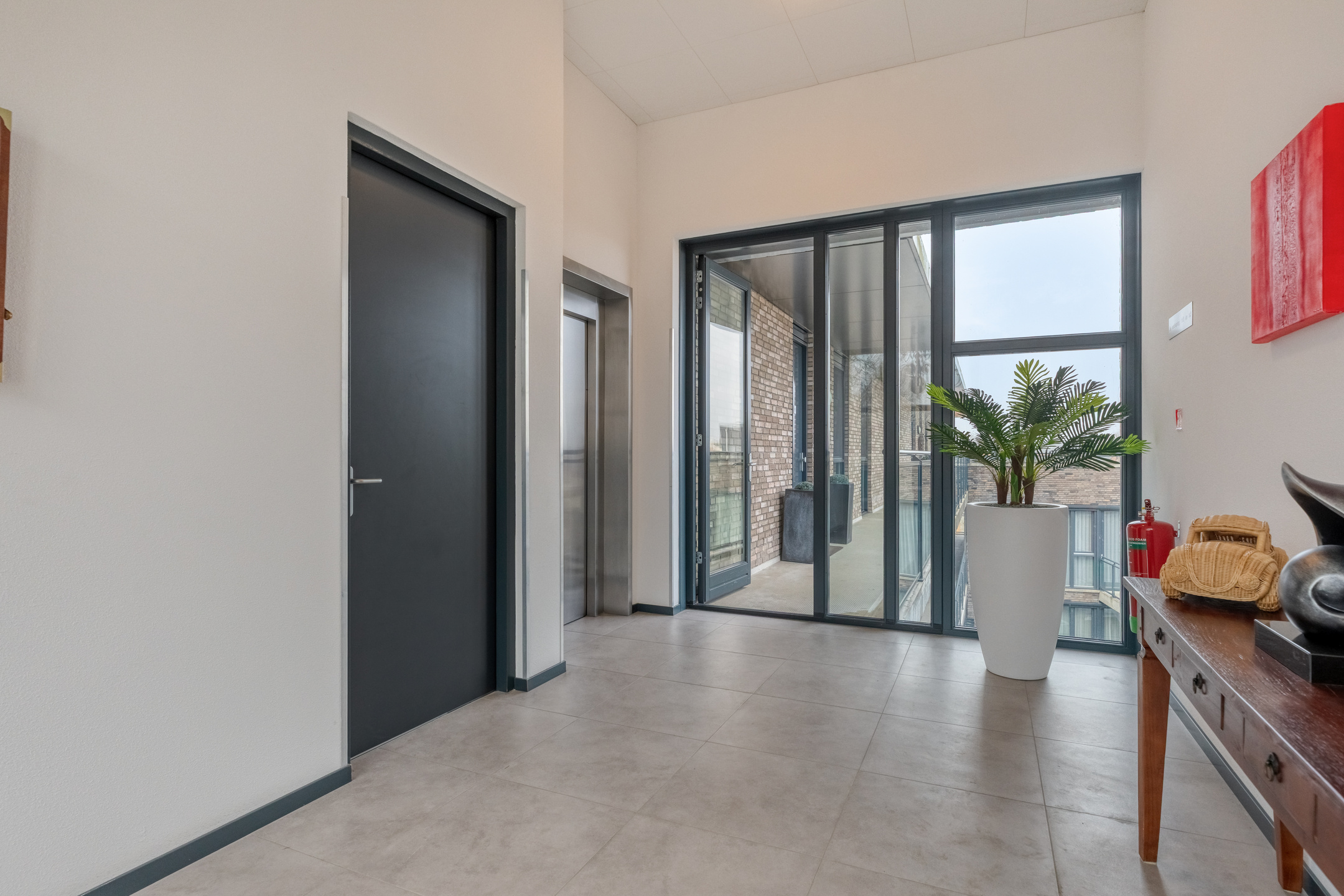 Via the elevator (or the stairs, if you are feeling ambitious), you reach the top floor of this modern apartment complex and walk along the covered gallery towards the entrance of the penthouse.