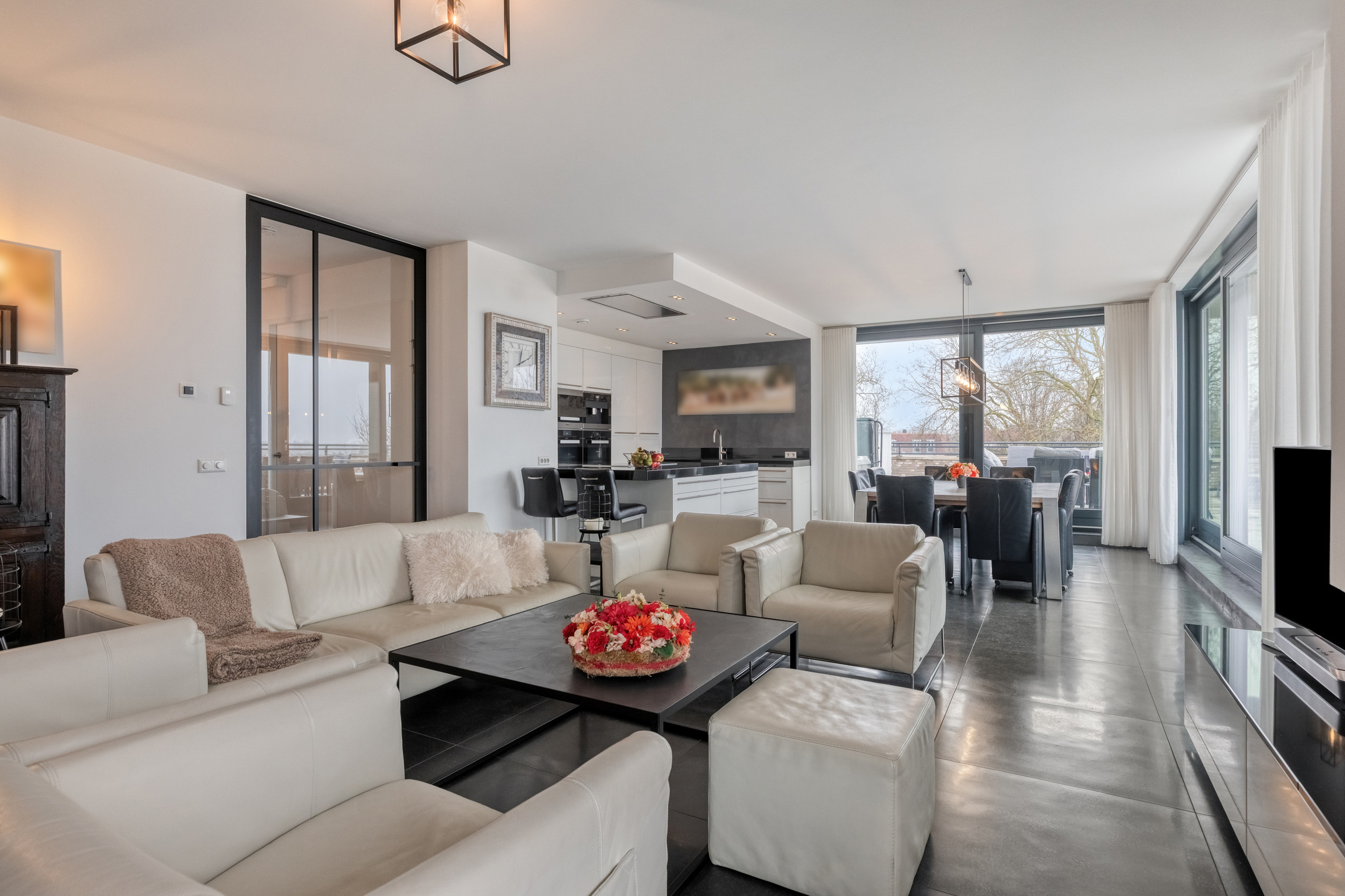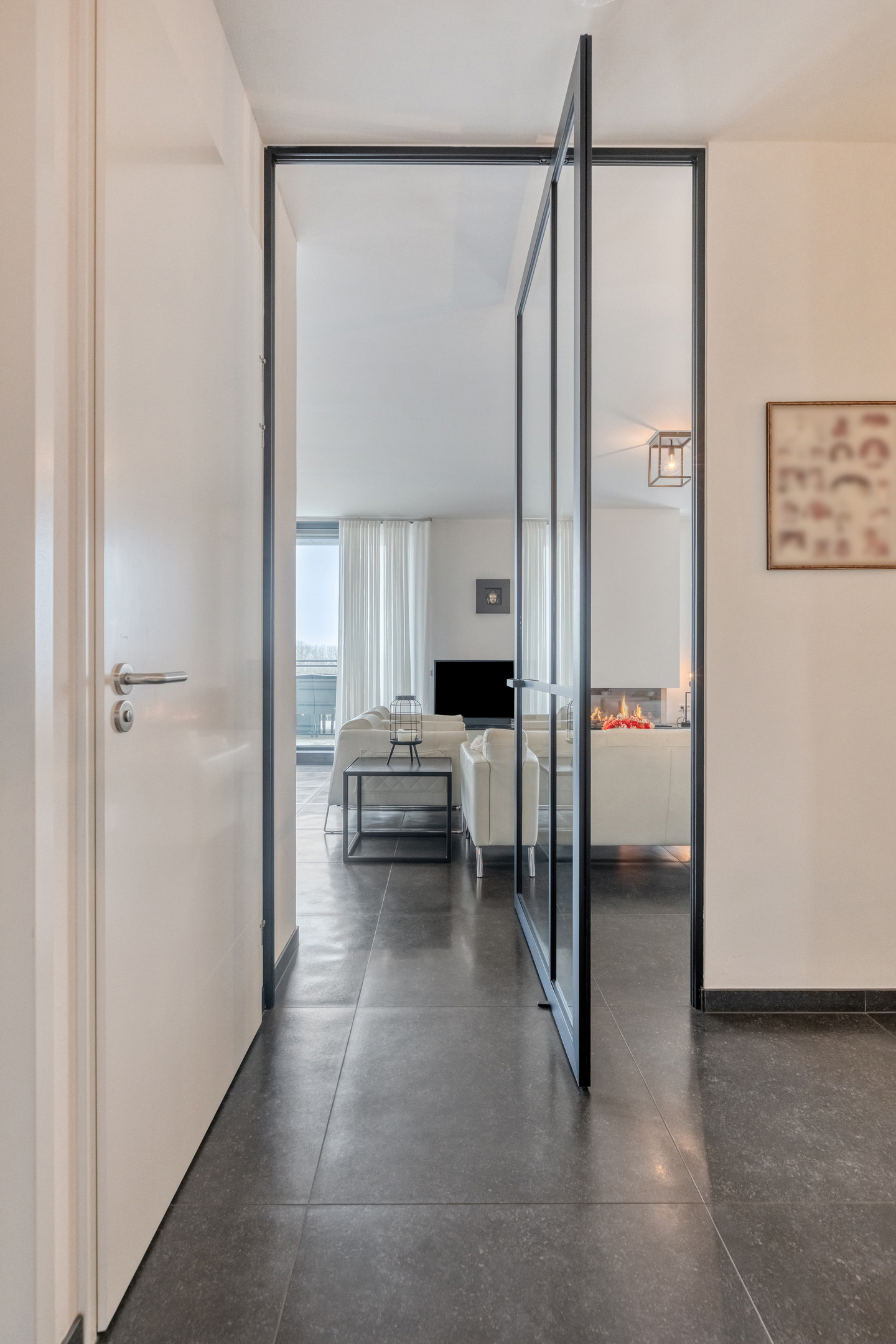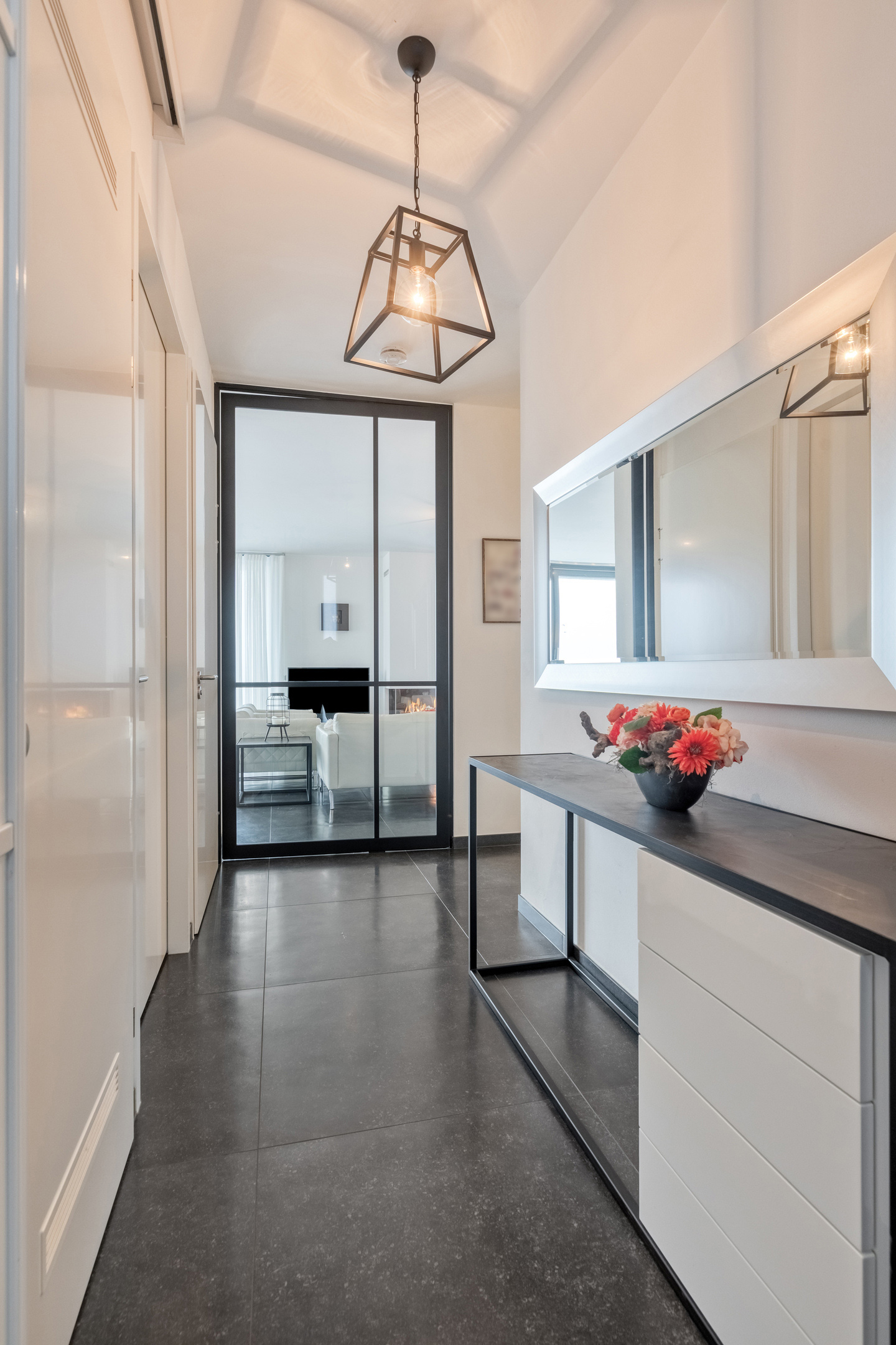 From the hallway, you enter the living area through a modern pivot door. You are immediately impressed by the luxurious appearance and the bright, spacious atmosphere.
