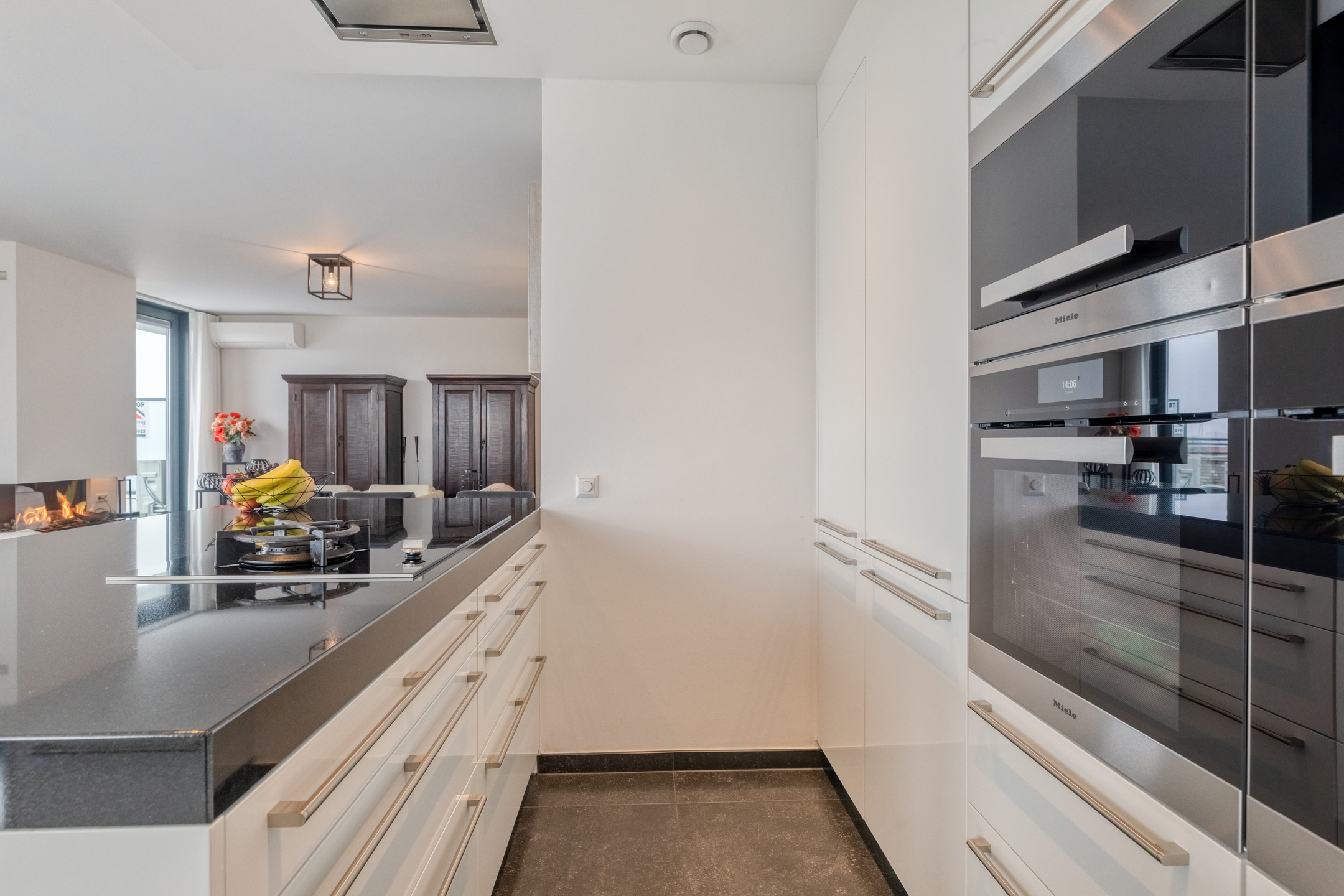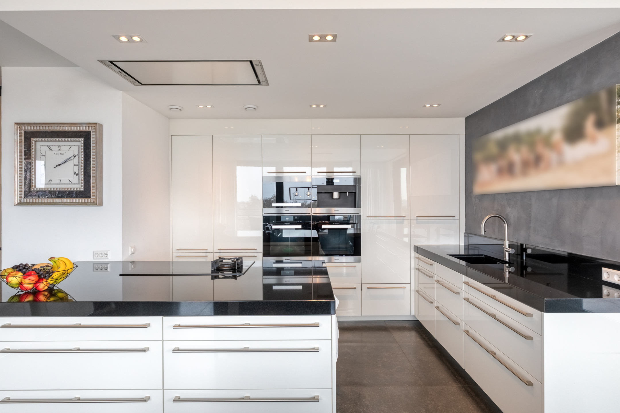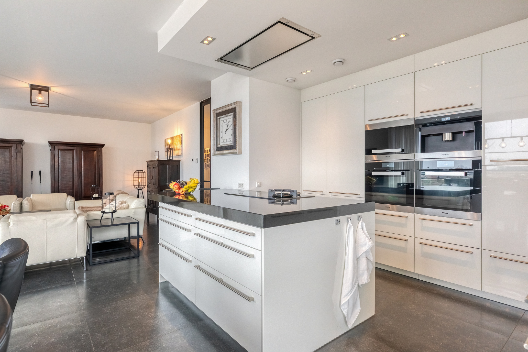 The modern open kitchen is finished with a tiled floor, plastered walls, and a plastered ceiling with recessed lighting. The luxury kitchen setup includes a high-quality granite countertop, sink, fridge-freezer combination, two electric ovens, coffee machine, high-pressure steam oven, dishwasher, extractor hood, and a cooking island equipped with an induction hob and a separate gas wok burner.