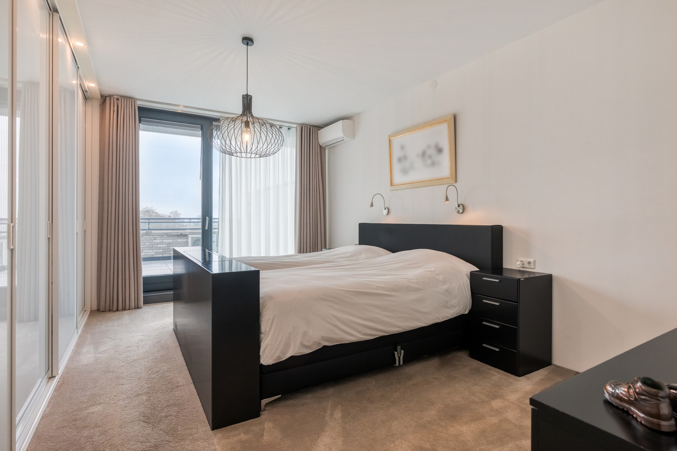 Bedroom 1 is finished with carpeted flooring, plastered walls, and a plastered ceiling. The room includes a built-in wardrobe wall, air conditioning, and provides access to the rooftop terrace.