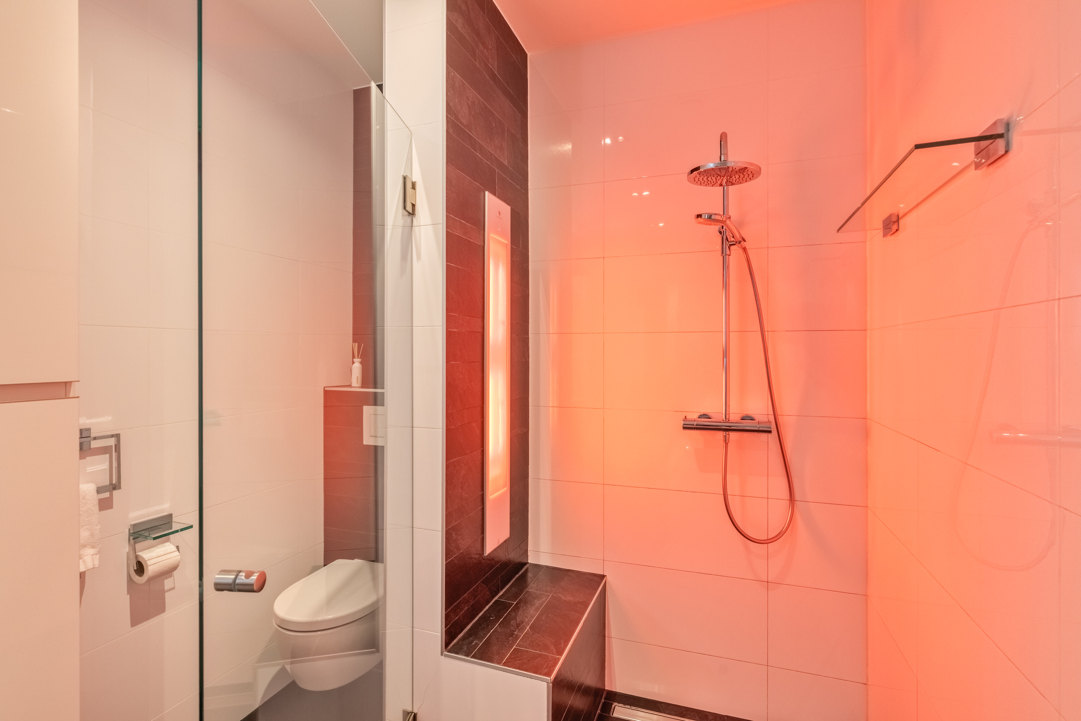 The modern bathroom is finished with a tiled floor, tiled walls, and a plastered ceiling. It is equipped with a bathtub, walk-in shower with Sunshower (infrared) and seating bench (including underfloor heating), second toilet, and a vanity unit with double washbasin.