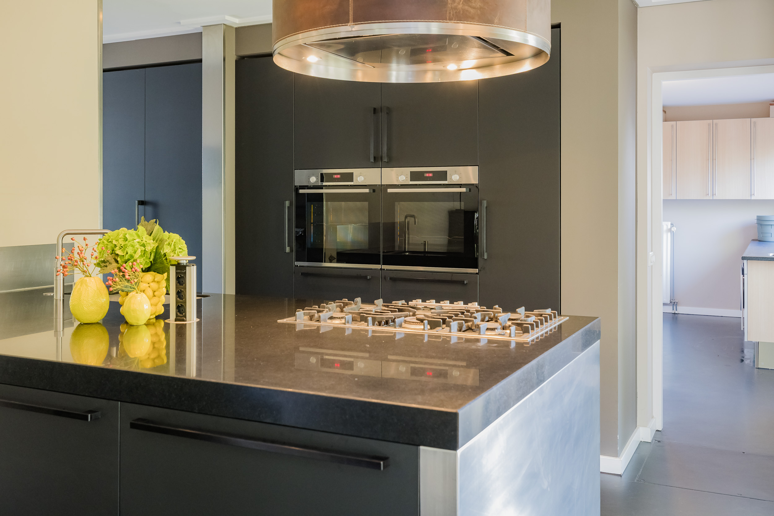 The modern open kitchen with cooking/sink island is fully equipped with high-quality Miele and Bosch appliances, including two ovens, a large freezer, and a large refrigerator. An added bonus: the kitchen has been enlarged by adding a room, which is equipped with an extra stainless steel worktop with sink.