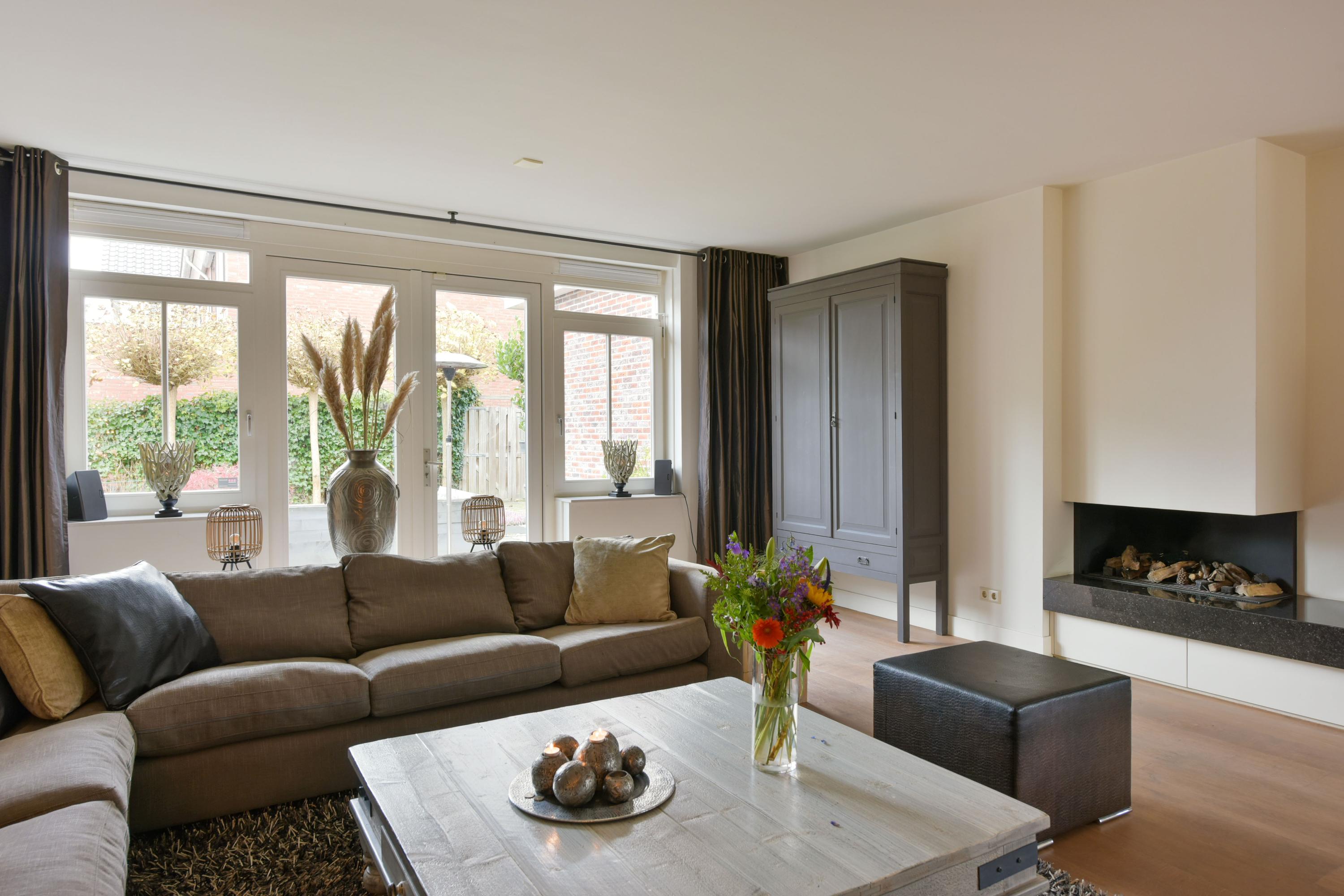 Step into the spacious living room, and you are struck by its light-filled character. The many windows allow natural light to flood in, creating a seamless connection between inside and outside. At the front of the house is the dining room with a charming bay window – a perfect spot to enjoy the morning sun at breakfast or host cozy dinners. The heart of the home features the open kitchen, with a large cooking island and cabinets on both sides offering everything a home chef could wish for. The kitchen is equipped with an induction hob, extractor hood, dishwasher, and Quooker. The tall cabinet wall houses a fridge-freezer, coffee machine, steam oven, and two combination ovens with warming drawers – everything within easy reach.