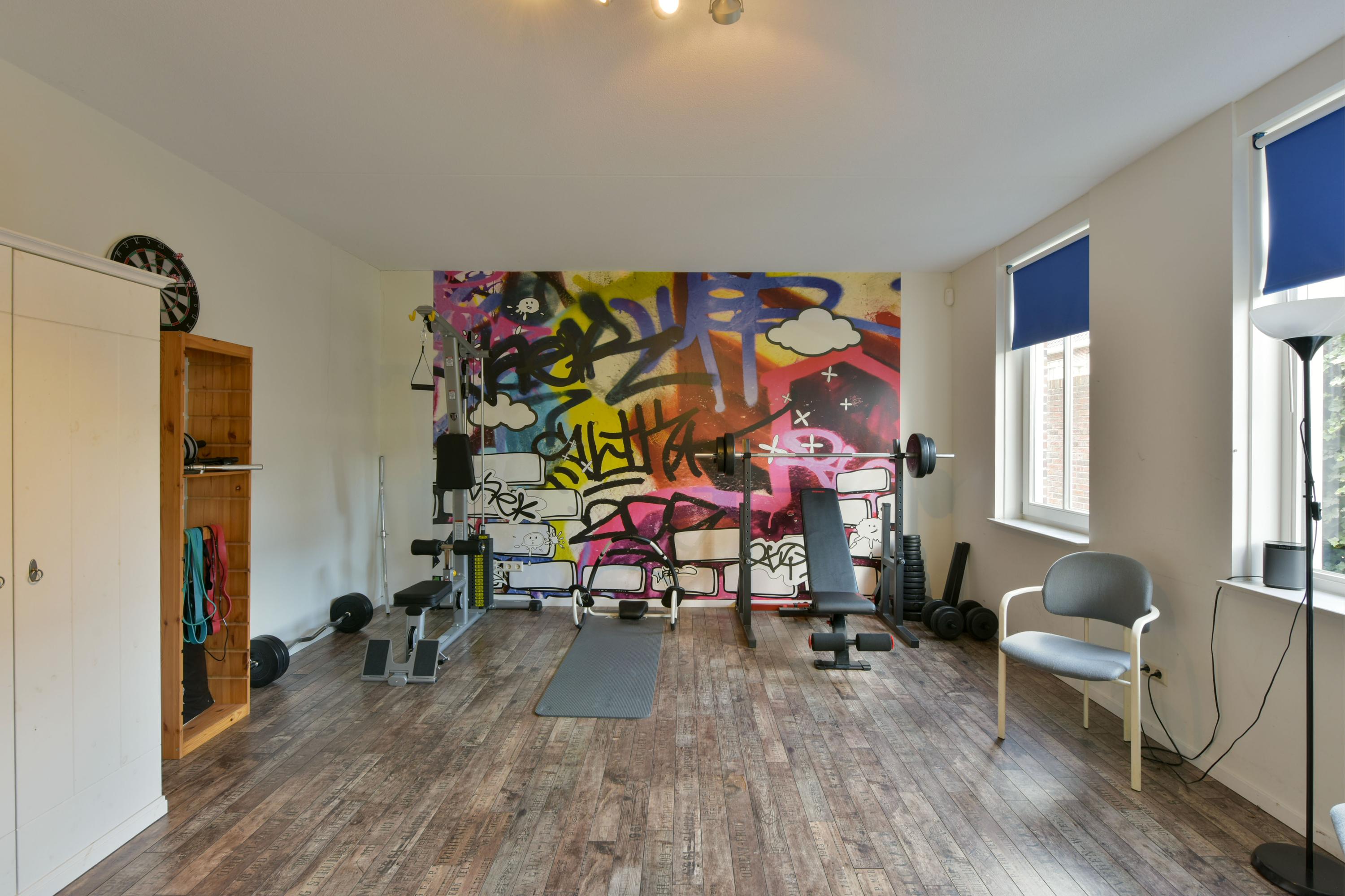 The large seating area at the rear exudes peace and comfort. A gas fireplace adds warmth and atmosphere, while the French doors provide direct access to the backyard, allowing you to enjoy sun and greenery all year round. From the living room, you can access the garage, seamlessly connecting indoor and outdoor spaces, living, and storage. From the kitchen, a door leads to a second hallway with its own entrance, providing access to a multifunctional room. Currently used as a gym, this space is equally suitable as an office, practice, or playroom thanks to its private entrance. The ground floor is finished with a beautiful French oak floor with underfloor heating, adding warmth and style, with the exception of the garage.