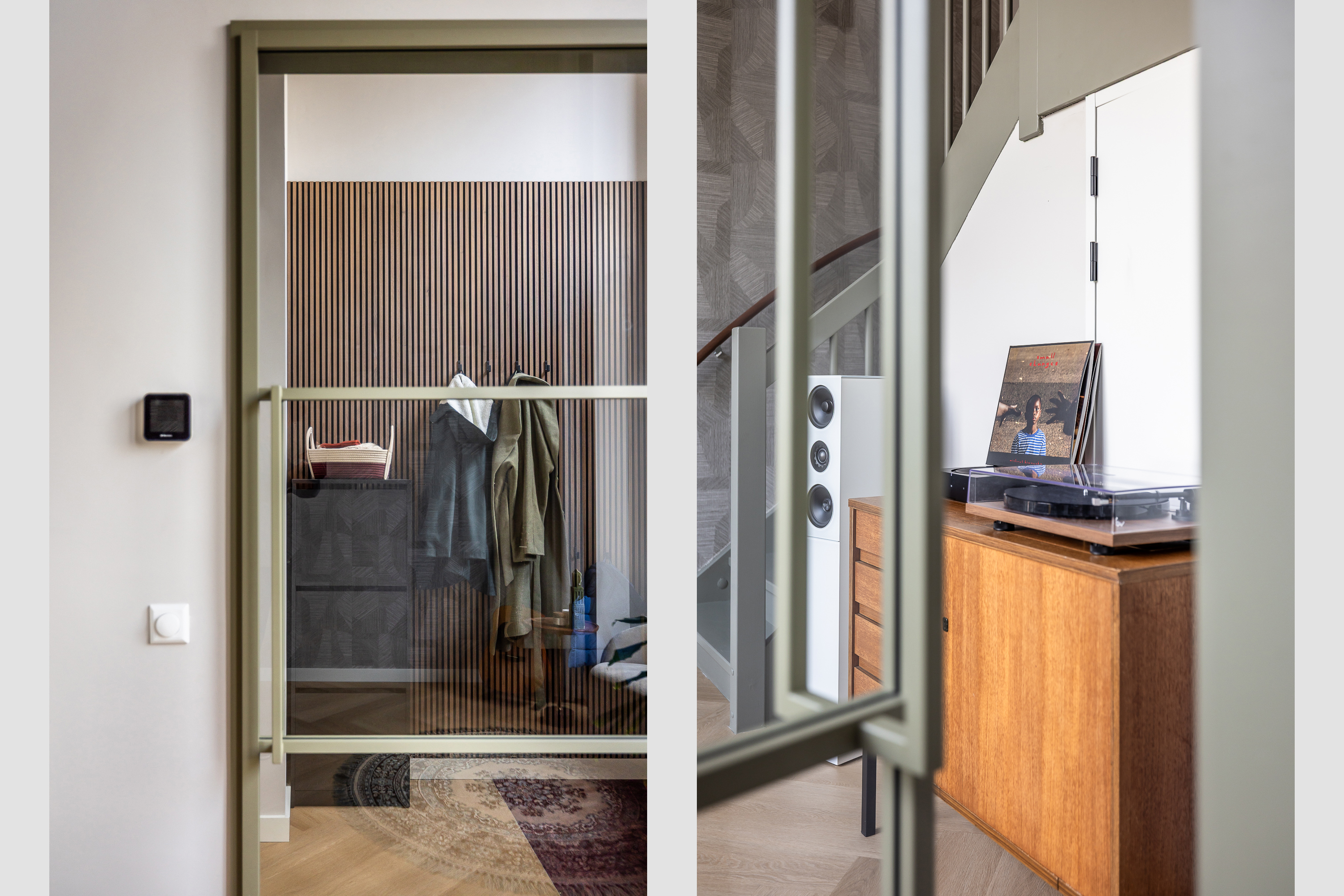 Entrance hall with toilet. The hallway is spacious enough to easily store a pram. From here, you enter the front living room with its impressive floor-to-ceiling windows and a ceiling height of 4.76 metres. This space connects seamlessly to the slightly elevated kitchen-dining area. The bespoke kitchen offers ample space for a dining table. There is a large storage cupboard beneath the stairs. From the kitchen, you have access to the patio and the shared inner garden.