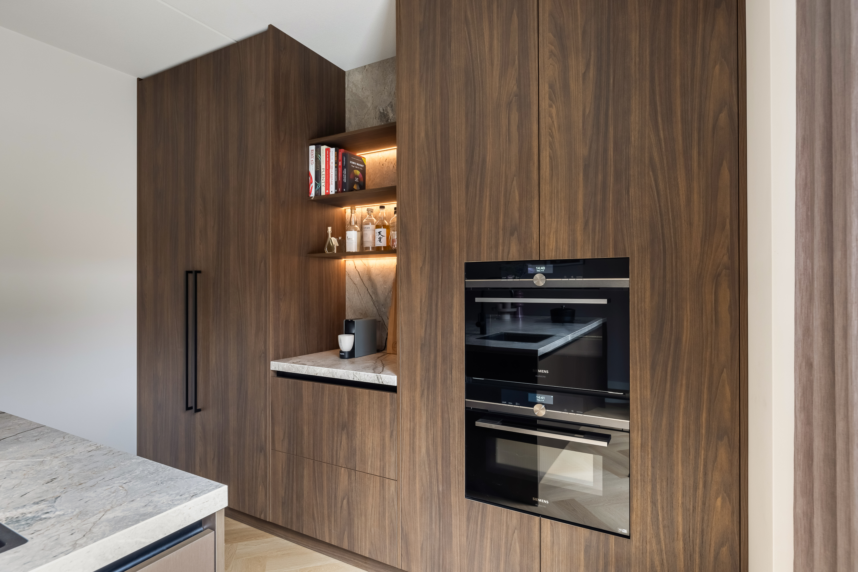 Every element of this home has been thoughtfully designed. The atmosphere is warm, contemporary and luxurious. The bespoke kitchen is a real showstopper, featuring cabinetry that extends all the way to the ceiling and state-of-the-art appliances that can even be controlled via Wi-Fi. Preheat the oven while you’re on your way home, bake your bread rolls before you even head downstairs, or start cooking your eggs straight away. Pure luxury. Every detail has been carefully considered — have you noticed the perfectly aligned oven? We’re fans.