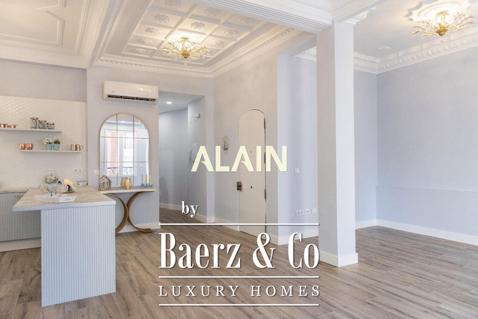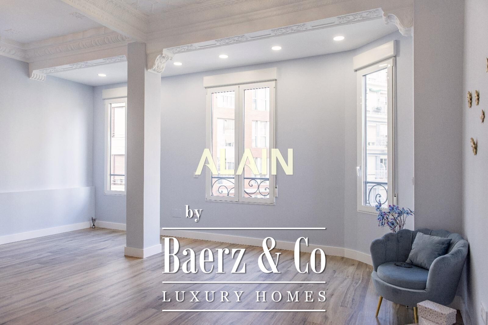 Apartment Valencia is offered within the lively Ruzafa quarter, occupying 140 m² on the second floor of a distinguished building. The stately entrance and generous ceiling heights, complemented by intricate original moldings, frame spaces defined by both heritage and contemporary clarity.