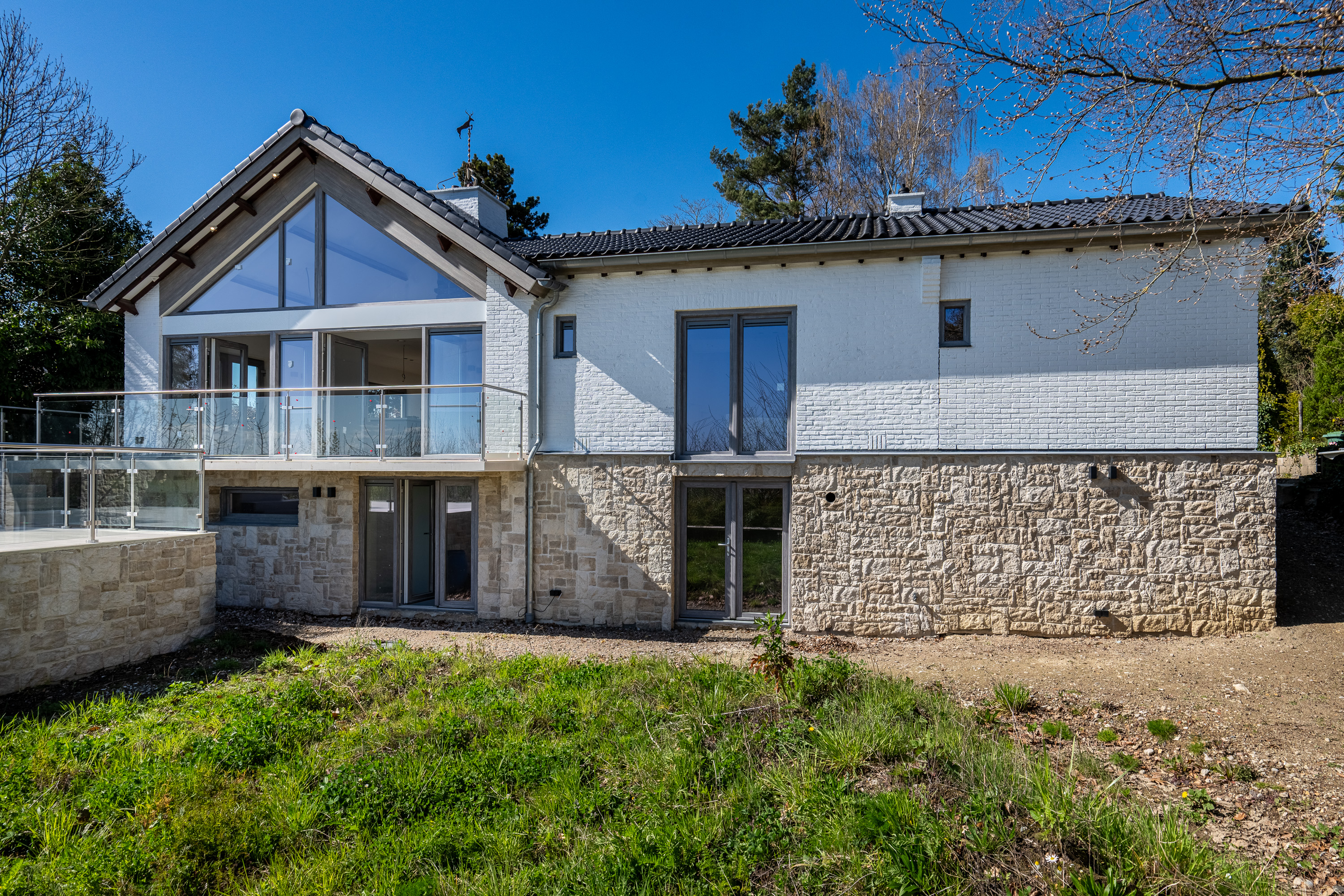 The living area is located at the rear and is fully oriented toward the panoramic view. Thanks to the large windows, natural light floods in, and the indoor and outdoor spaces blend seamlessly. With an XL garage, a practical layout, and all essential living amenities on the ground floor, this home combines luxury with lifetime-ready living. The home features a spacious, multifunctional basement and a practical attic.