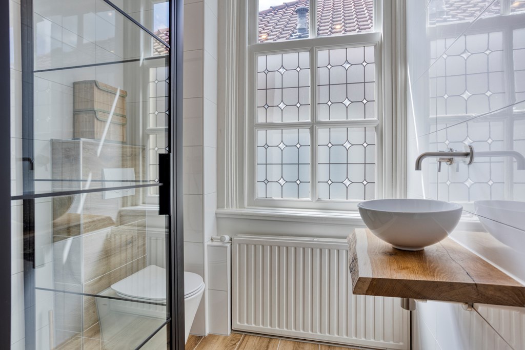 The room feels serene—ideal for unwinding after a long day. The other bedrooms are also bathed in light thanks to large windows and retain their original wooden floors. The bathroom is stylishly tiled and equipped with a rain shower, a robust oak vanity with vessel basin and integrated tap, and a second toilet. Everything is done in light, natural tones, creating a fresh, luxurious look.