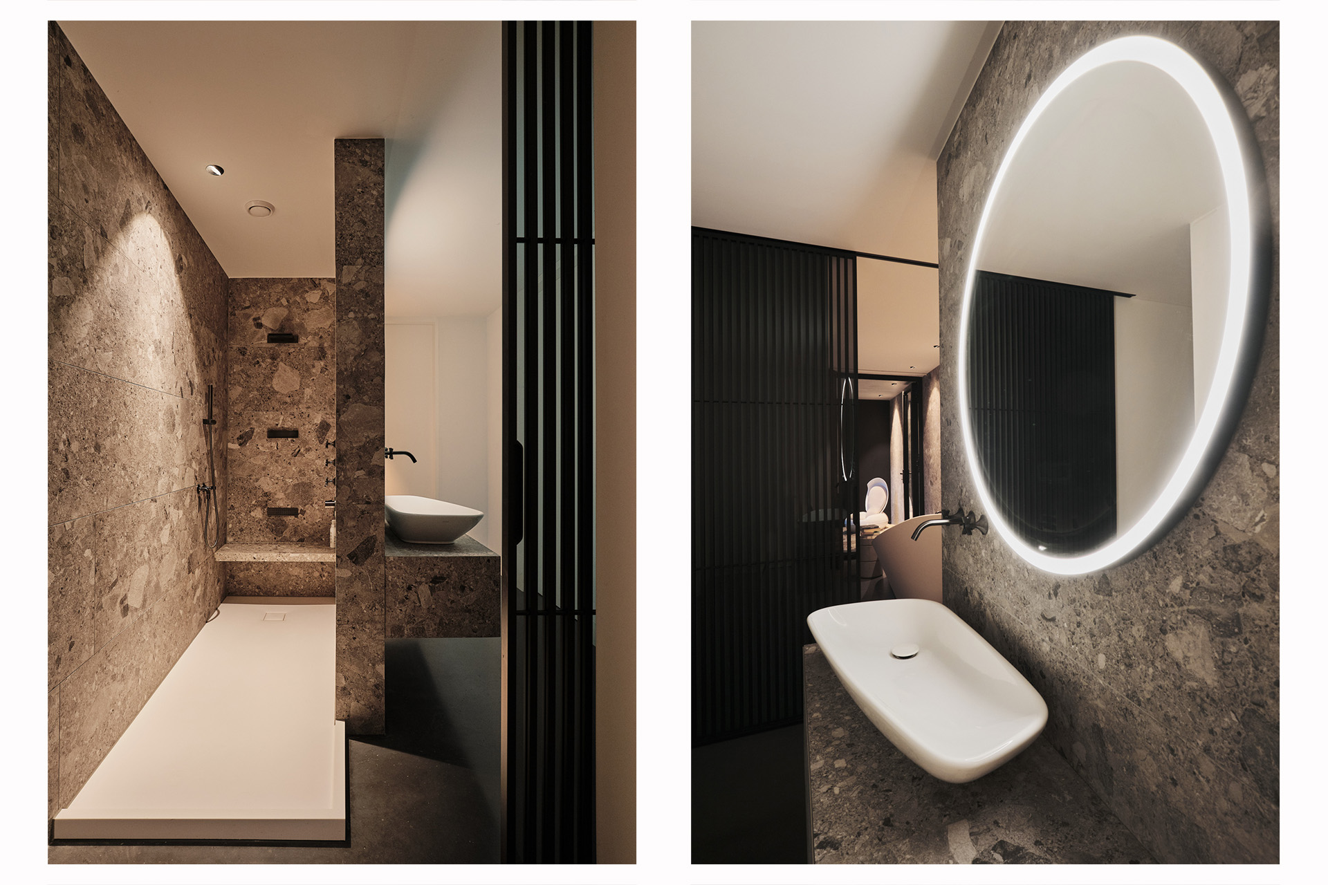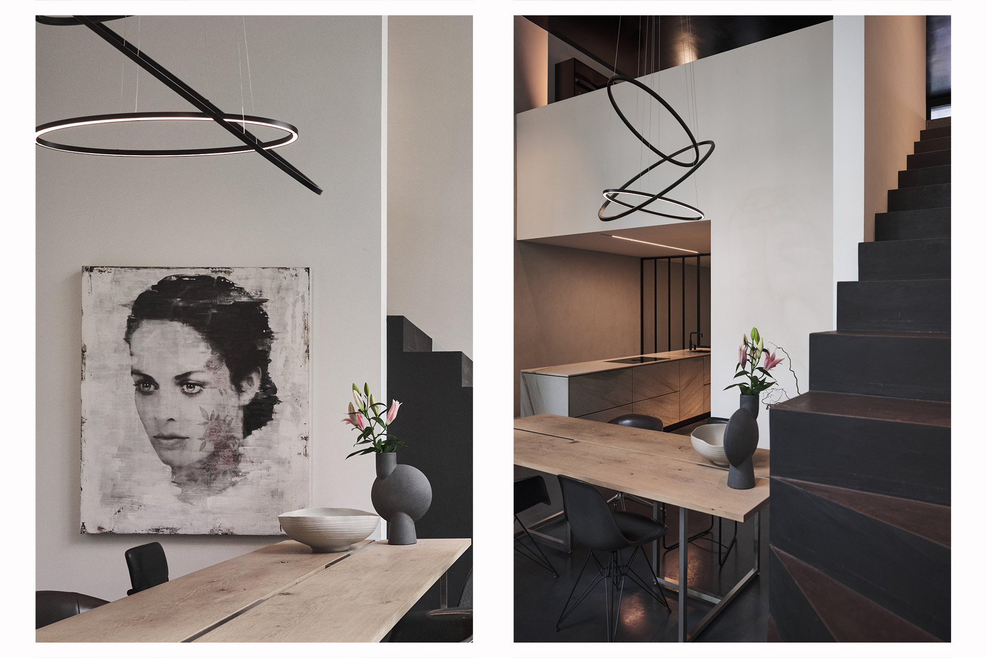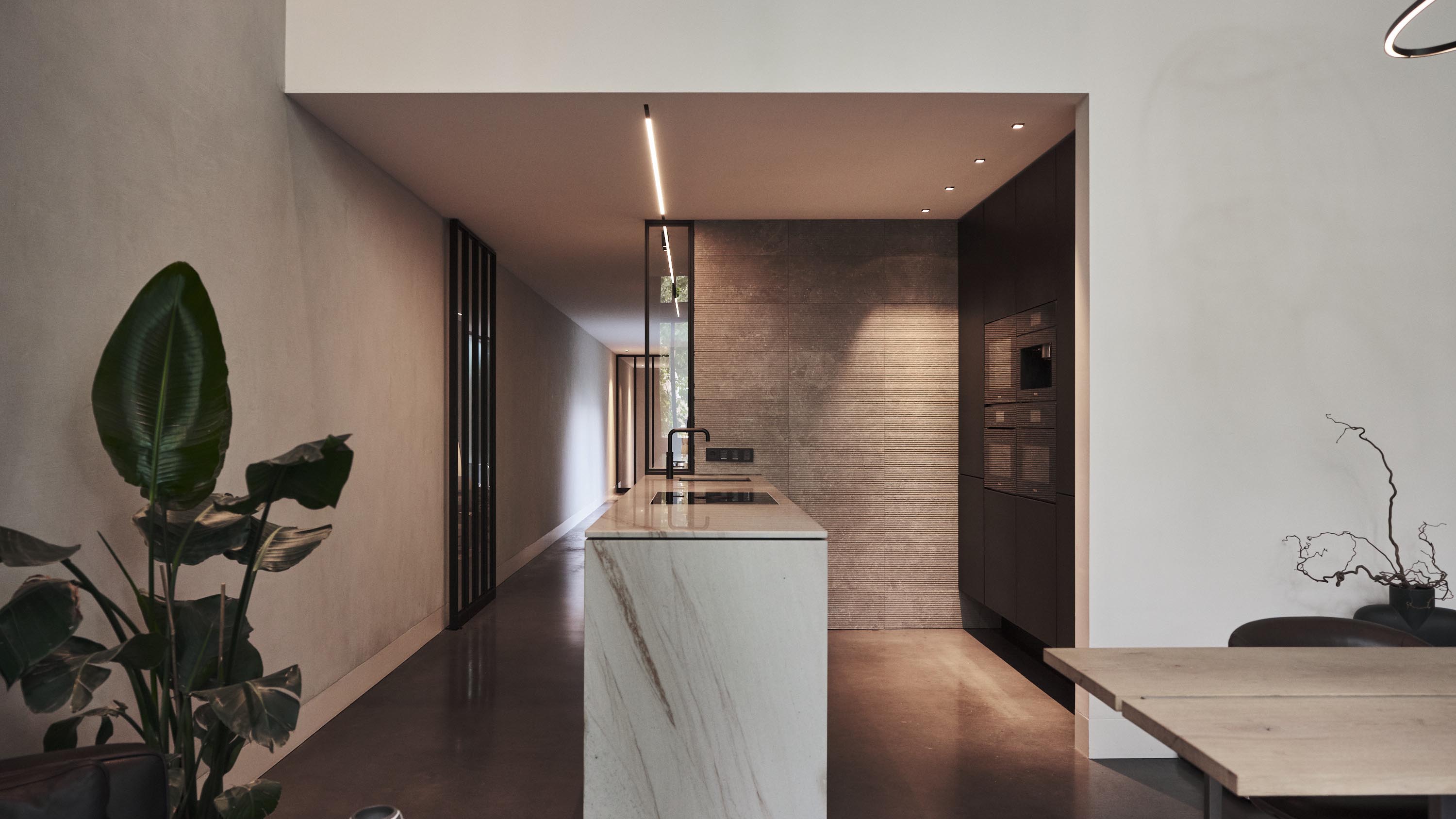 De woning aan de Cedron vormt een serene oase met hoogwaardige materialen en een iconische verticale glazen schacht met een Toscaanse kurkeik als levende sculptuur. De presentatieruimte aan de Nieuwstraat is juist een ingetogen, doordachte werkruimte waarin helderheid, focus en creativiteit centraal staan.