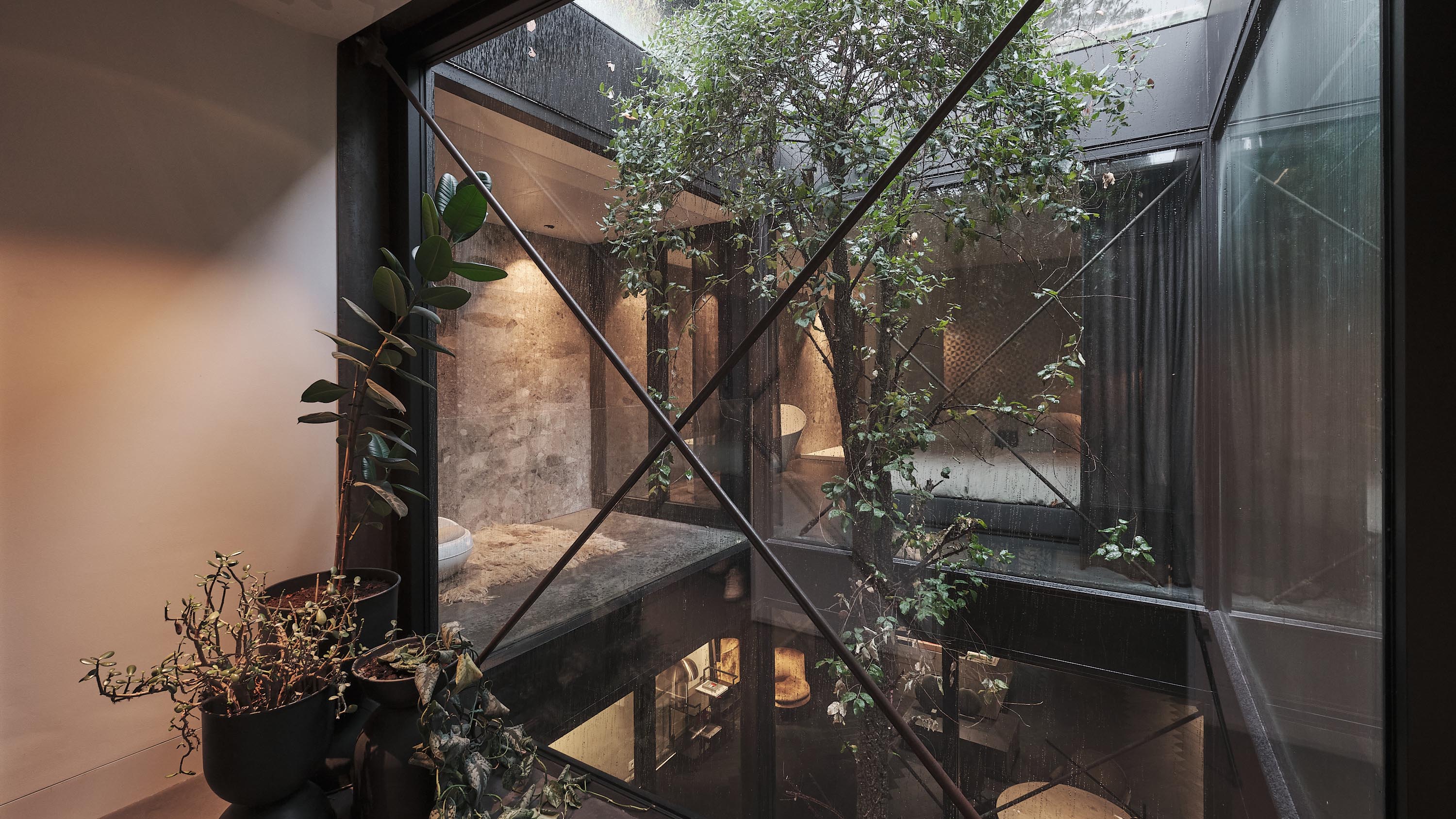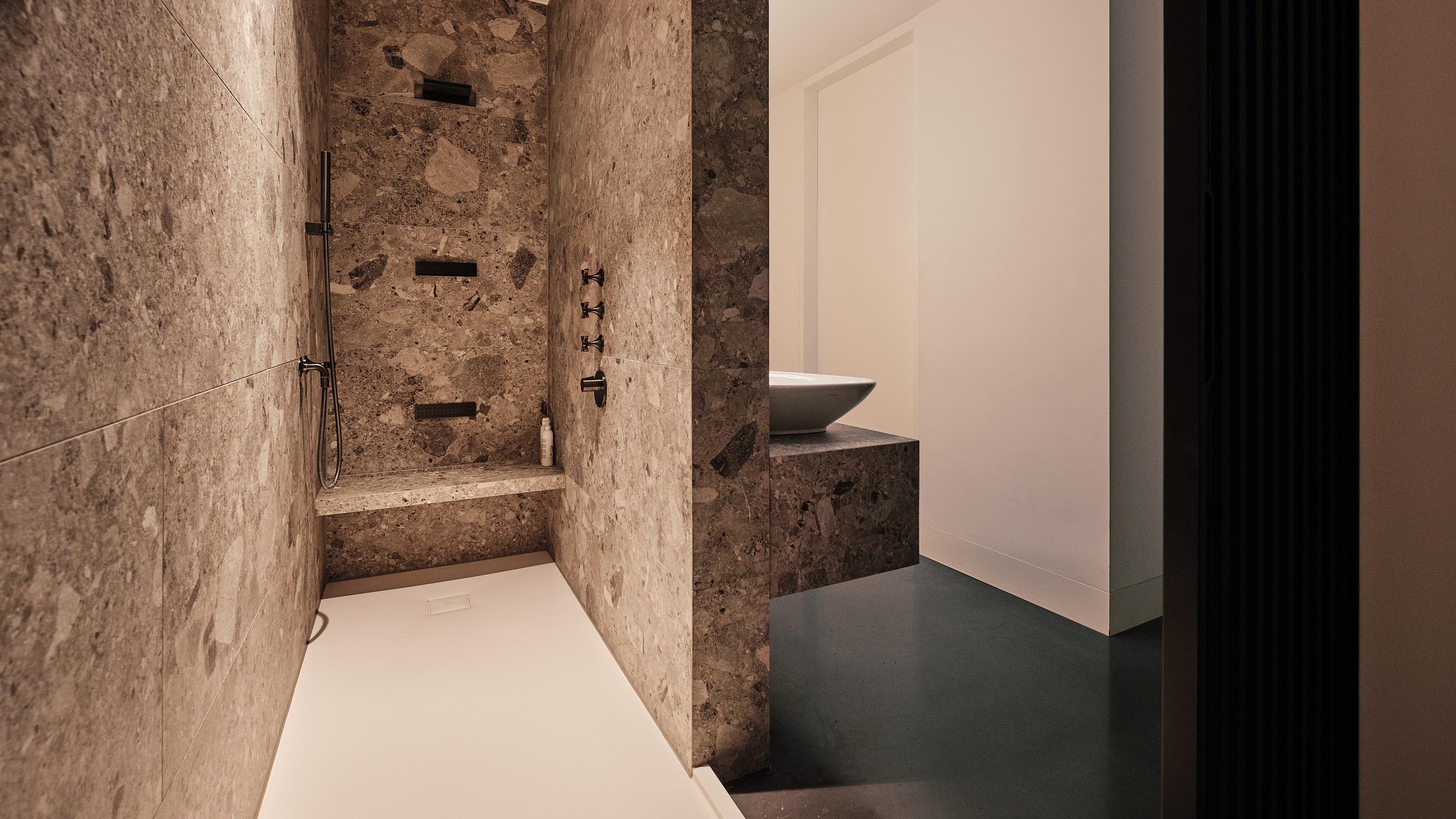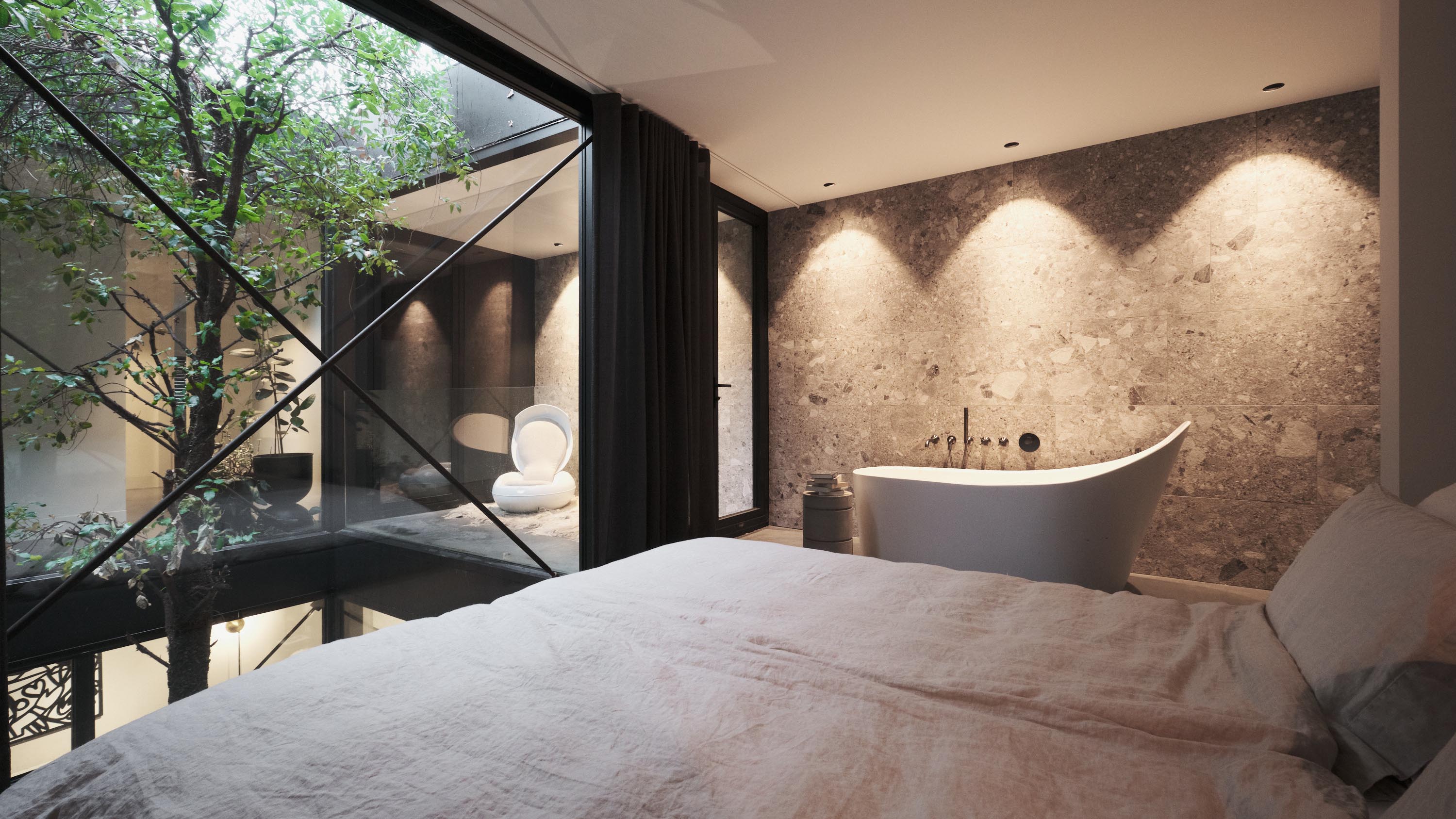 De woning aan de Cedron vormt een serene oase met hoogwaardige materialen en een iconische verticale glazen schacht met een Toscaanse kurkeik als levende sculptuur. De presentatieruimte aan de Nieuwstraat is juist een ingetogen, doordachte werkruimte waarin helderheid, focus en creativiteit centraal staan.