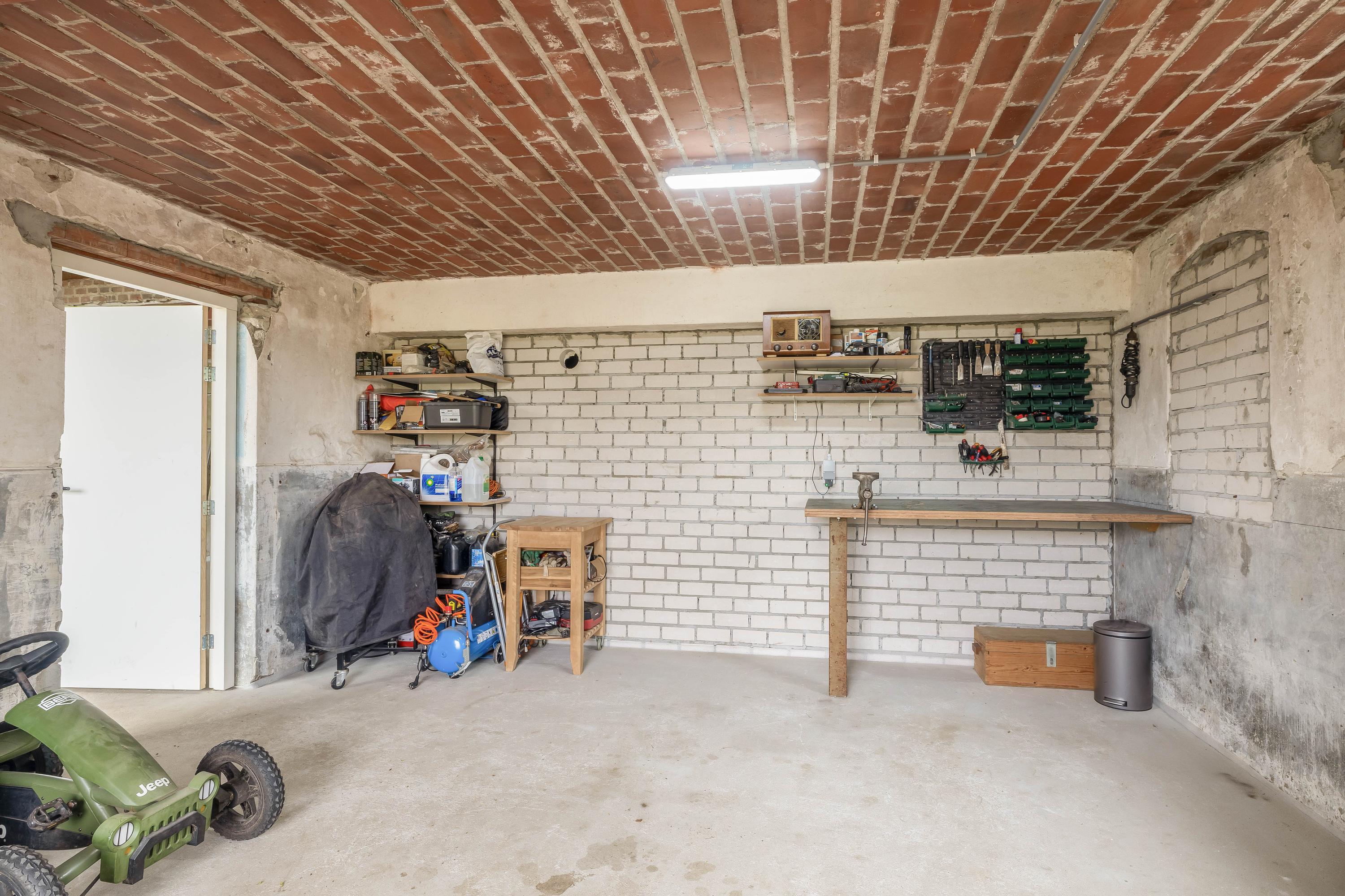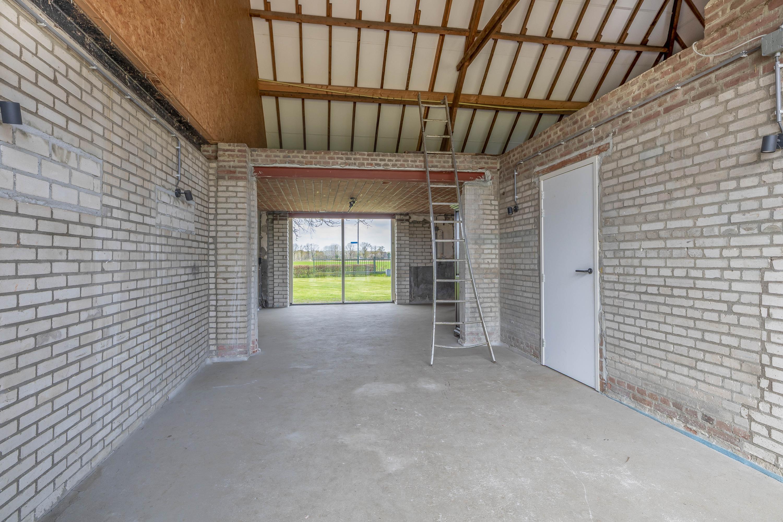 Adjacent to this is the indoor rear annex which, alongside the indoor garage, offers a considerable amount of additional usable space. This forms a solid foundation and was designed with versatility in mind. The rear annex is therefore ideally suited to a variety of uses, such as independent living accommodation (informal care), an office or practice space with meeting facilities, or a comfortable guest house. The space features a refurbished concrete floor with underfloor heating, brick walls and exposed wooden beams that enhance the rustic atmosphere. Part of the space has a mezzanine, and there is plenty of natural light. French doors in the rear façade provide a direct connection to the garden. There is also a separate toilet with a wall-hung toilet and washbasin. The rear annex also provides access to the built-in garage. The garage is accessible from the courtyard via a wide entrance door.