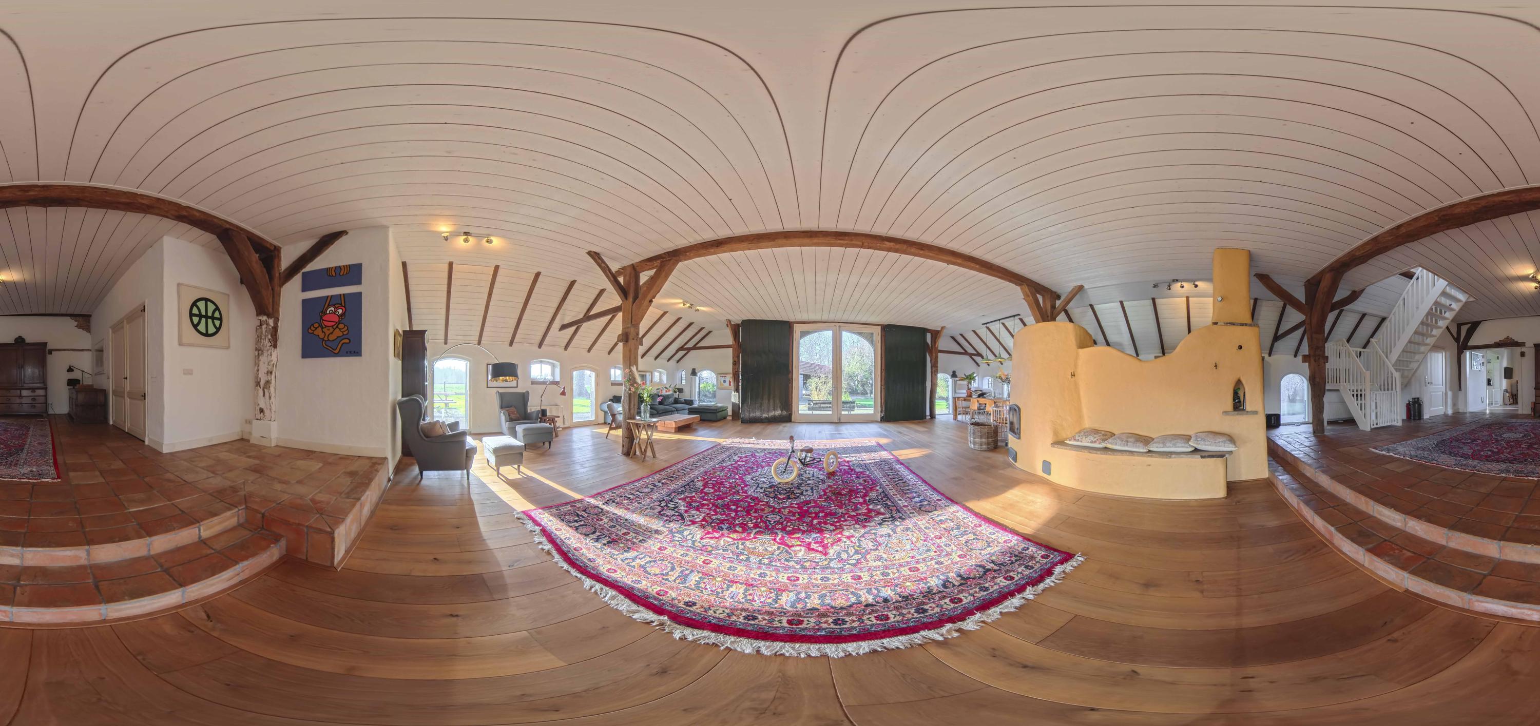 The barn is a fantastic space: over 150 m² of living space, brimming with atmosphere and rural charm. The floor is covered with oak planks and the old trusses still stand proudly in the room. In the heart of the space is a beautiful clay stove. These stoves are loved for their efficient heating, because in addition to keeping the living room warm, they also heat the water. The barn doors—the opening is now filled with glass—have been moved back on the inside and are a reminder of the barn's former function, as this is where the cows used to stand.
