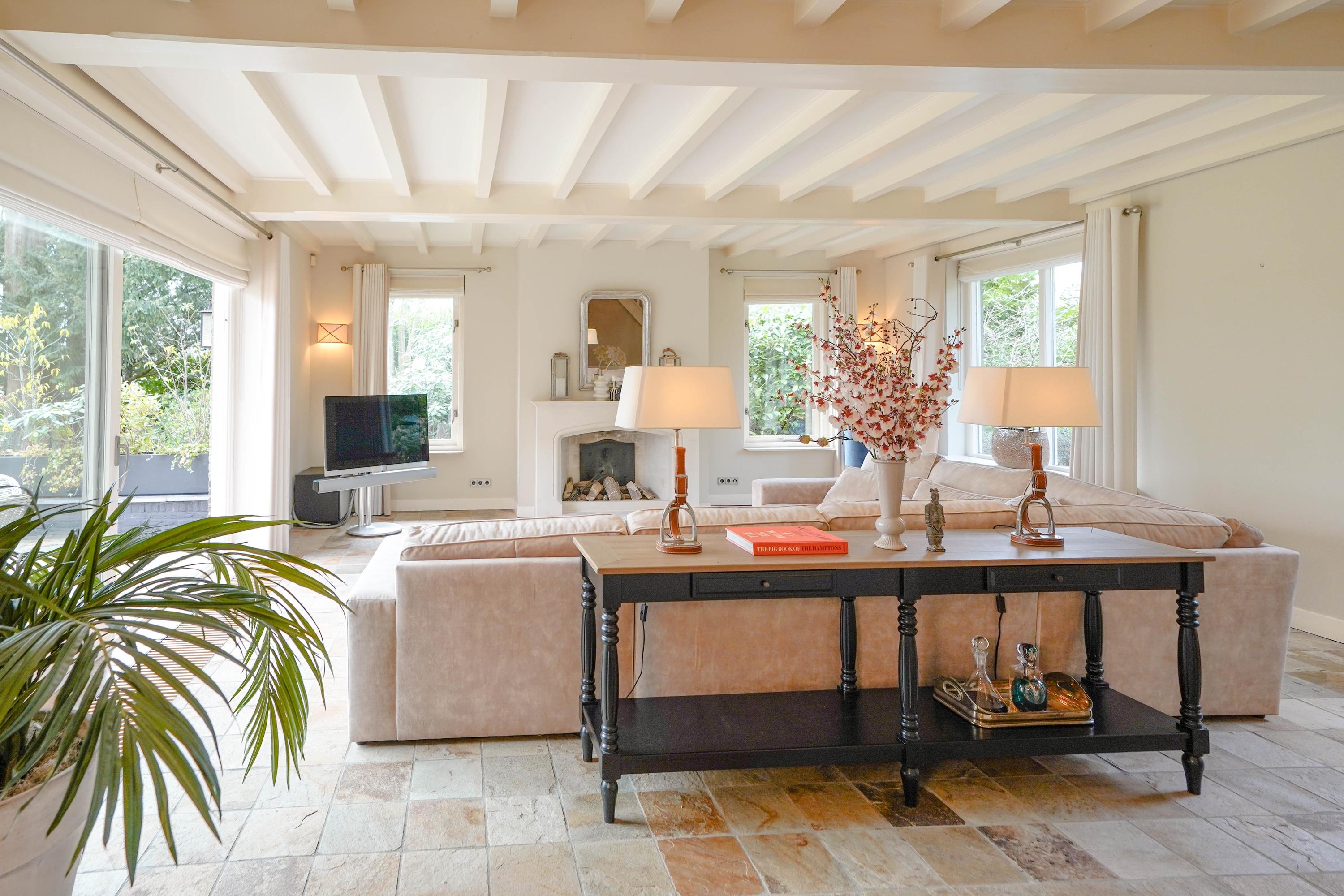 Beyond the formal entrance, the ground floor is arranged for natural light and easy flow, with an elegant living room featuring a sandstone fireplace and direct access to sunlit terraces. A spacious kitchen, utility room, and conservatory—facing the garden, water, and reserve—anchor daily life in a calm rhythm. The ground floor benefits from underfloor heating, and the conservatory is cooled by air conditioning. The villa includes a double garage, several parking spaces, and a certified alarm system.