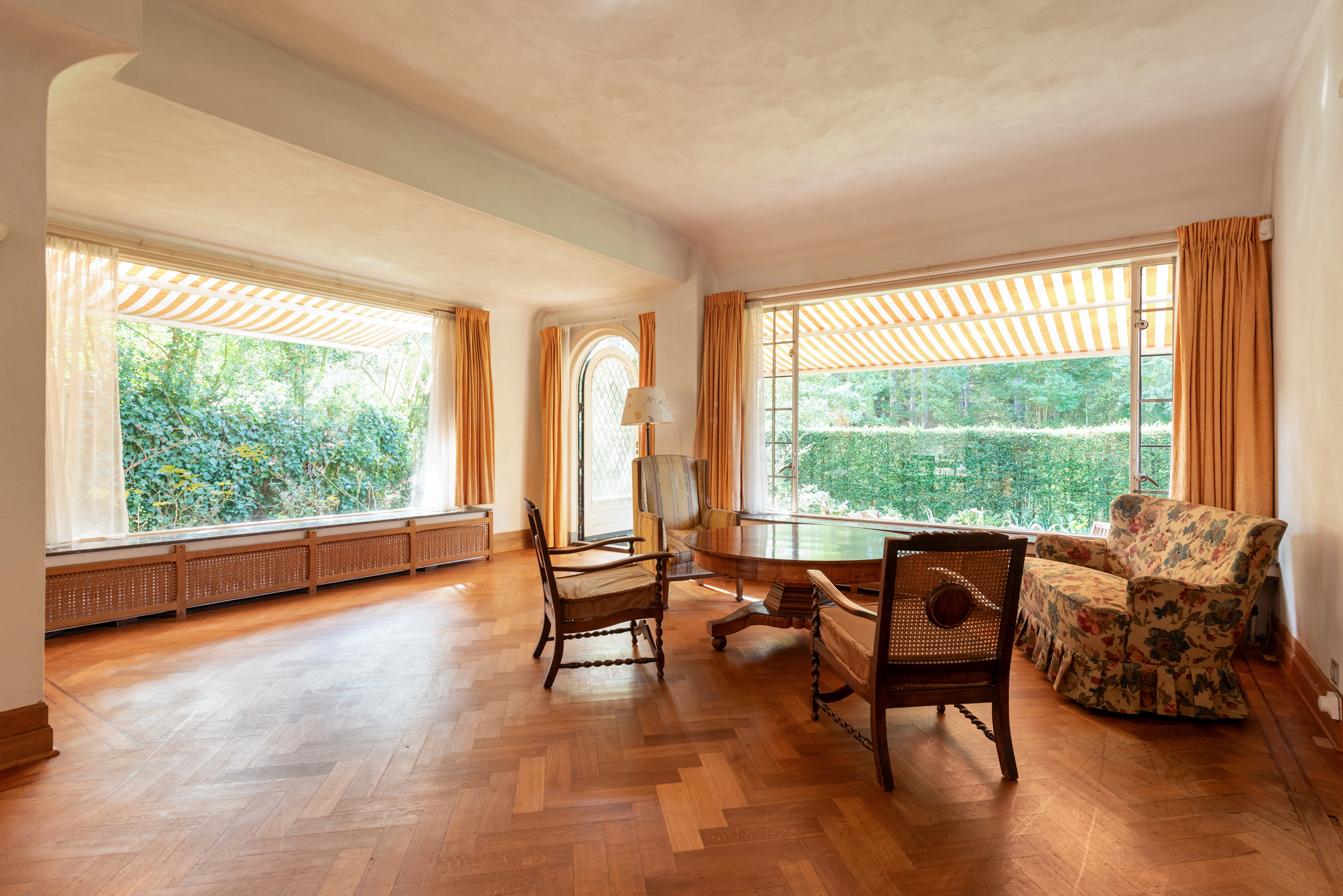A spacious hall welcomes you with mosaic flooring, leading to an elegant living and dining area with stained glass sliding doors, fireplace, and marble windowsills. This flowing space opens directly to the garden, inviting natural light and outdoor ambiance. The kitchen, set with a semi-open plan and direct garden access, adjoins a practical utility room as well as a cellar of 23 m² arranged in three rooms.