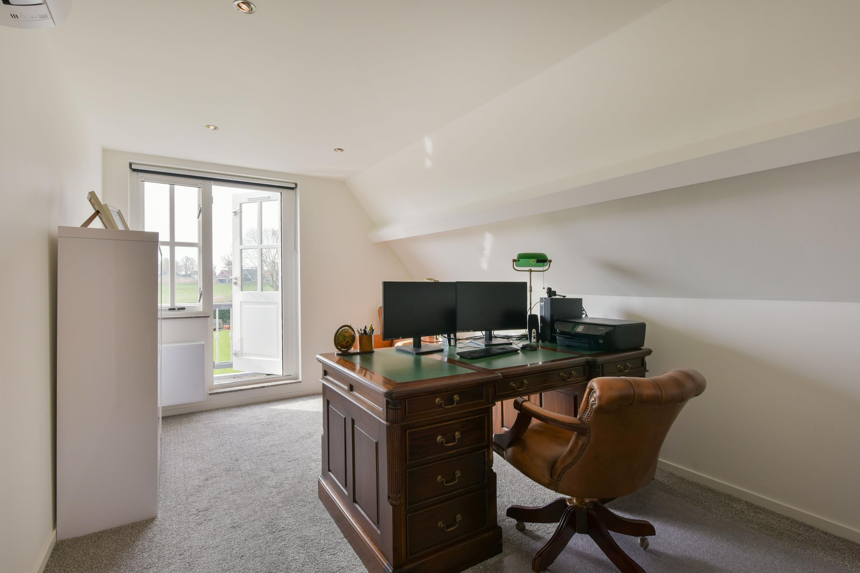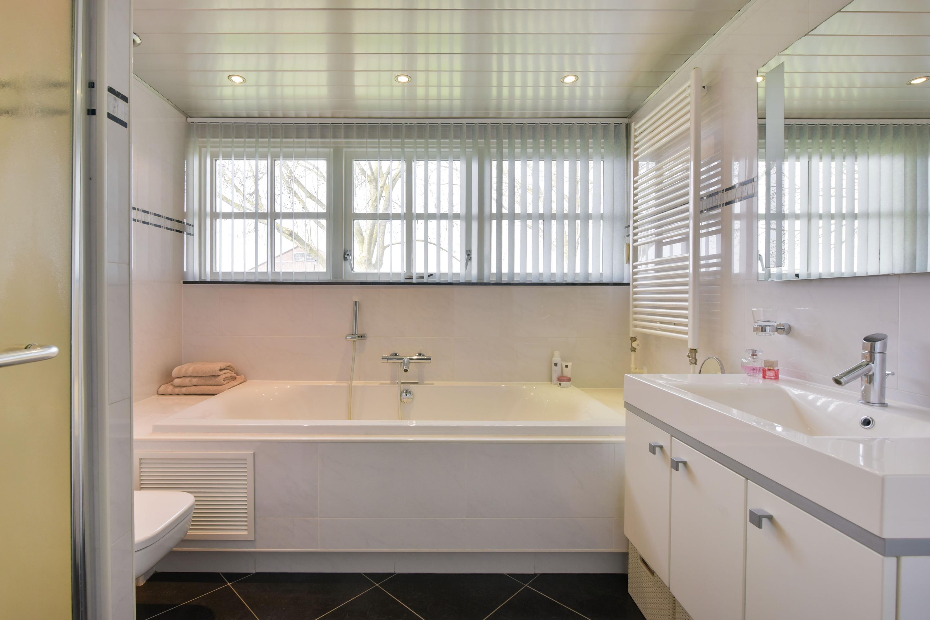 From the central hall, you also reach the multifunctional room, formerly the garage. This space is now fully integrated into the home and offers numerous possibilities, such as a home office, practice space, or additional living area. Here you will also find a modern bathroom (2022), equipped with double rain showers, a washbasin, toilet, and designer electric towel radiators. This makes having a bedroom on the ground floor entirely feasible.