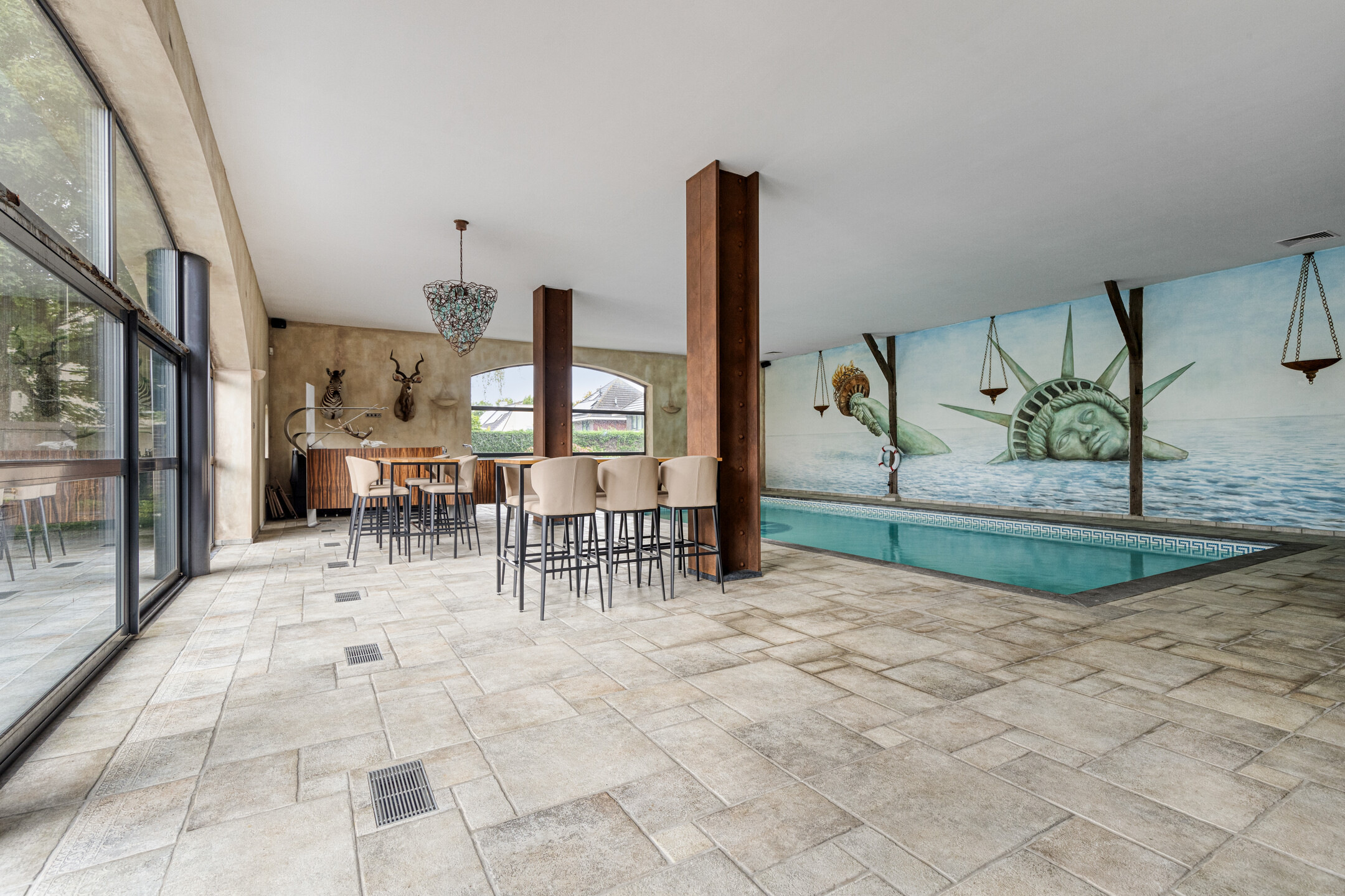 The interior unfolds in a sequence of generous spaces: a stately entrance, an elegant study, and an impressive living room en-suite with decorative ceilings, original fireplaces and stained glass doors. The kitchen, crafted by PoggenPohl and complemented by premium Gaggenau appliances and an AGA range, echoes both luxury and function. Four spacious bedrooms and two well-appointed bathrooms support a lifestyle of comfort and ease. The high-ceilinged annex is a dedicated wellness retreat, featuring a heated indoor pool, bar, sauna, relaxation area and fitness facilities, seamlessly extending into the tranquil, architect-designed garden.