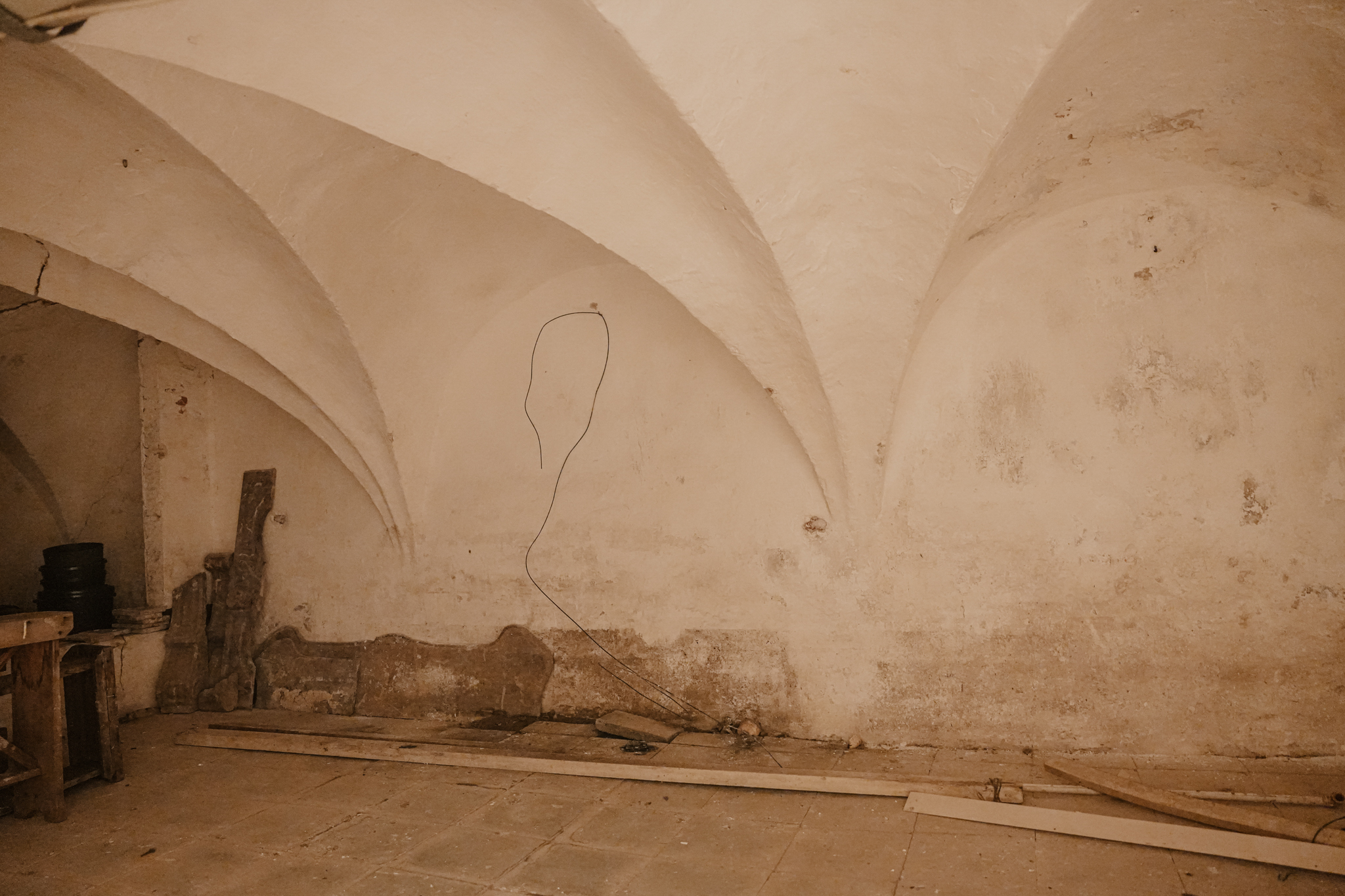 Adjoining the hallway are the cellar, utility room, and dining kitchen. A glass panel in the cellar floor reveals the historic water well below. The utility room occupies the former outdoor space of what was once the western house when the property consisted of two separate homes. The hallway retains the original 18th-century pump with a stone basin and brass taps. The dining kitchen is furnished with a classic kitchen unit featuring built-in appliances and a terrazzo countertop. From the kitchen, there is a pleasant view of the garden.