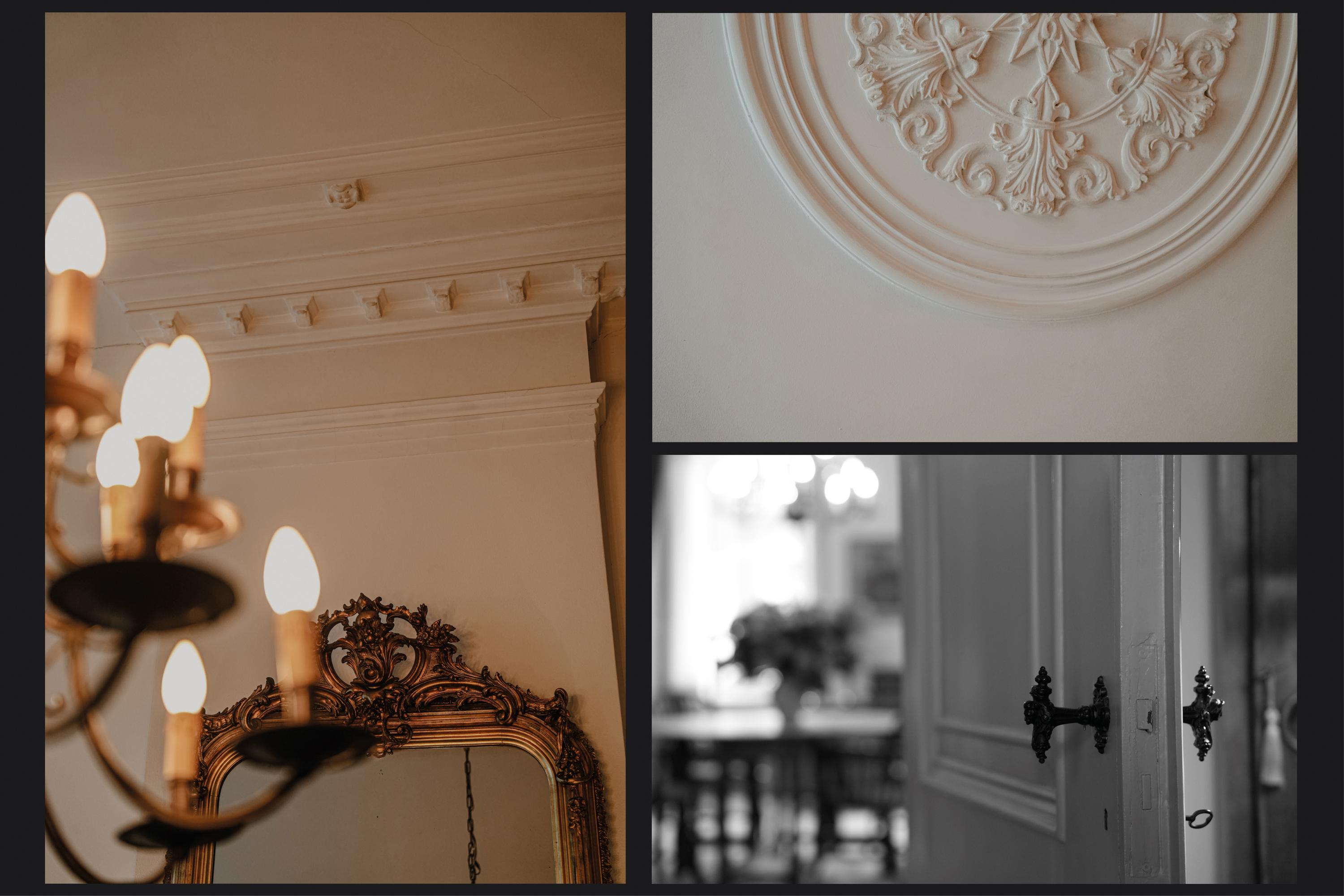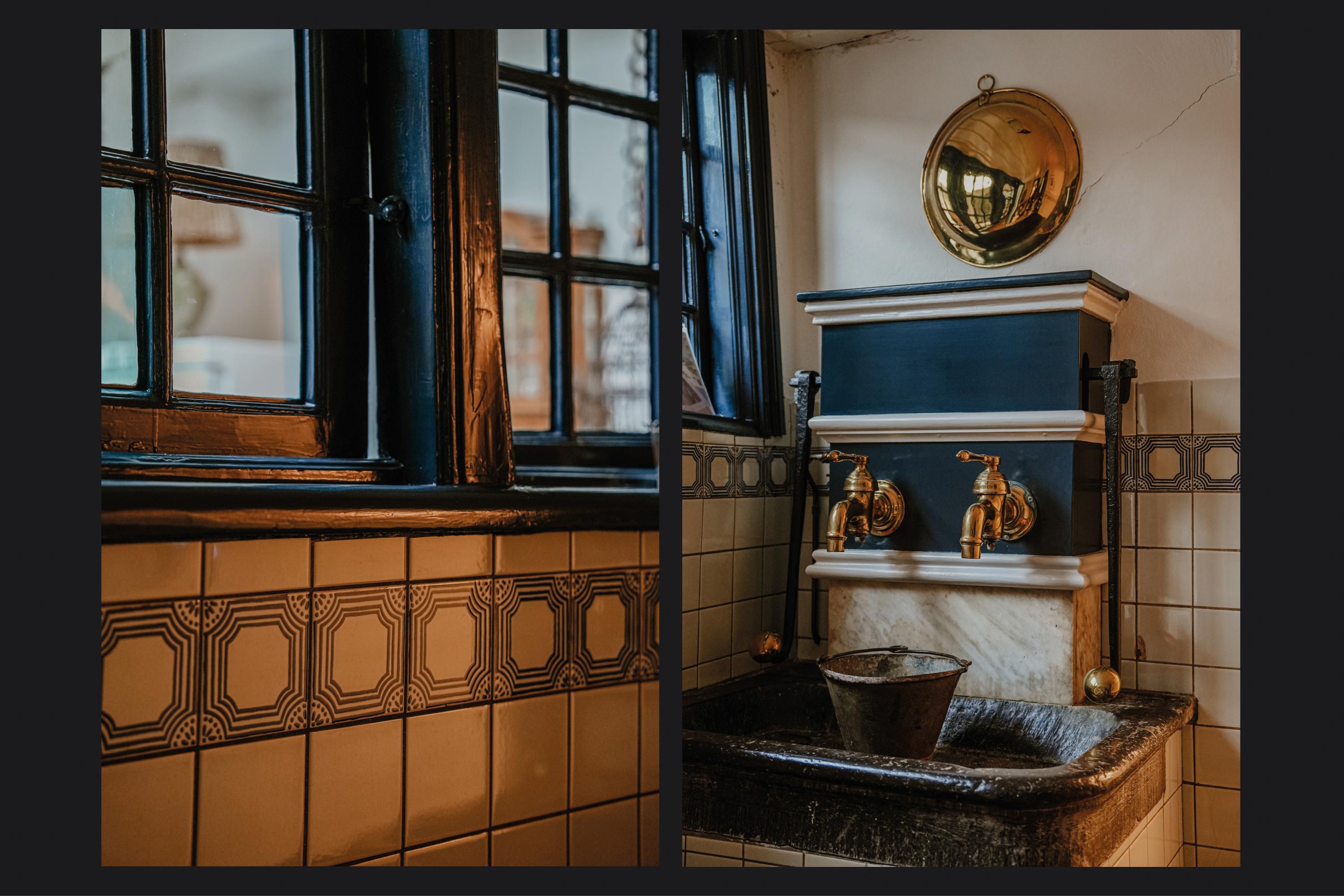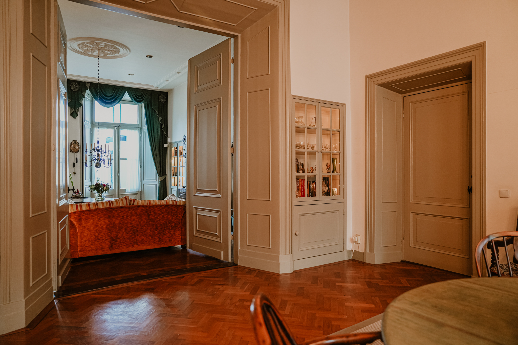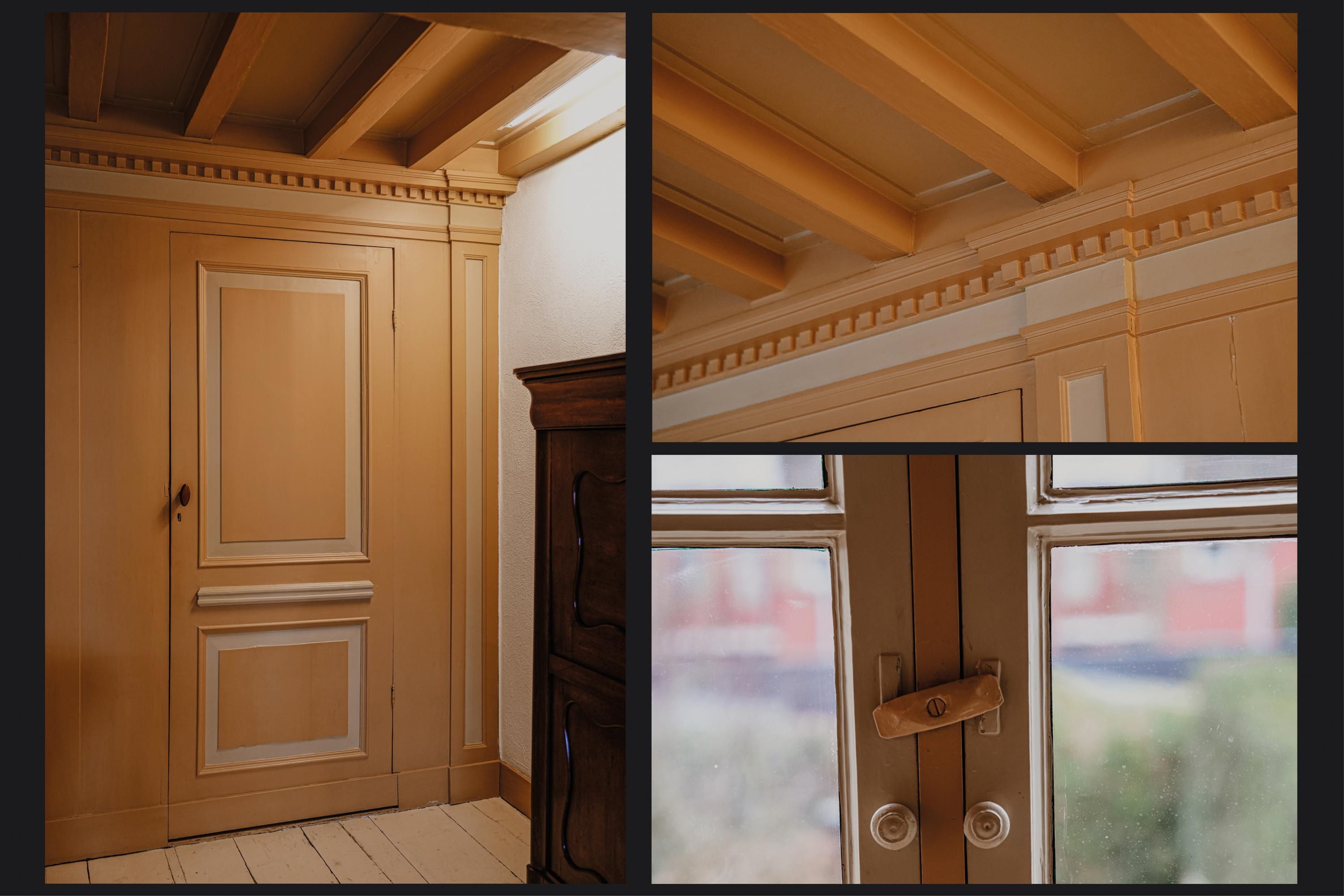 A double medieval vaulted cellar runs the full depth beneath the house, anchoring its story. The entrance hall, with marble floors continuing into a natural stone-paved hallway, sets the tone of grandeur. High stucco ceilings, stained glass, natural stone fireplaces, and herringbone parquet evoke a rare integrity. The ground floor unfolds with a 70 m² living room, French doors opening onto a secluded city garden, and a kitchen that looks towards the terrace and low hedges. Period details—such as window seats, shutters, and an 18th-century pump—provide a tactile sense of provenance.