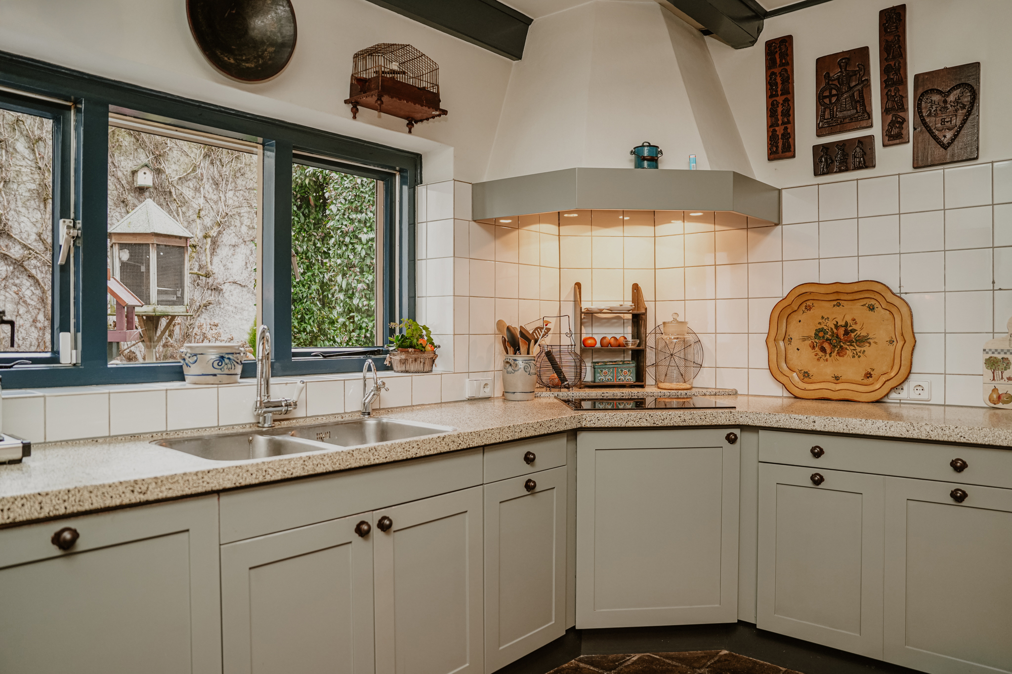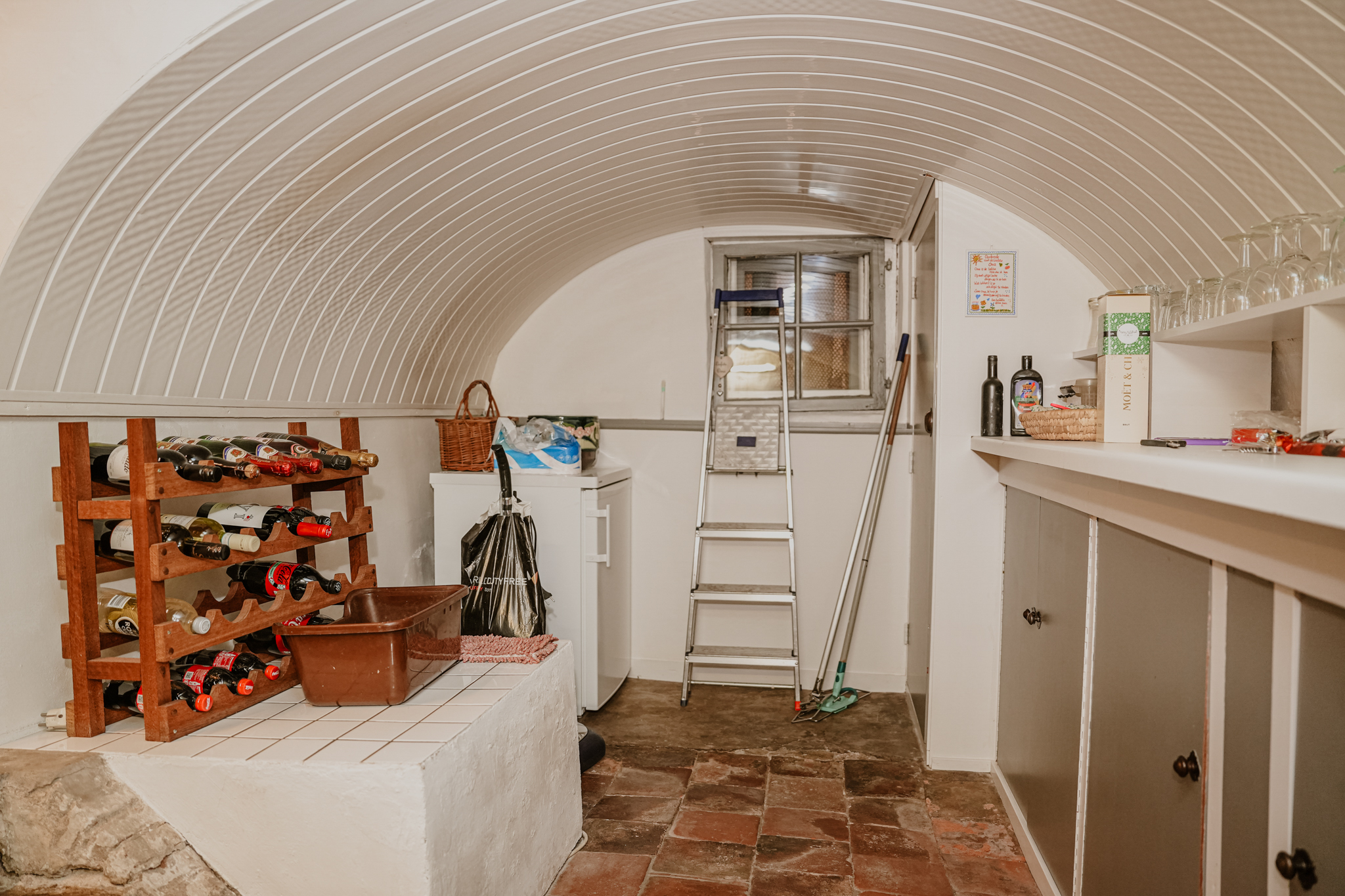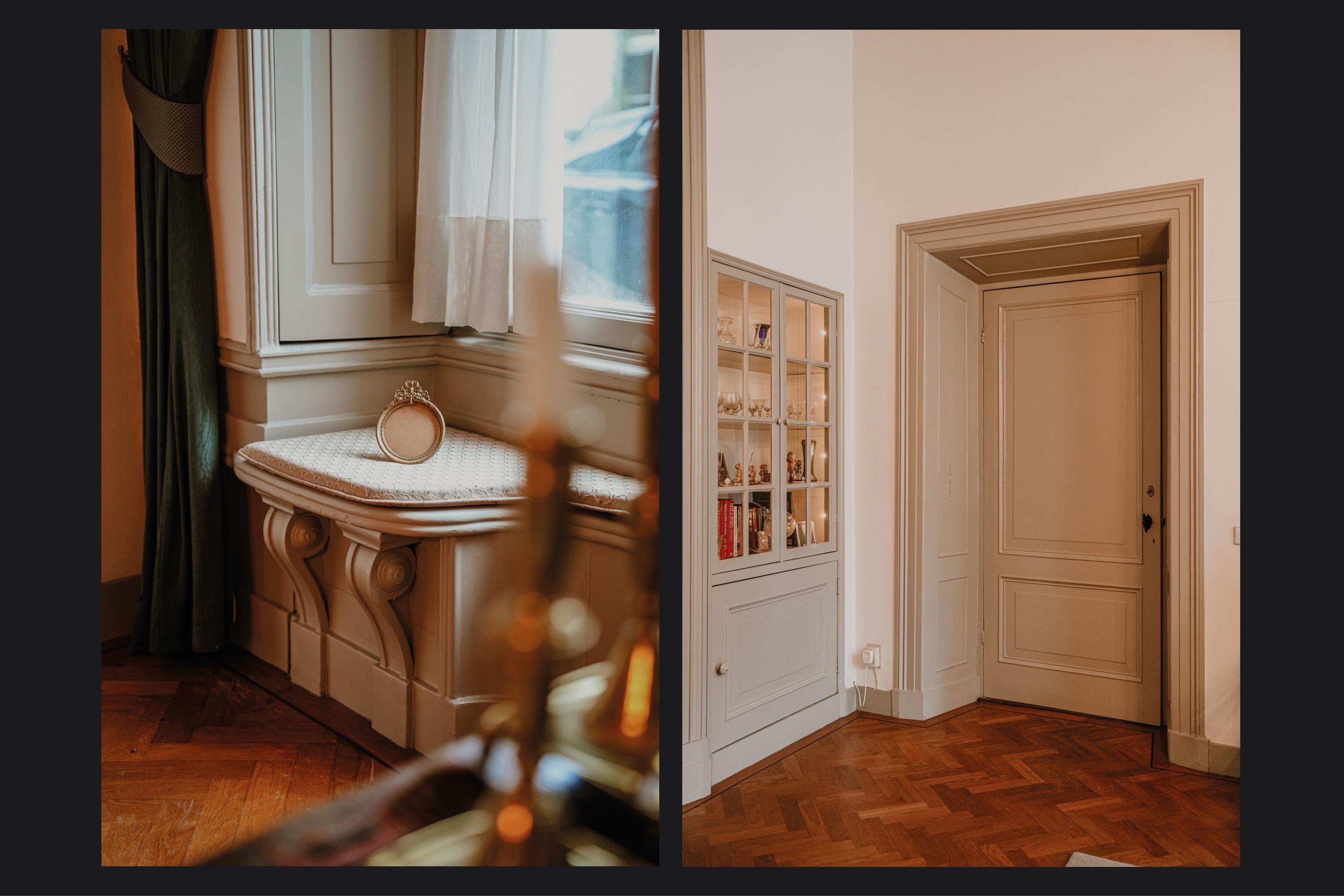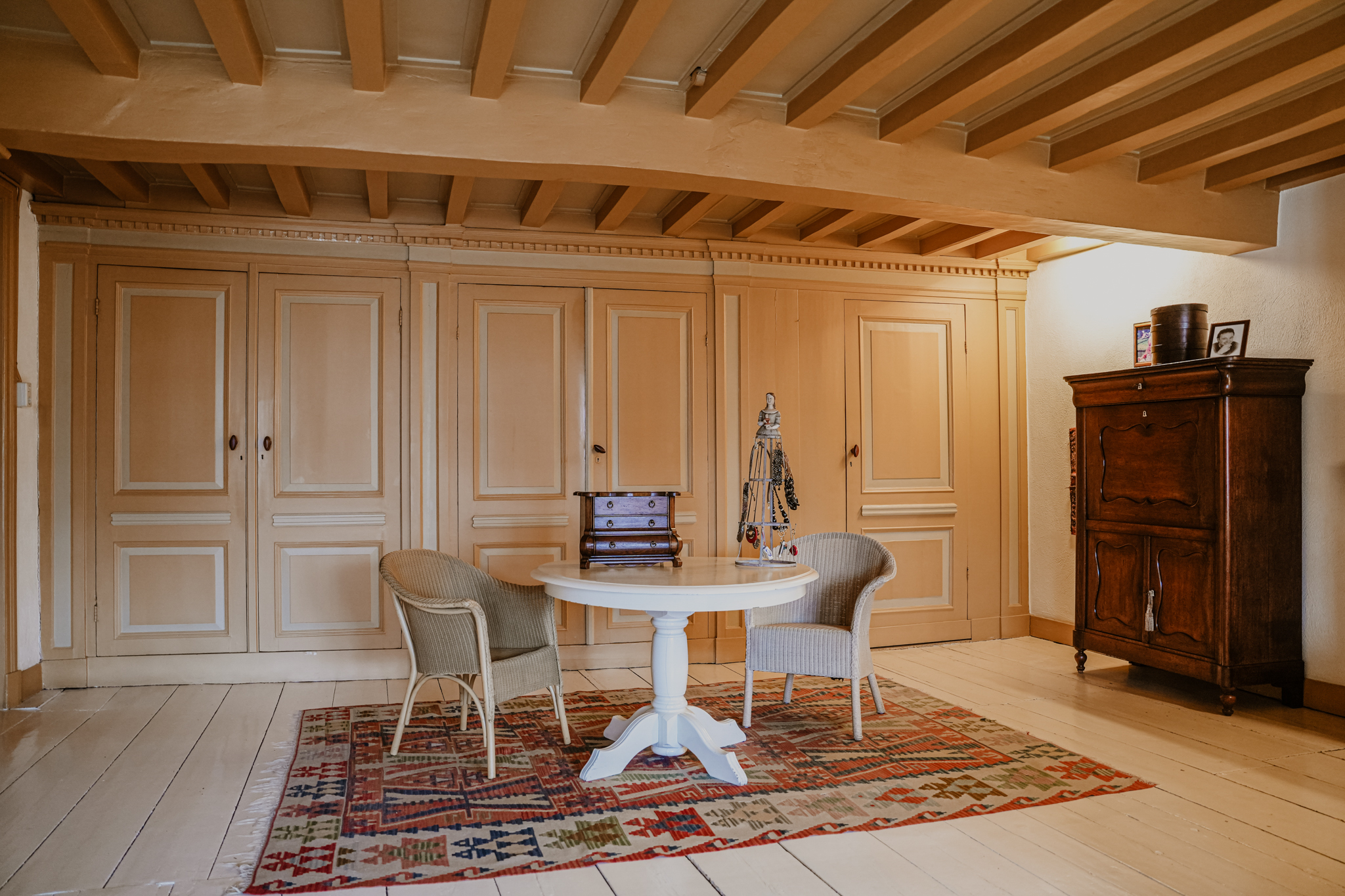 A double medieval vaulted cellar runs the full depth beneath the house, anchoring its story. The entrance hall, with marble floors continuing into a natural stone-paved hallway, sets the tone of grandeur. High stucco ceilings, stained glass, natural stone fireplaces, and herringbone parquet evoke a rare integrity. The ground floor unfolds with a 70 m² living room, French doors opening onto a secluded city garden, and a kitchen that looks towards the terrace and low hedges. Period details—such as window seats, shutters, and an 18th-century pump—provide a tactile sense of provenance.