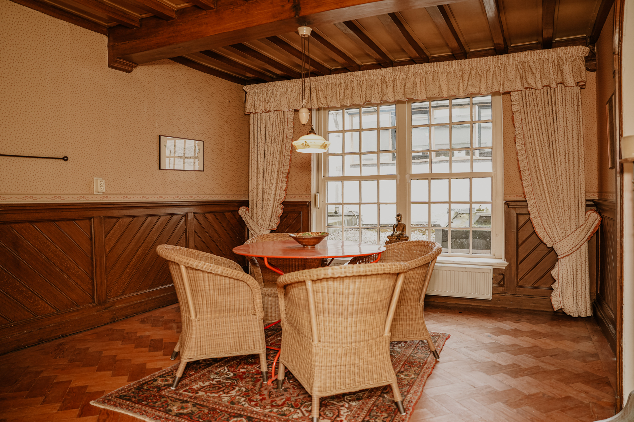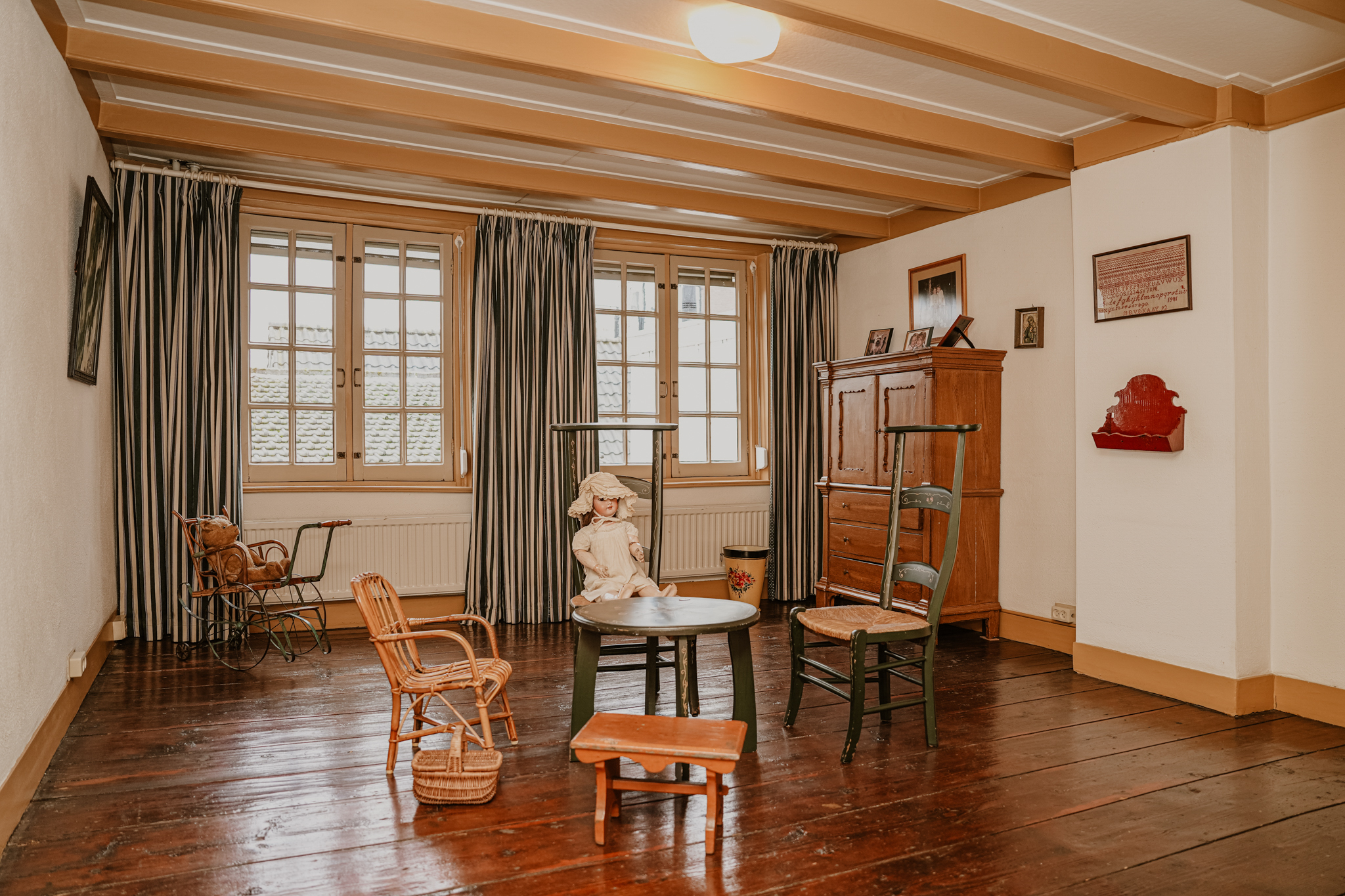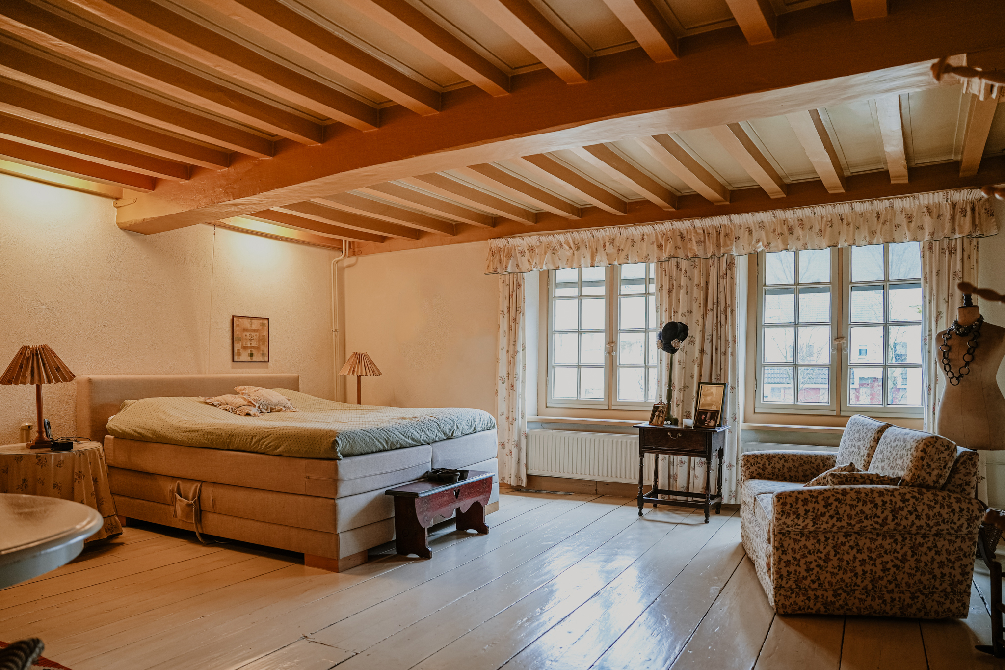 Upstairs, light streams through sash windows onto wide floorboards. Each of the seven bedrooms is defined by original beams or elegant paneling, while the attic and heated rooms offer further possibility. Modern comfort discreetly underscores the setting with air conditioning, natural ventilation, Intergas HRe heating, and the potential for open fires. The Monumentenwacht’s careful stewardship and a full restoration by the Dutch Heritage Agency ensure preservation resonates in every detail.