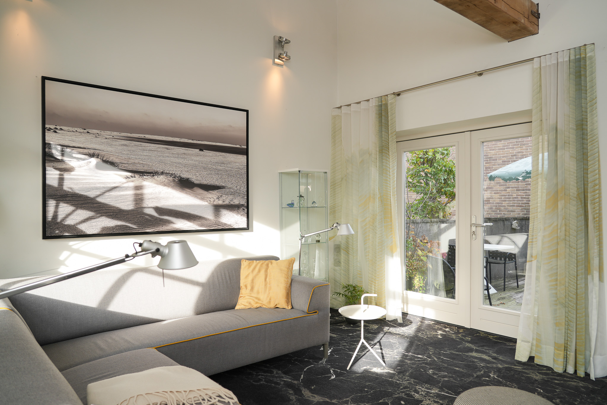 A separate entrance with traditional estriken floor tiles leads into the living room. This space can be easily combined with the studio, creating a multifunctional area of approx. 86 m². Thanks to the excellent acoustics, the studio is perfectly suited for yoga or Pilates sessions, training, an atelier or gallery.