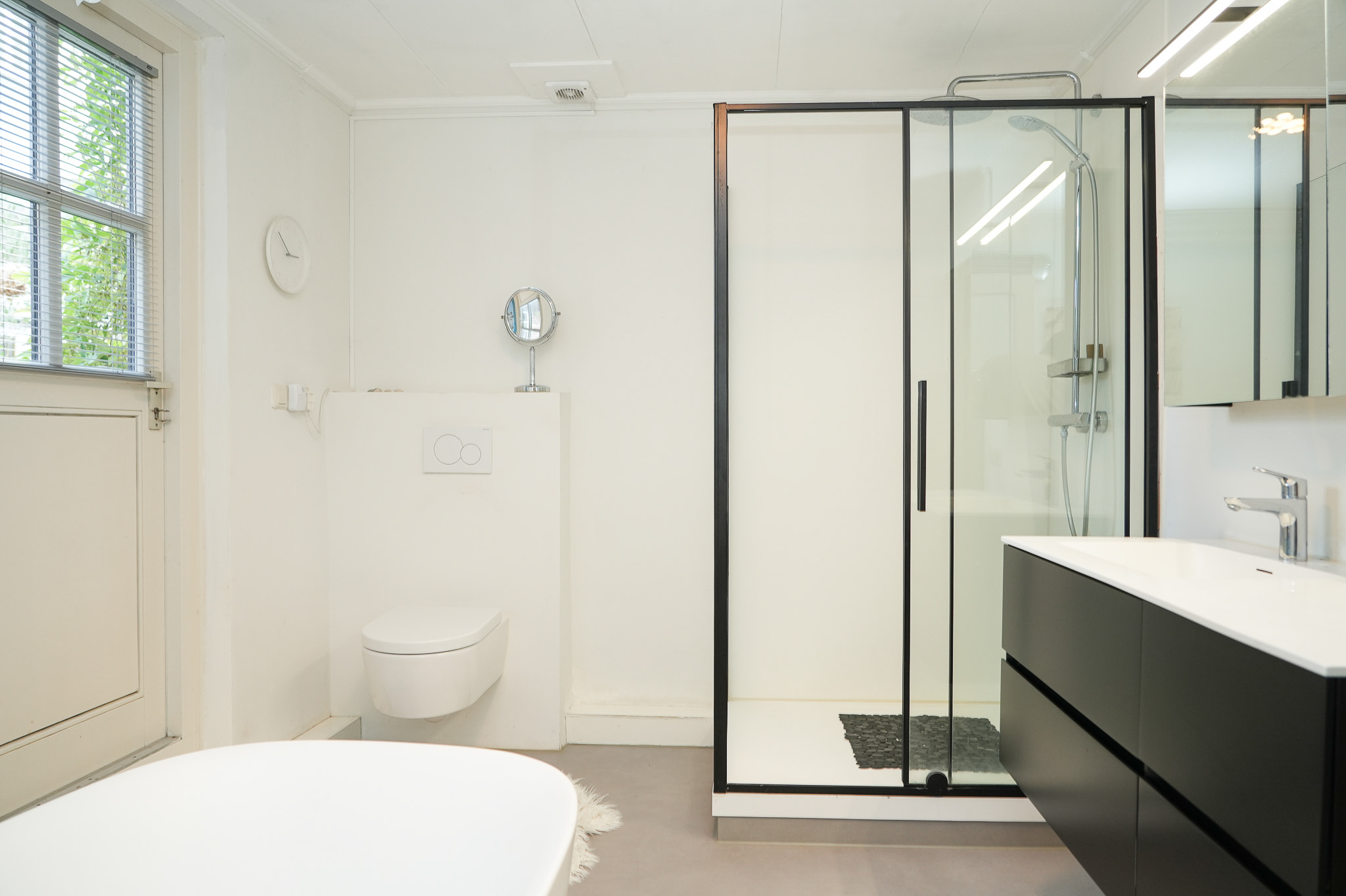 This level also offers a generous, sunny bedroom and a luxury bathroom (2020) with direct access to the roof terrace. The bathroom includes a freestanding bath, walk-in shower, vanity unit and toilet.