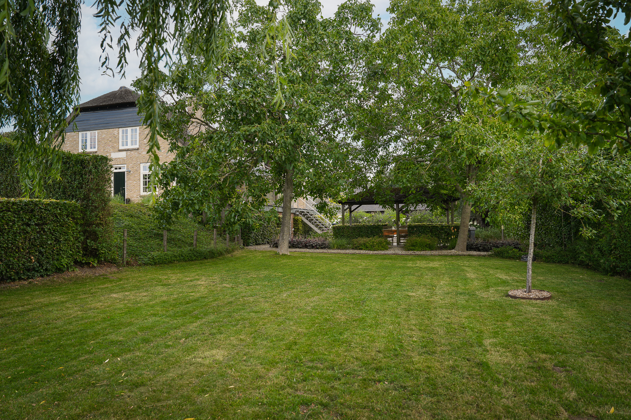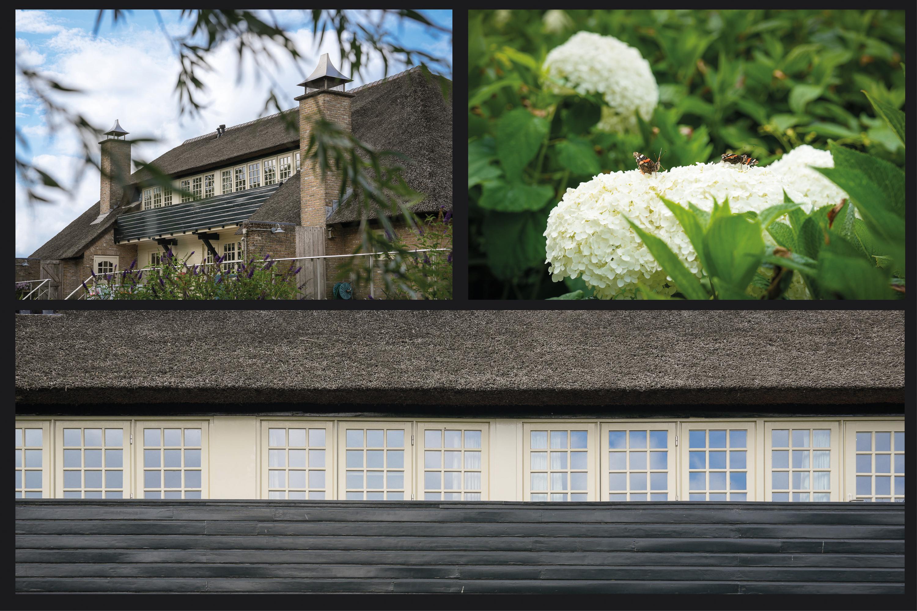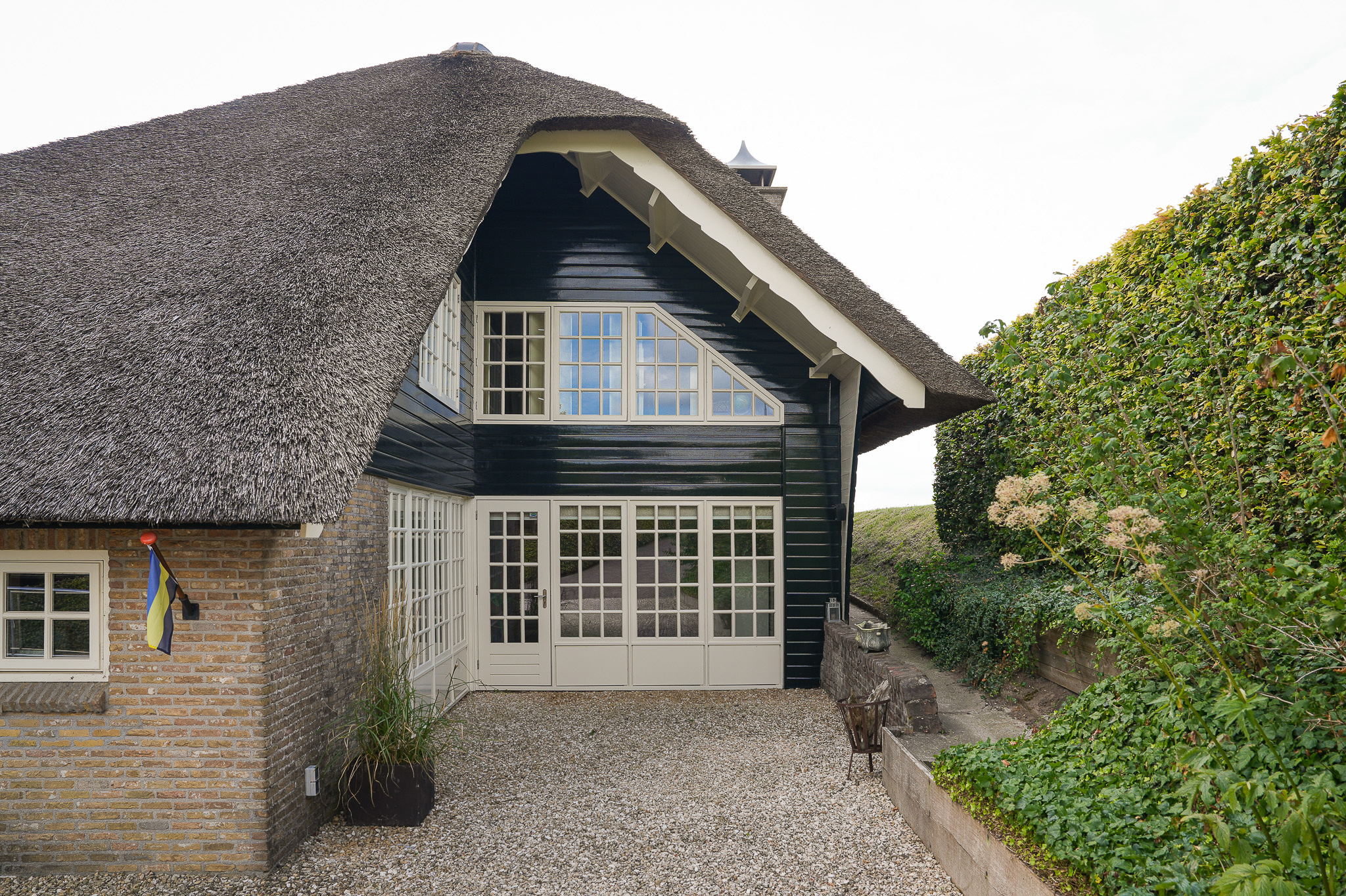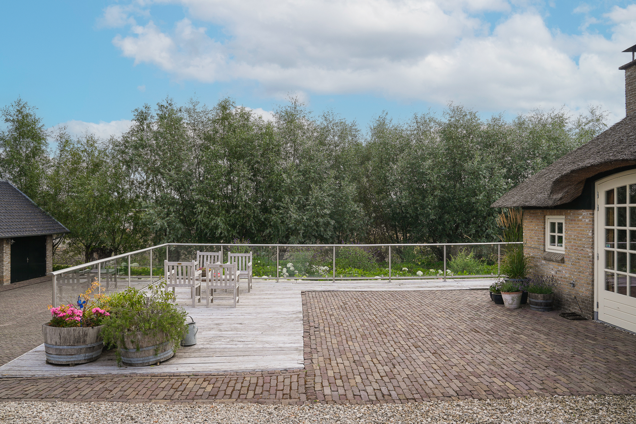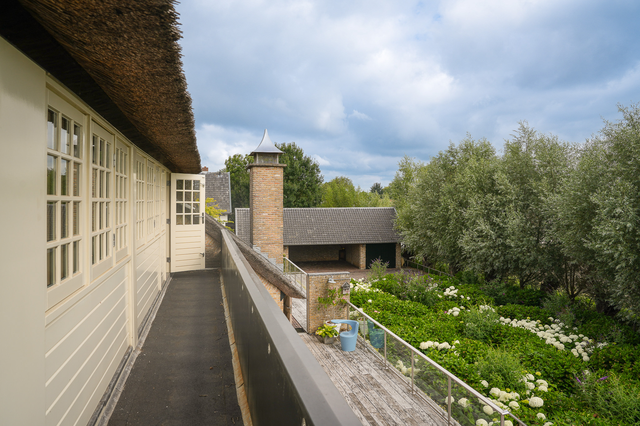 To the left of the driveway stands a solid outbuilding with a tiled roof, including a double carport, garage, and storage for motorcycles and bicycles. The garden has been landscaped for easy maintenance, with large hardwood terraces, transparent stainless-steel balustrades, decorative hydrangea borders, and a lawn with mature planting. The sloping bank along the dike is planted with, among others, periwinkle and barren strawberry.