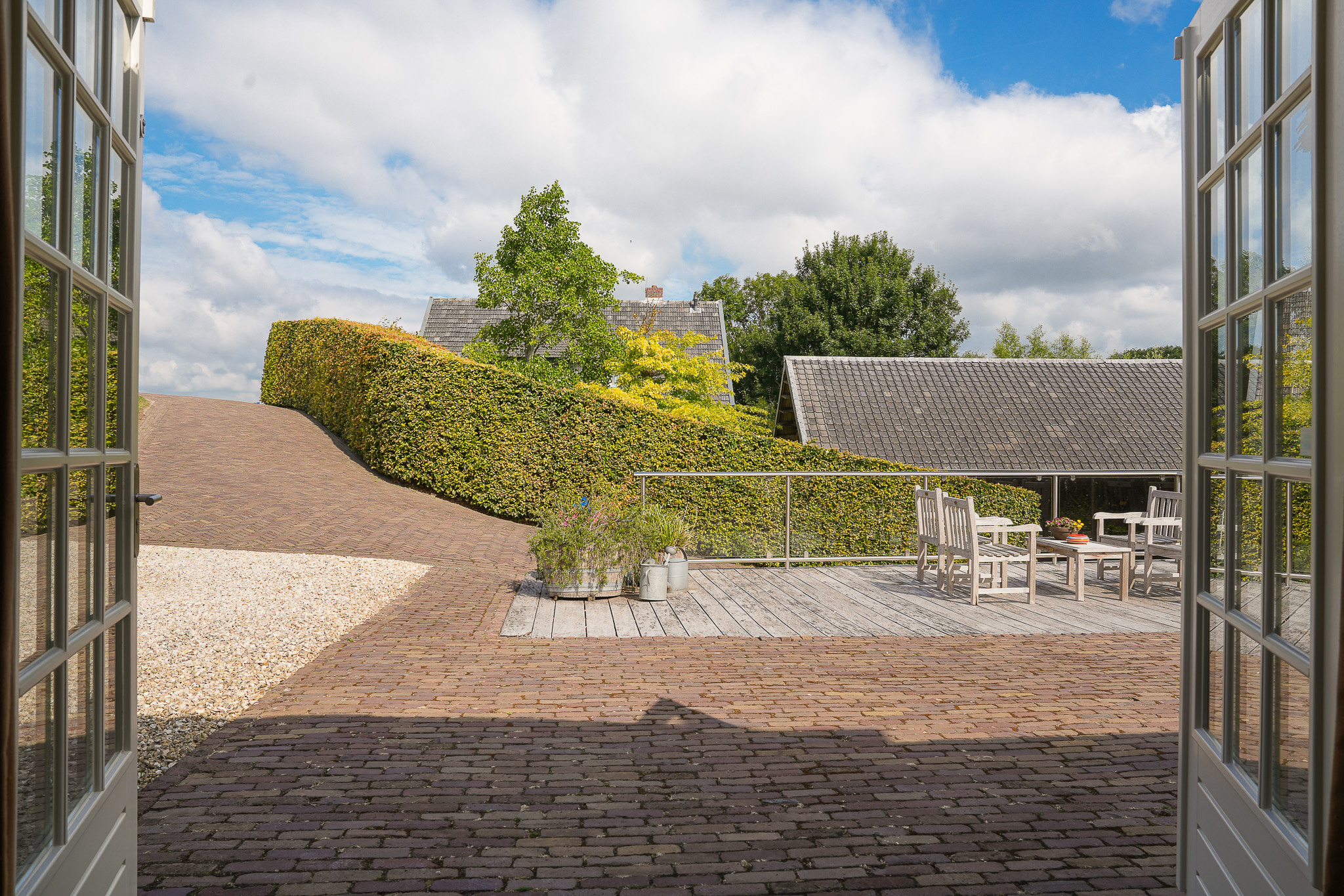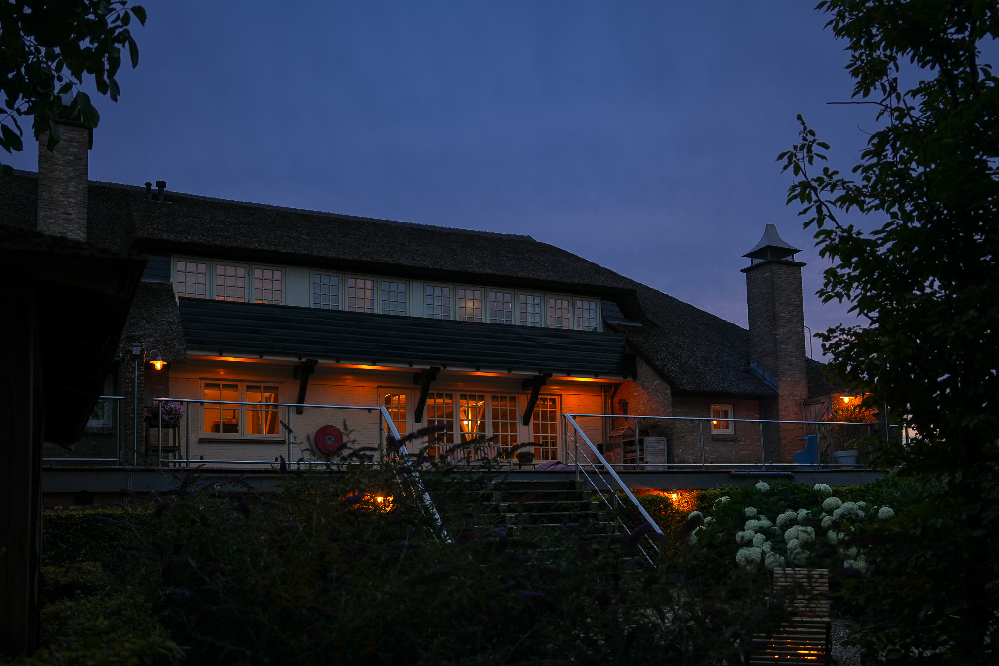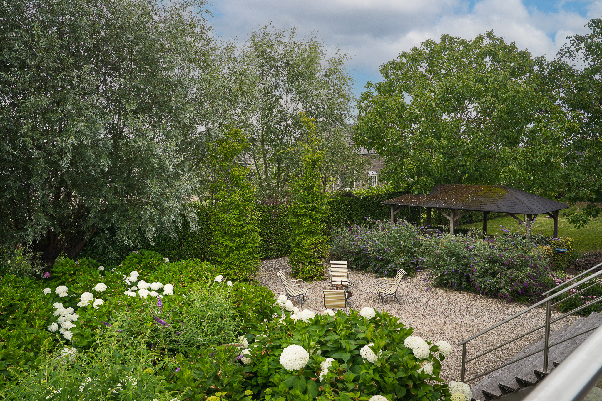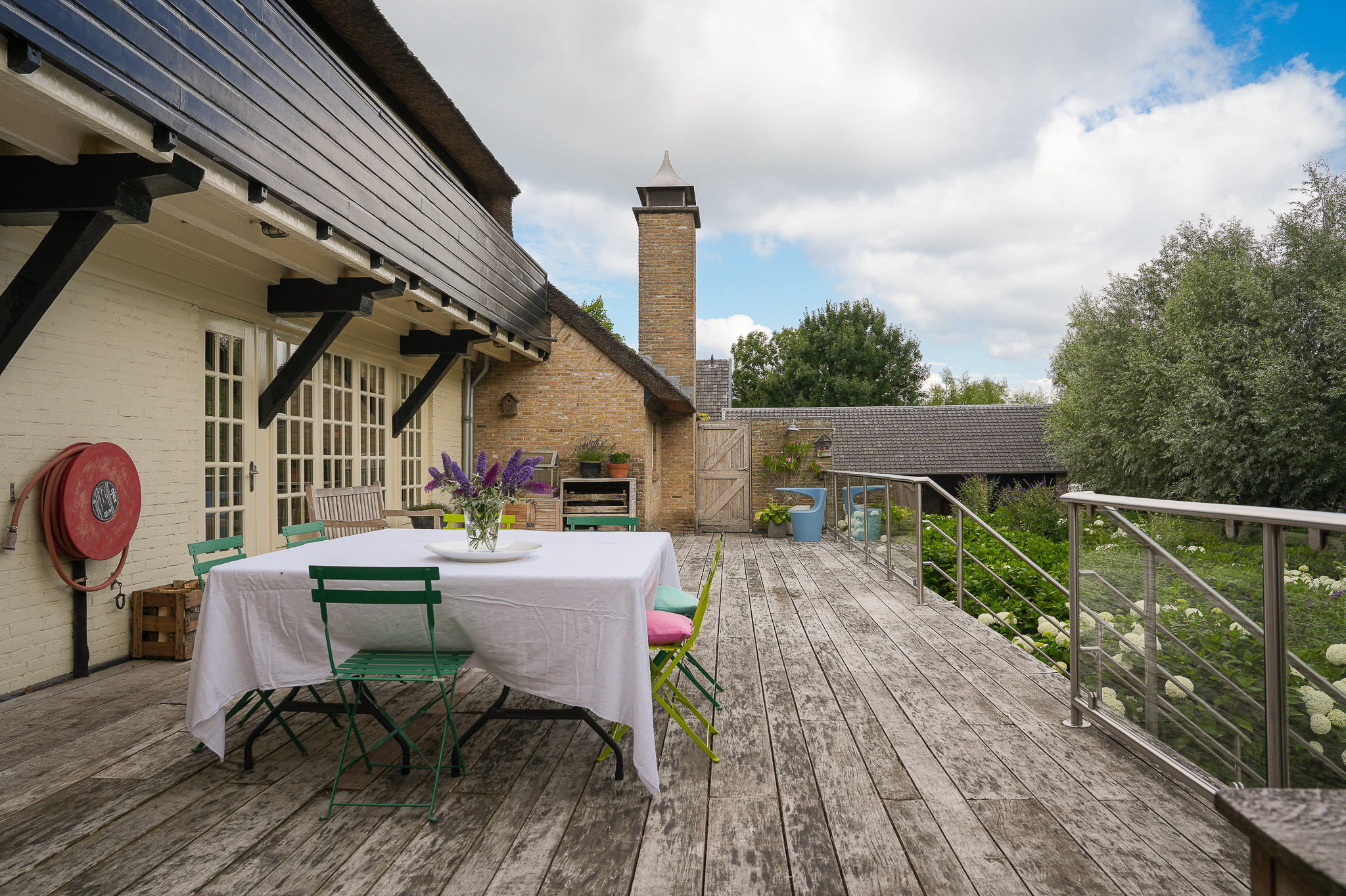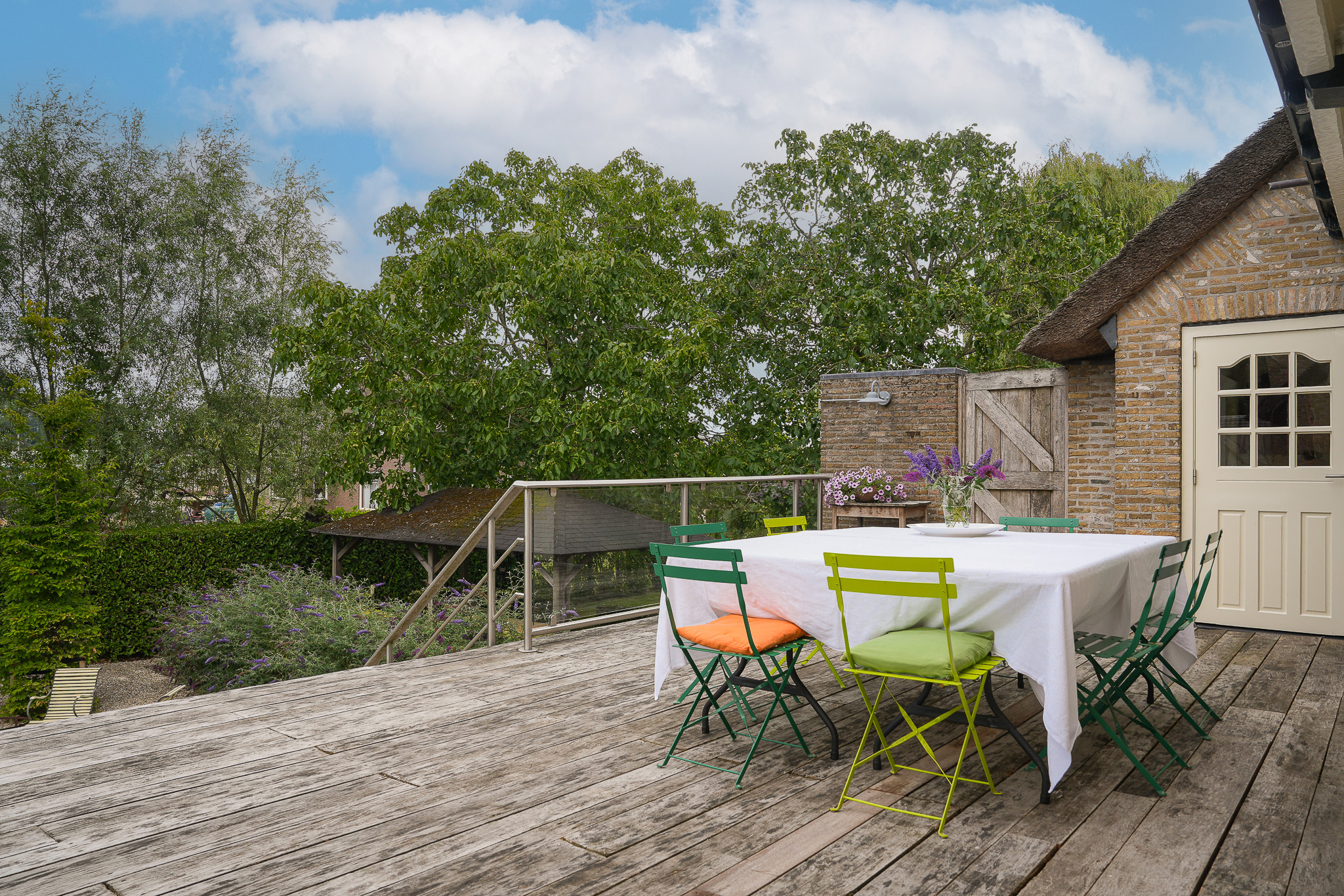 To the left of the driveway stands a solid outbuilding with a tiled roof, including a double carport, garage, and storage for motorcycles and bicycles. The garden has been landscaped for easy maintenance, with large hardwood terraces, transparent stainless-steel balustrades, decorative hydrangea borders, and a lawn with mature planting. The sloping bank along the dike is planted with, among others, periwinkle and barren strawberry.